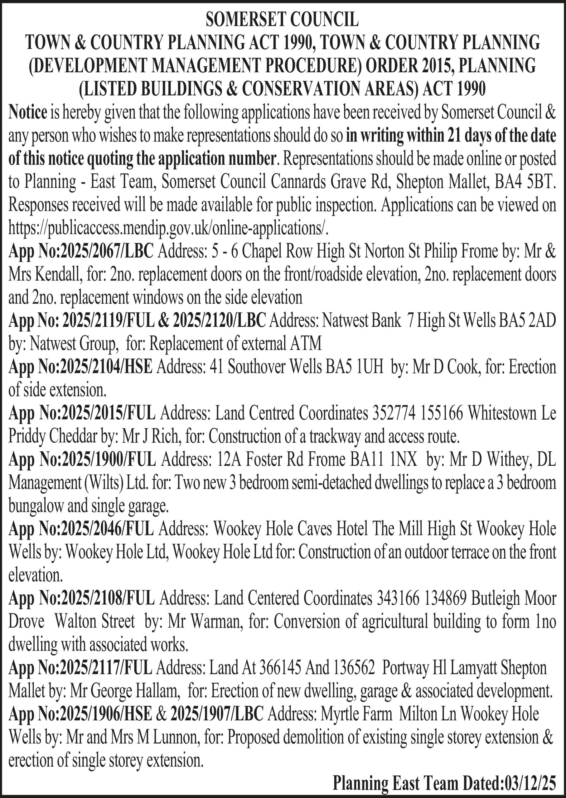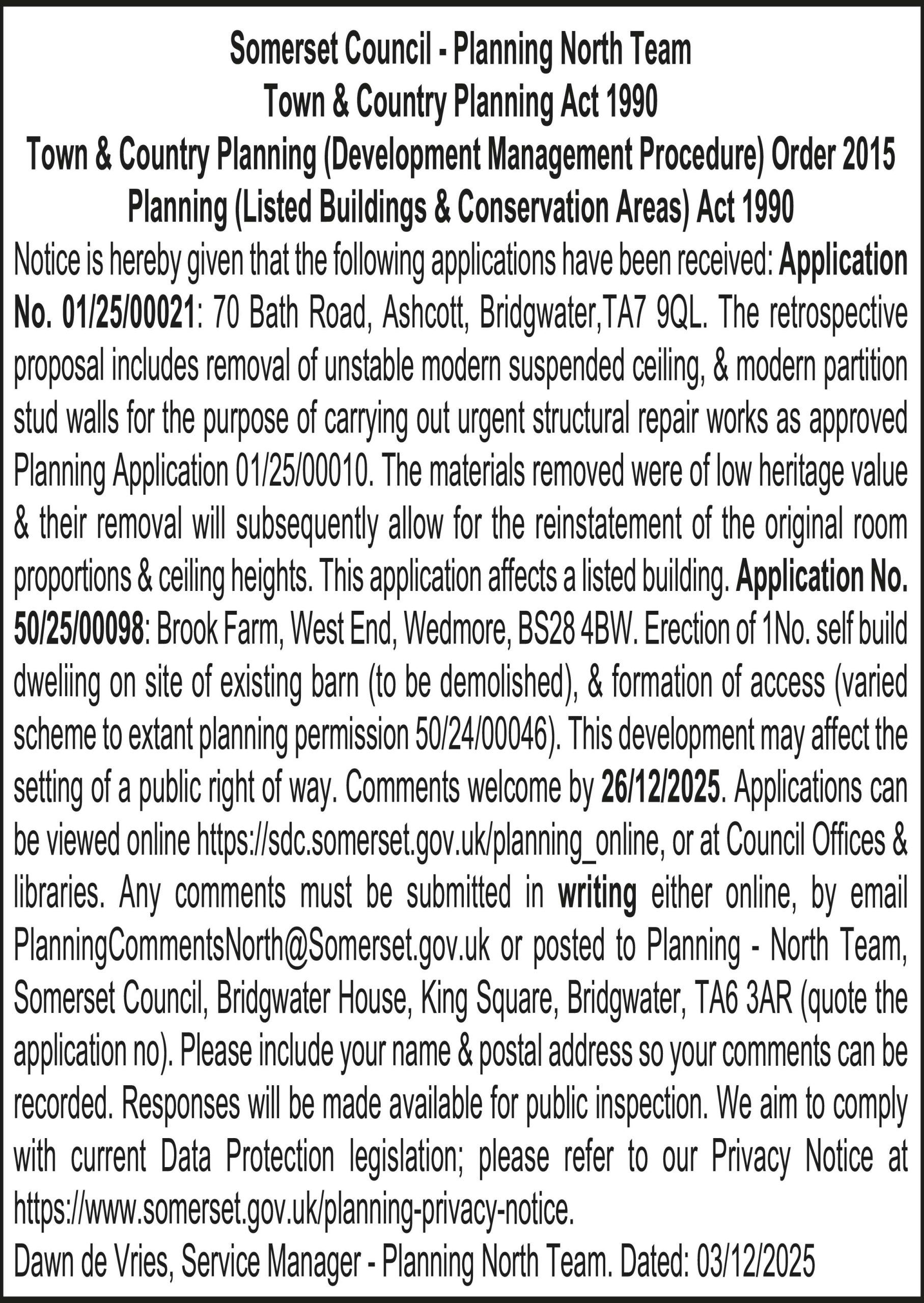 Notice is hereby given that the following applications have been received: Application No. 01/25/00021: 70 Bath Road, Ashcott, Bridgwater,TA7 9QL. The retrospective proposal includes removal of unstable modern suspended ceiling, & modern partition stud walls for the purpose of carrying out urgent structural repair works as approved Planning Application 01/25/00010. The materials removed were of low heritage value & their removal will subsequently allow for the reinstatement of the original room proportions & ceiling heights. This application affects a listed building. Application No. 50/25/00098: Brook Farm, West End, Wedmore, BS28 4BW. Erection of 1No. self build dweliing on site of existing barn (to be demolished), & formation of access (varied scheme to extant planning permission 50/24/00046). This development may affect the setting of a public right of way. Comments welcome by 26/12/2025. Applications can be viewed online https://sdc.somerset.gov.uk/planning_online, or at Council Offices & libraries. Any comments must be submitted in writing either online, by email PlanningCommentsNorth@Somerset.gov.uk or posted to Planning – North Team, Somerset Council, Bridgwater House, King Square, Bridgwater, TA6 3AR (quote the application no). Please include your name & postal address so your comments can be recorded. Responses will be made available for public inspection. We aim to comply with current Data Protection legislation; please refer to our Privacy Notice at https://www.somerset.gov.uk/planning-privacy-notice.