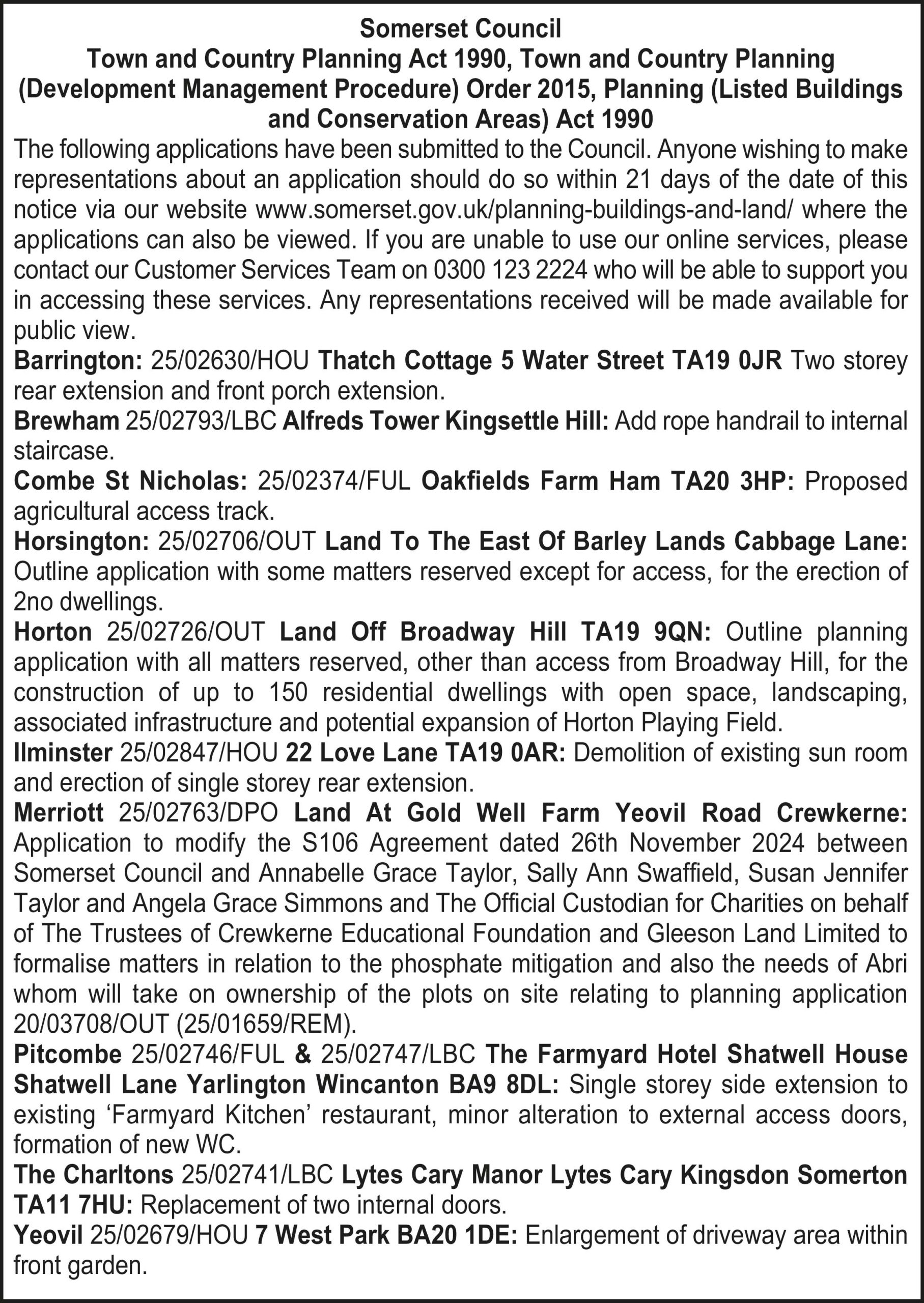 The following applications have been submitted to the Council. Anyone wishing to make representations about an application should do so within 21 days of the date of this notice via our website www.somerset.gov.uk/planning-buildings-and-land/ where the applications can also be viewed. If you are unable to use our online services, please contact our Customer Services Team on 0300 123 2224 who will be able to support you in accessing these services. Any representations received will be made available for public view.