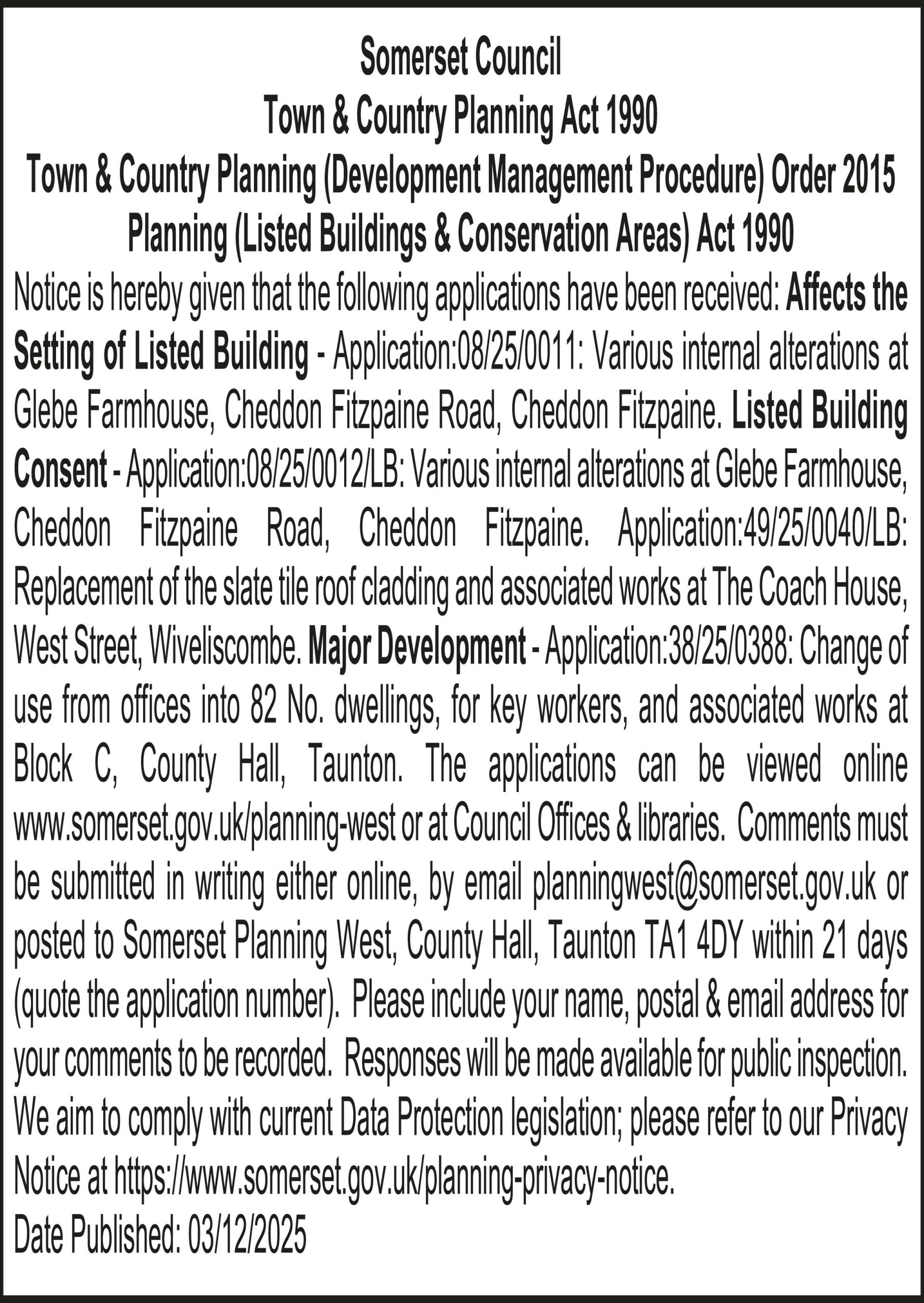 Notice is hereby given that the following applications have been received: Affects the Setting of Listed Building – Application:08/25/0011: Various internal alterations at Glebe Farmhouse, Cheddon Fitzpaine Road, Cheddon Fitzpaine. Listed Building Consent – Application: 08/25/0012/LB: Various internal alterations at Glebe Farmhouse, Cheddon Fitzpaine Road, Cheddon Fitzpaine. Application:49/25/0040/LB: Replacement of the slate tile roof cladding and associated works at The Coach House, West Street, Wiveliscombe. Major Development – Application:38/25/0388: Change of use from offices into 82 No. dwellings, for key workers, and associated works at Block C, County Hall, Taunton. The applications can be viewed online www.somerset.gov.uk/planning-west or at Council Offices & libraries. Comments must be submitted in writing either online, by email planningwest@somerset.gov.uk or posted to Somerset Planning West, County Hall, Taunton TA1 4DY within 21 days (quote the application number). Please include your name, postal & email address for your comments to be recorded. Responses will be made available for public inspection. We aim to comply with current Data Protection legislation; please refer to our Privacy Notice at https://www.somerset.gov.uk/planning-privacy-notice.