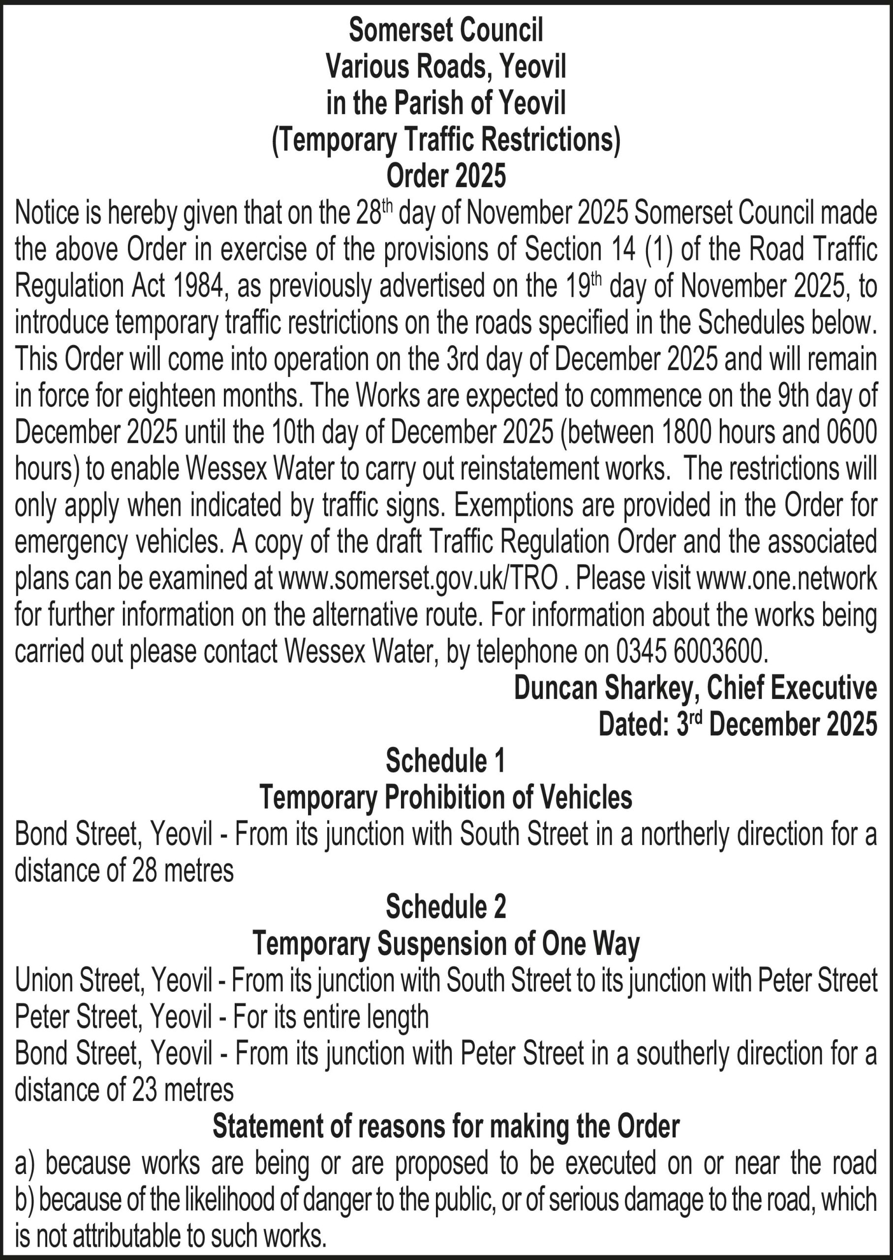 Notice is hereby given that on the 28th day of November 2025 Somerset Council made the above Order in exercise of the provisions of Section 14 (1) of the Road Traffic Regulation Act 1984, as previously advertised on the 19th day of November 2025, to introduce temporary traffic restrictions on the roads specified in the Schedules below.