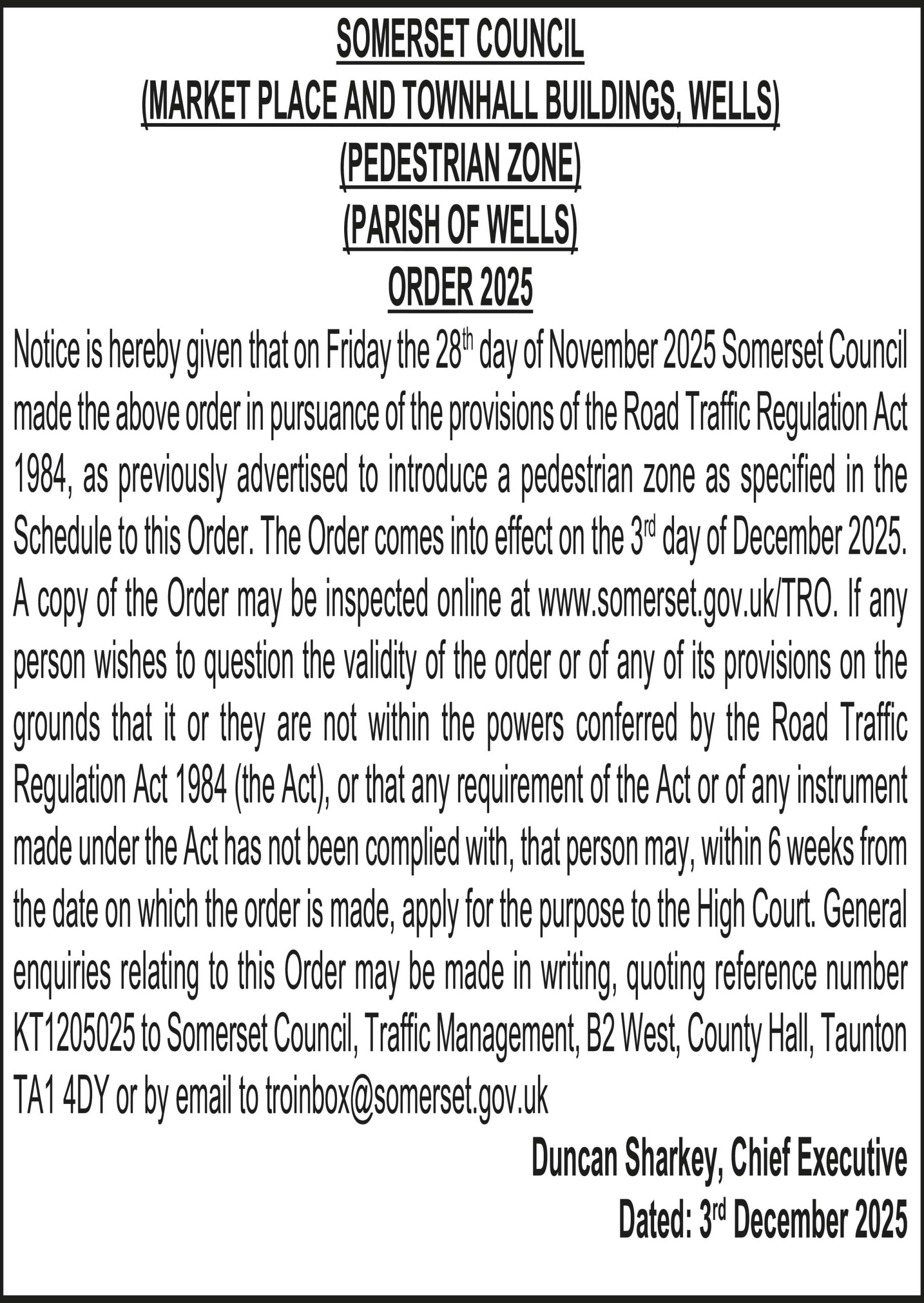 Notice is hereby given that on Friday the 28th day of November 2025 Somerset Council made the above order in pursuance of the provisions of the Road Traffic Regulation Act 1984, as previously advertised to introduce a pedestrian zone as specified in the Schedule to this Order. The Order comes into effect on the 3rd day of December 2025.