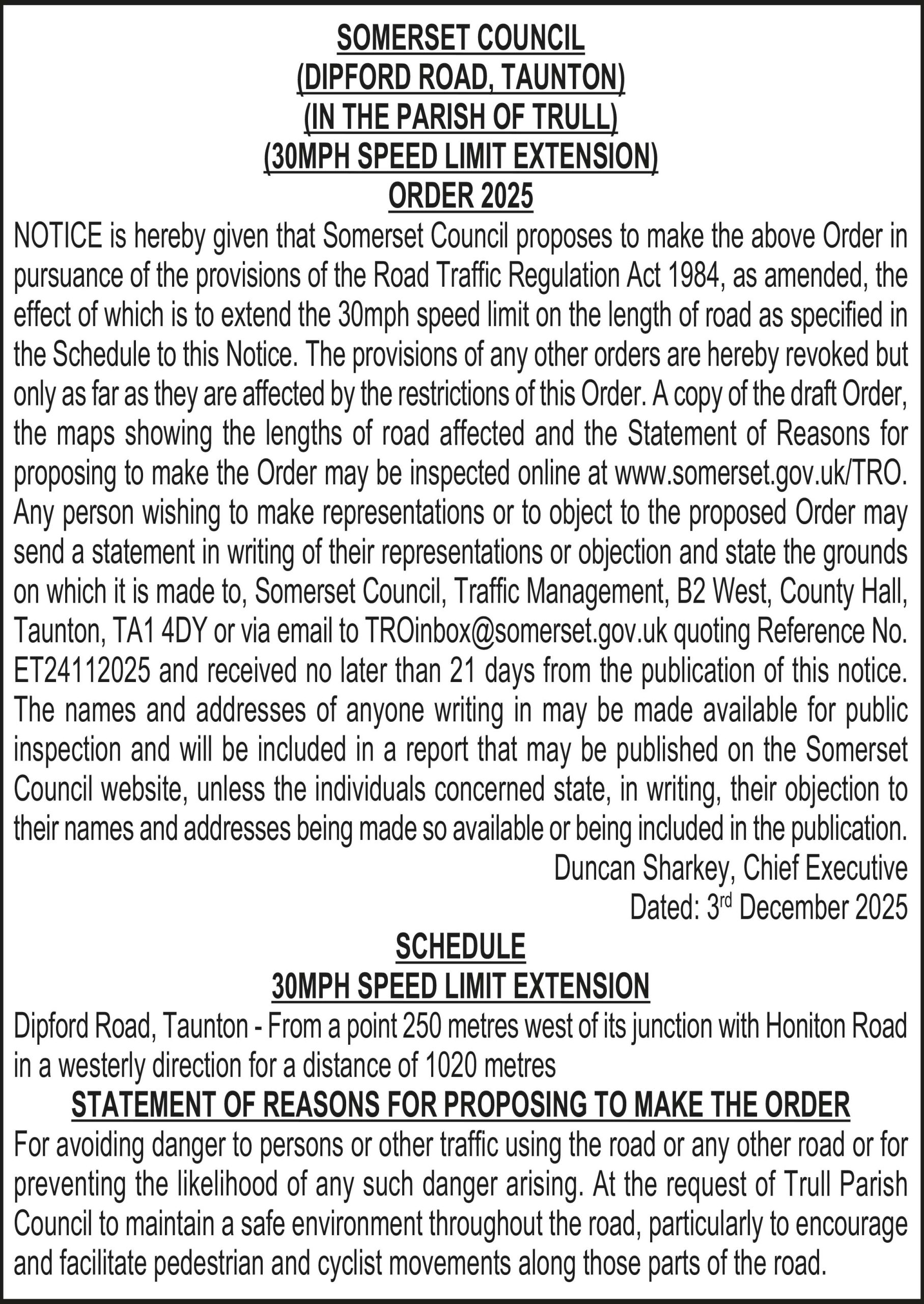 Any person wishing to make representations or to object to the proposed Order may send a statement in writing of their representations or objection and state the grounds on which it is made to, Somerset Council, Traffic Management, B2 West, County Hall, Taunton, TA1 4DY or via email to TROinbox@somerset.gov.uk quoting Reference No. ET24112025 and received no later than 21 days from the publication of this notice.