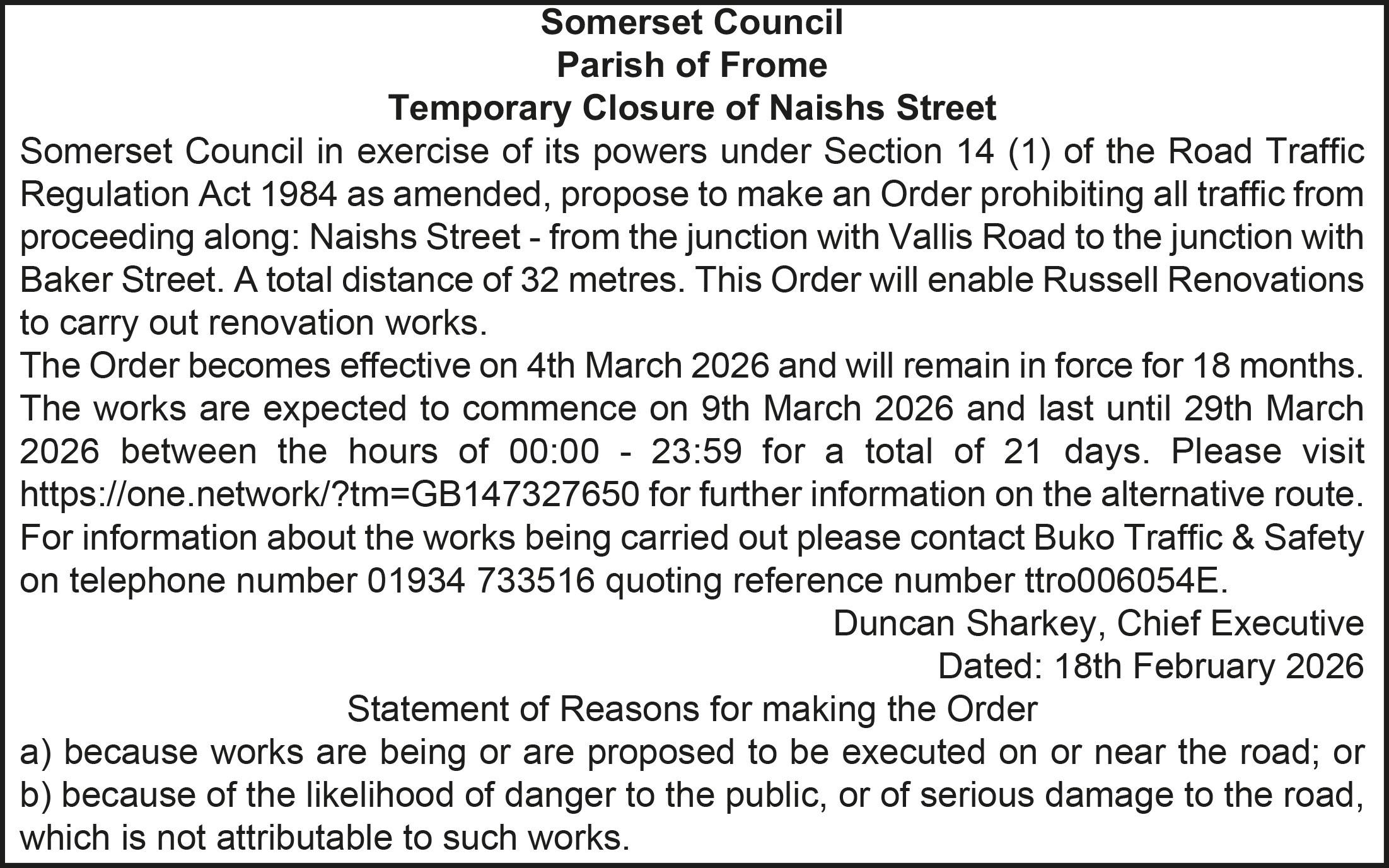 Somerset Council in exercise of its powers under Section 14 (1) of the Road Traffic Regulation Act 1984 as amended, propose to make an Order prohibiting all traffic from proceeding along: Naishs Street – from the junction with Vallis Road to the junction with Baker Street. A total distance of 32 metres. This Order will enable Russell Renovations to carry out renovation works.
