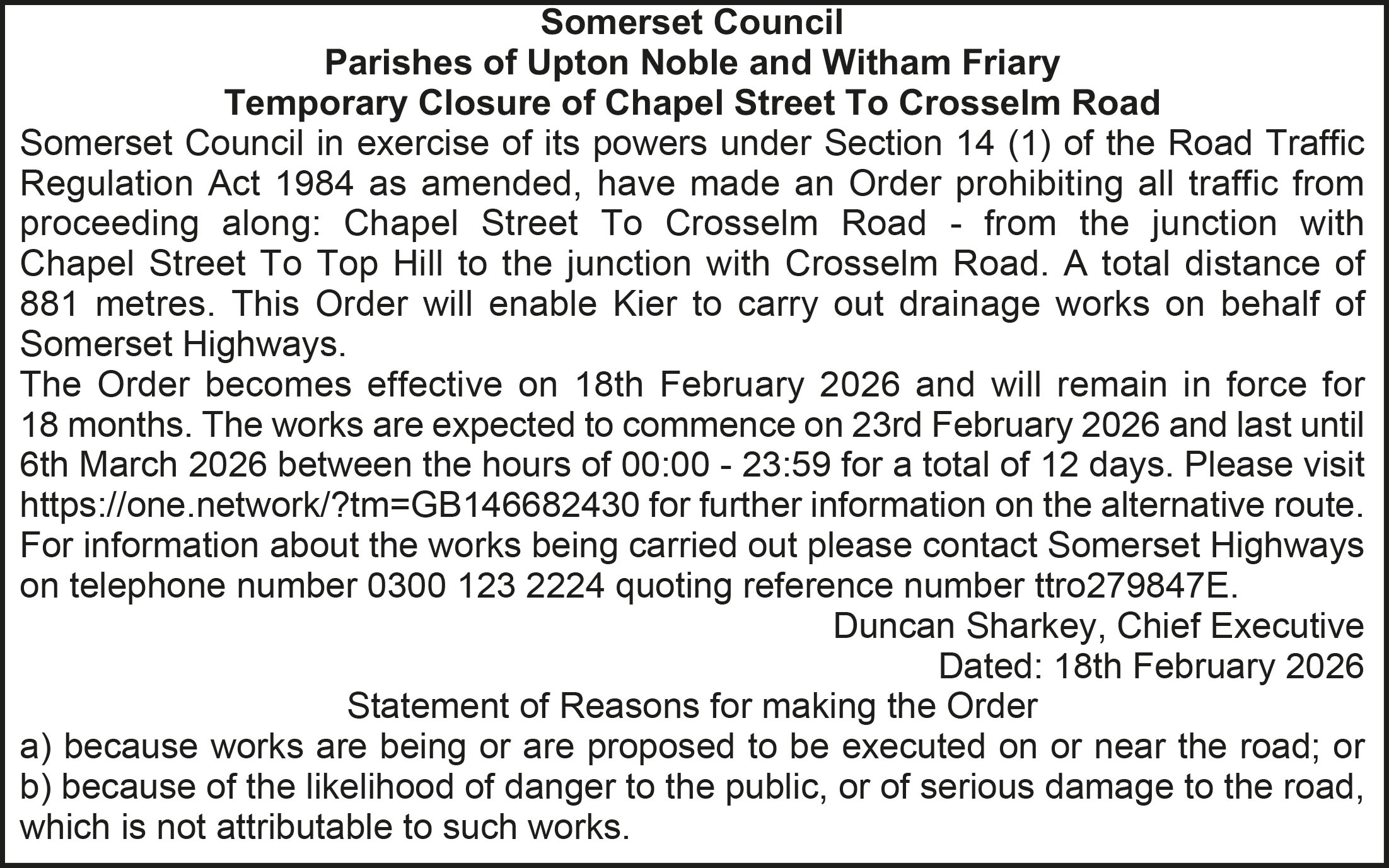 Somerset Council in exercise of its powers under Section 14 (1) of the Road Traffic Regulation Act 1984 as amended, have made an Order prohibiting all traffic from proceeding along: Chapel Street To Crosselm Road – from the junction with Chapel Street To Top Hill to the junction with Crosselm Road. A total distance of 881 metres. This Order will enable Kier to carry out drainage works on behalf of Somerset Highways.