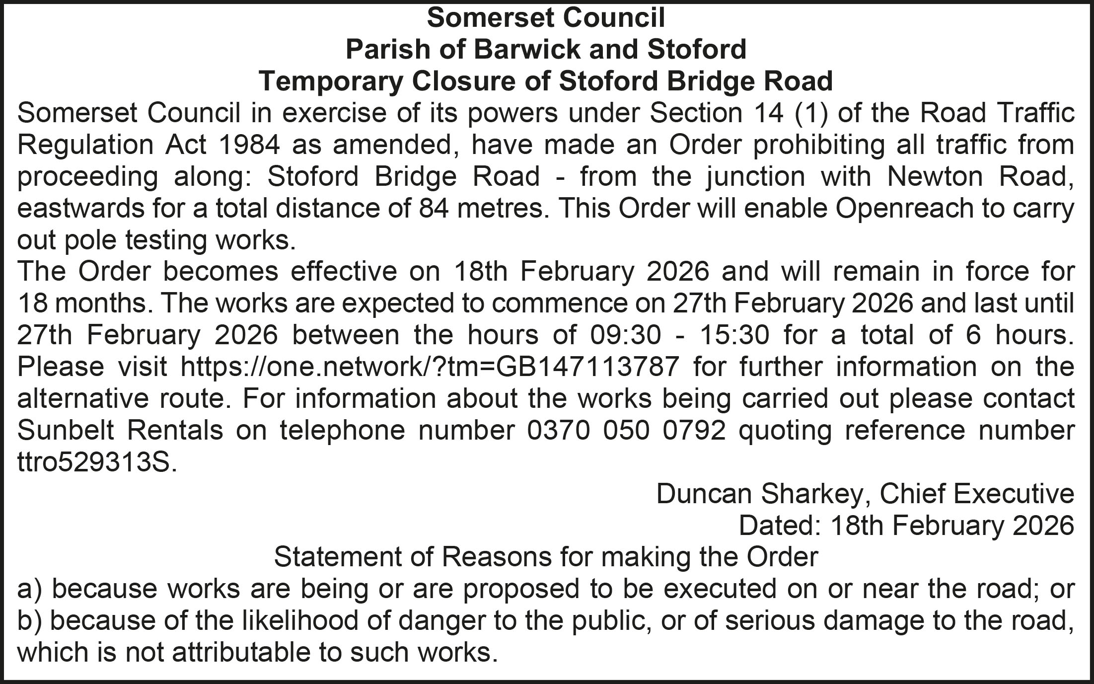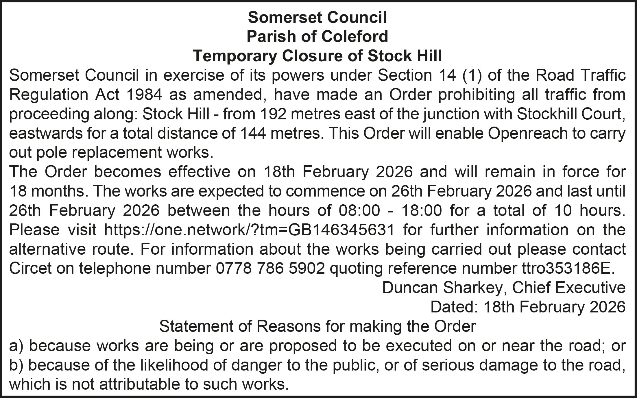 Somerset Council in exercise of its powers under Section 14 (1) of the Road Traffic Regulation Act 1984 as amended, have made an Order prohibiting all traffic from proceeding along: Stock Hill – from 192 metres east of the junction with Stockhill Court, eastwards for a total distance of 144 metres. This Order will enable Openreach to carry out pole replacement works.