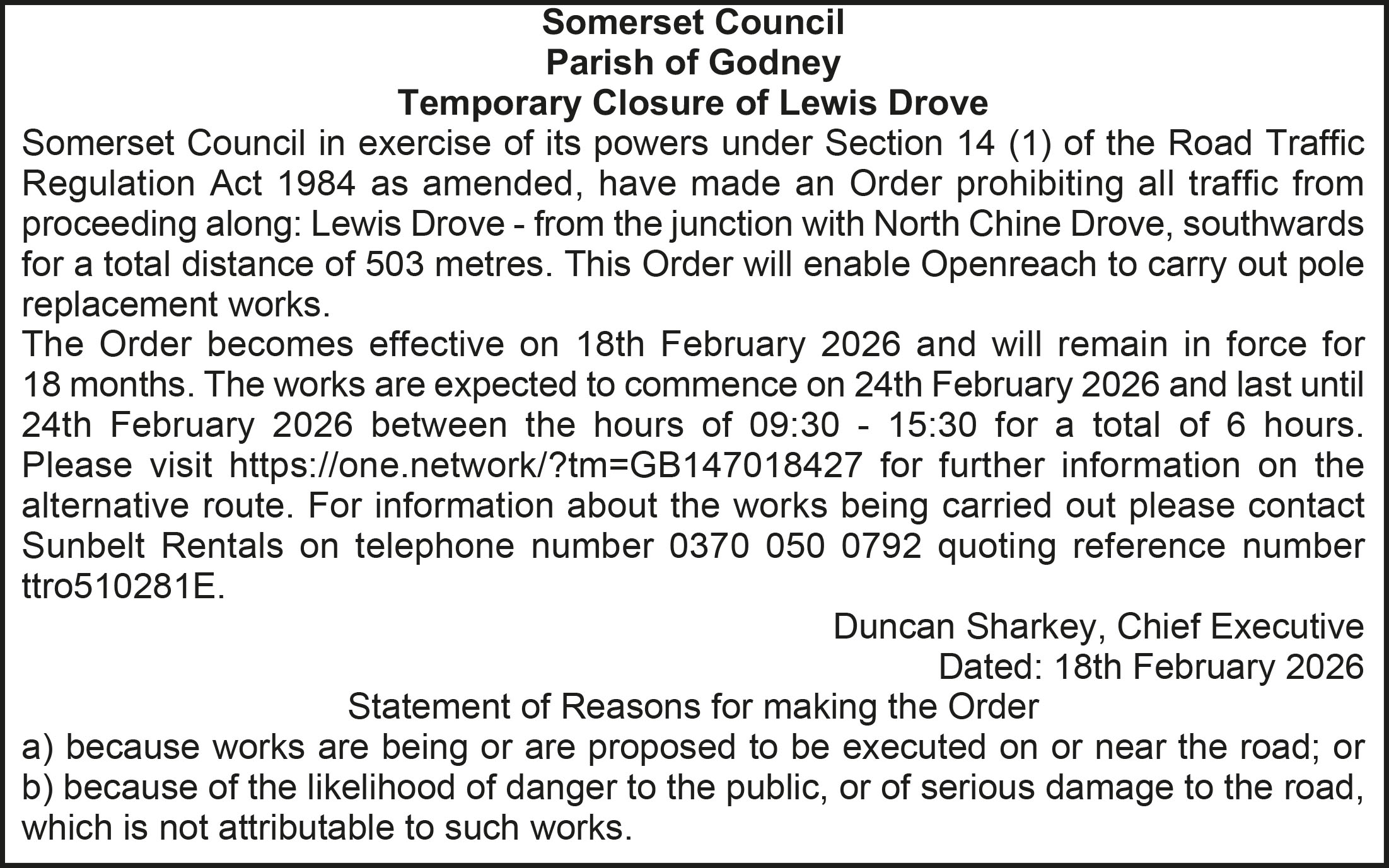 Somerset Council in exercise of its powers under Section 14 (1) of the Road Traffic Regulation Act 1984 as amended, have made an Order prohibiting all traffic from proceeding along: Lewis Drove – from the junction with North Chine Drove, southwards for a total distance of 503 metres. This Order will enable Openreach to carry out pole replacement works.