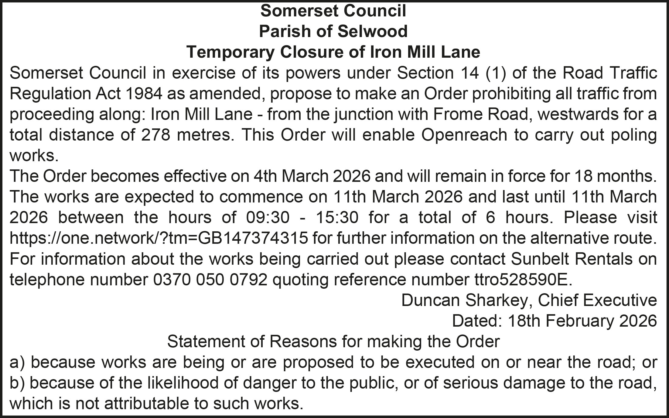 Somerset Council in exercise of its powers under Section 14 (1) of the Road Traffic Regulation Act 1984 as amended, propose to make an Order prohibiting all traffic from proceeding along: Iron Mill Lane – from the junction with Frome Road, westwards for a total distance of 278 metres. This Order will enable Openreach to carry out poling works.