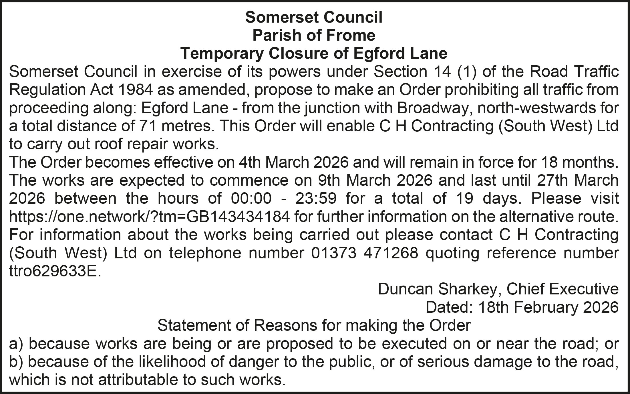 Somerset Council in exercise of its powers under Section 14 (1) of the Road Traffic Regulation Act 1984 as amended, propose to make an Order prohibiting all traffic from proceeding along: Egford Lane – from the junction with Broadway, north-westwards for a total distance of 71 metres. This Order will enable C H Contracting (South West) Ltd to carry out roof repair works.