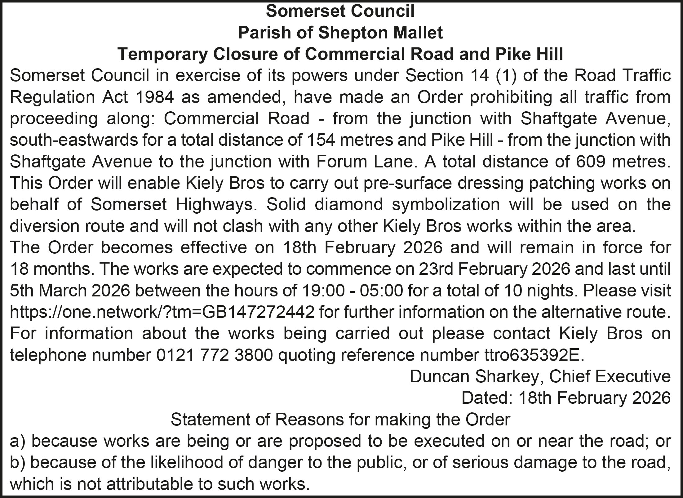 Somerset Council in exercise of its powers under Section 14 (1) of the Road Traffic Regulation Act 1984 as amended, have made an Order prohibiting all traffic from proceeding along: Commercial Road – from the junction with Shaftgate Avenue, south-eastwards for a total distance of 154 metres and Pike Hill – from the junction with Shaftgate Avenue to the junction with Forum Lane. A total distance of 609 metres. This Order will enable Kiely Bros to carry out pre-surface dressing patching works on behalf of Somerset Highways. Solid diamond symbolization will be used on the diversion route and will not clash with any other Kiely Bros works within the area.
