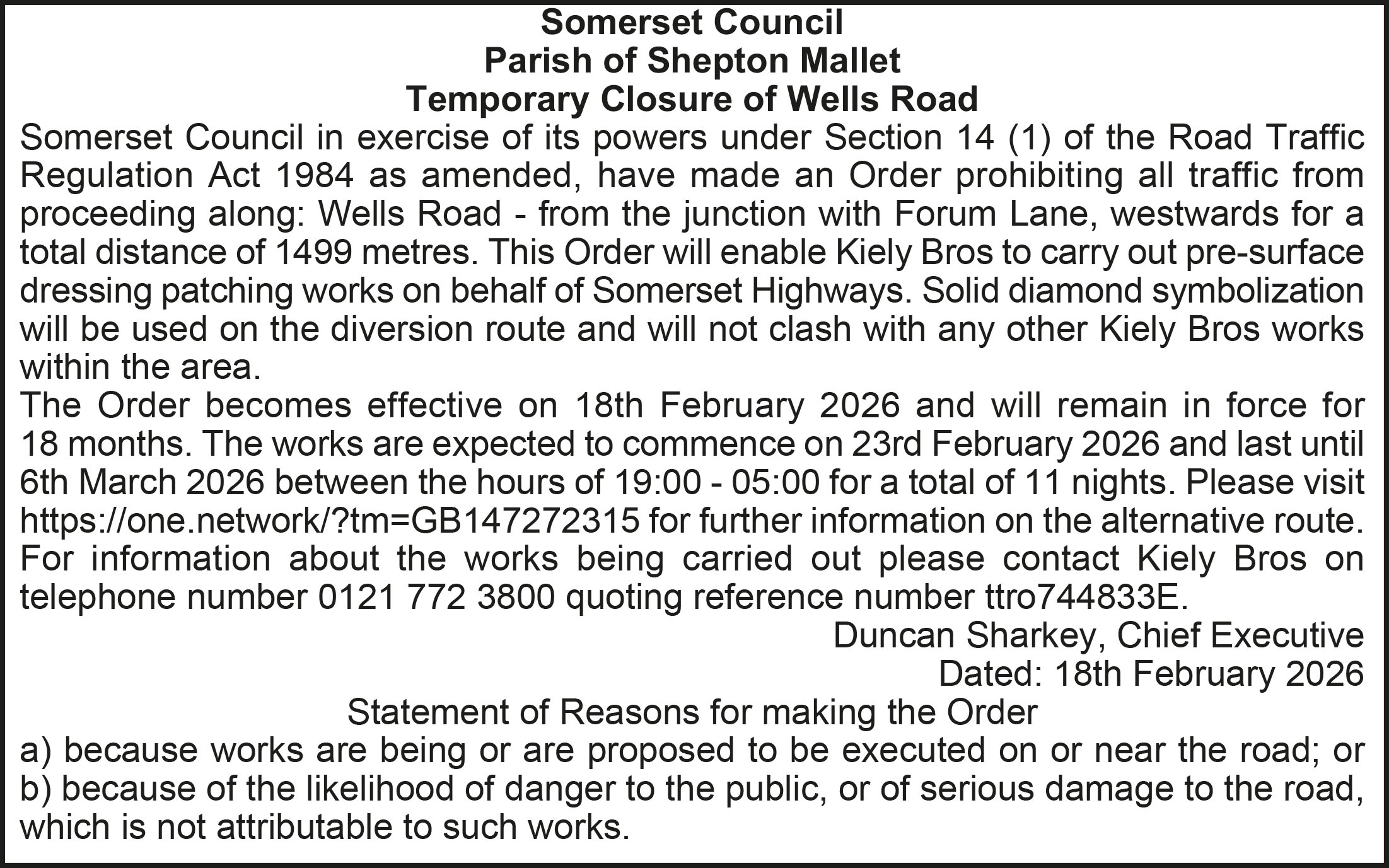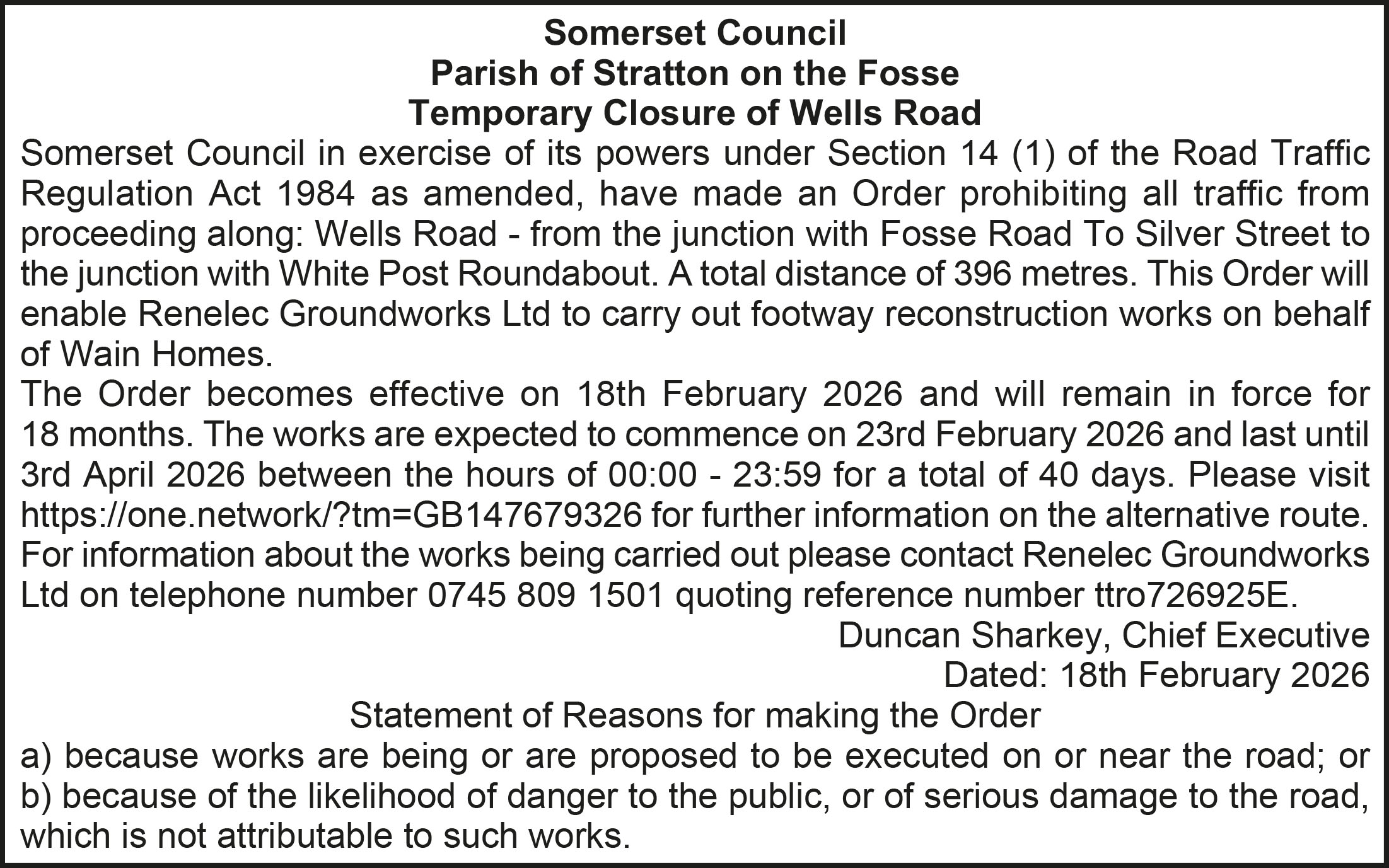 Somerset Council in exercise of its powers under Section 14 (1) of the Road Traffic Regulation Act 1984 as amended, have made an Order prohibiting all traffic from proceeding along: Wells Road – from the junction with Fosse Road To Silver Street to the junction with White Post Roundabout. A total distance of 396 metres. This Order will enable Renelec Groundworks Ltd to carry out footway reconstruction works on behalf of Wain Homes.
