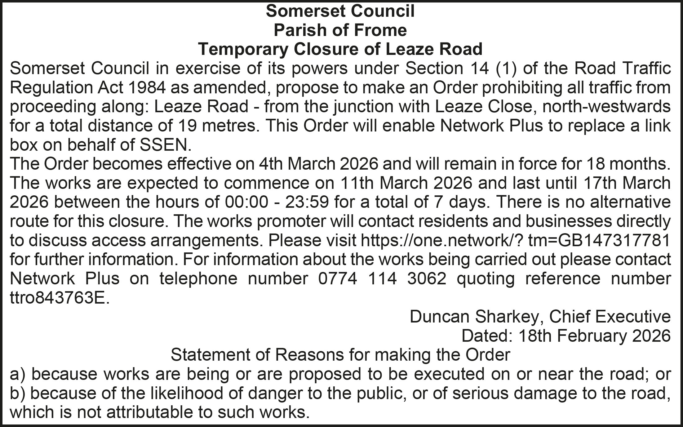 Somerset Council in exercise of its powers under Section 14 (1) of the Road Traffic Regulation Act 1984 as amended, propose to make an Order prohibiting all traffic from proceeding along: Leaze Road – from the junction with Leaze Close, north-westwards for a total distance of 19 metres. This Order will enable Network Plus to replace a link box on behalf of SSEN.