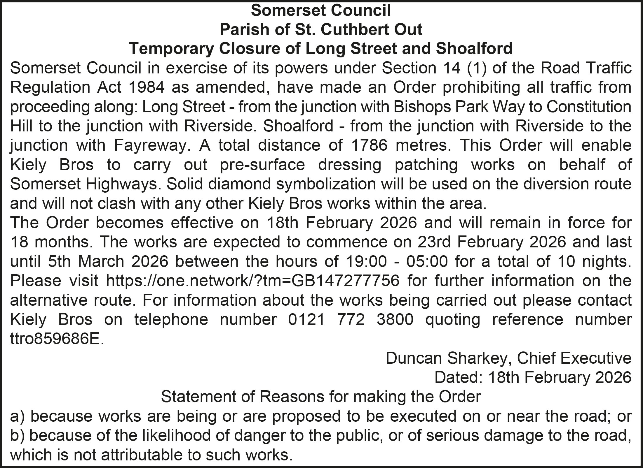 The Order becomes effective on 18th February 2026 and will remain in force for 18 months. The works are expected to commence on 23rd February 2026 and last until 6th March 2026 between the hours of 00:00 – 23:59 for a total of 12 days. Please visit https://one.network/?tm=GB146682430 for further information on the alternative route. For information about the works being carried out please contact Somerset Highways on telephone number 0300 123 2224 quoting reference number ttro279847E.