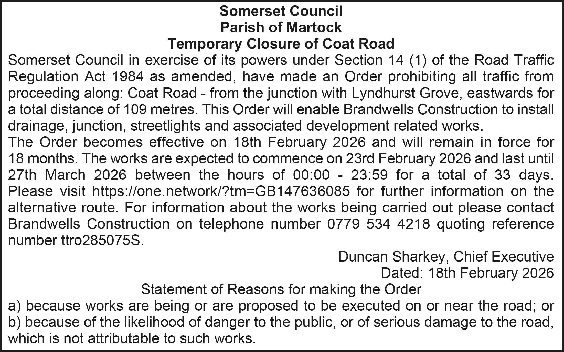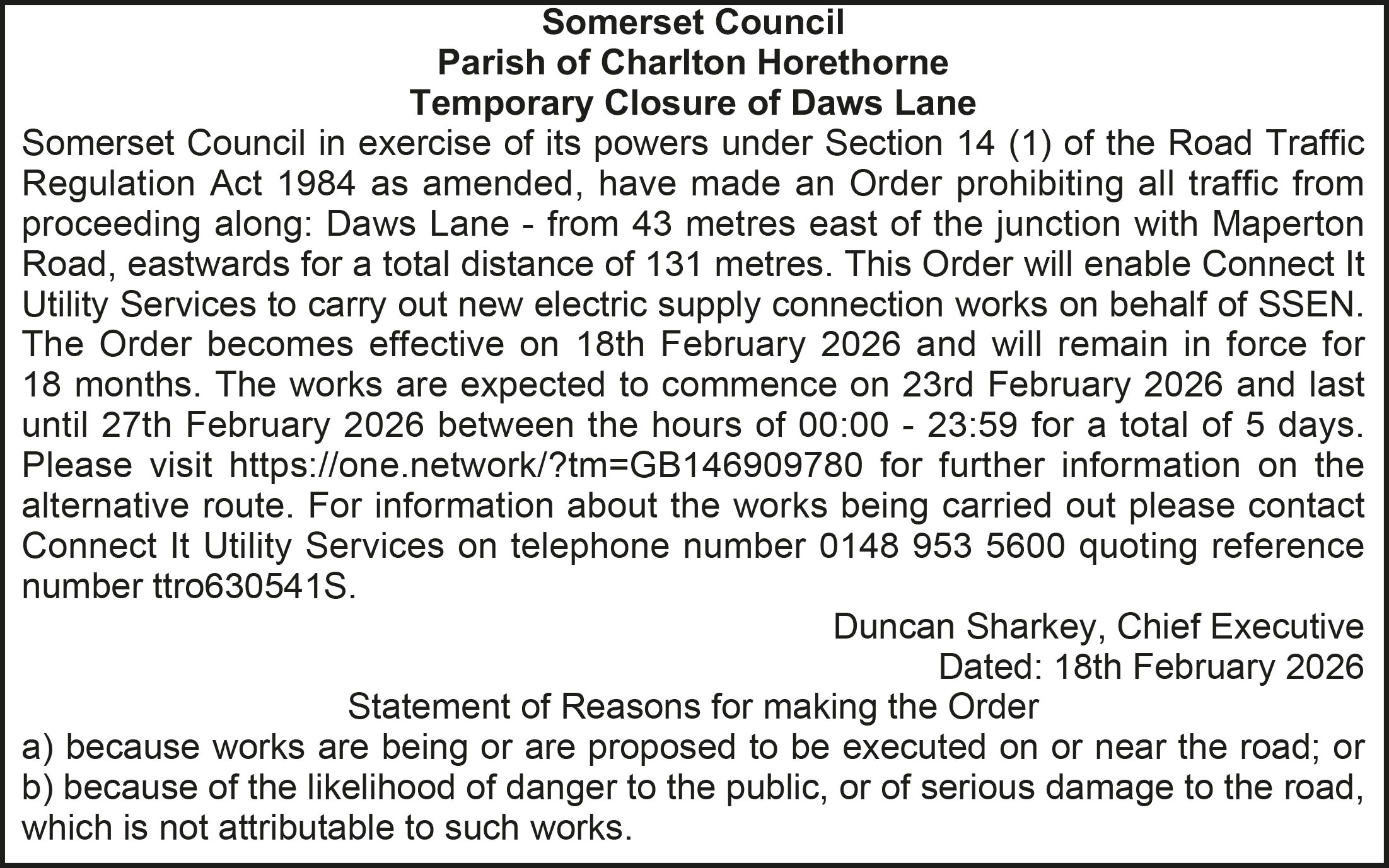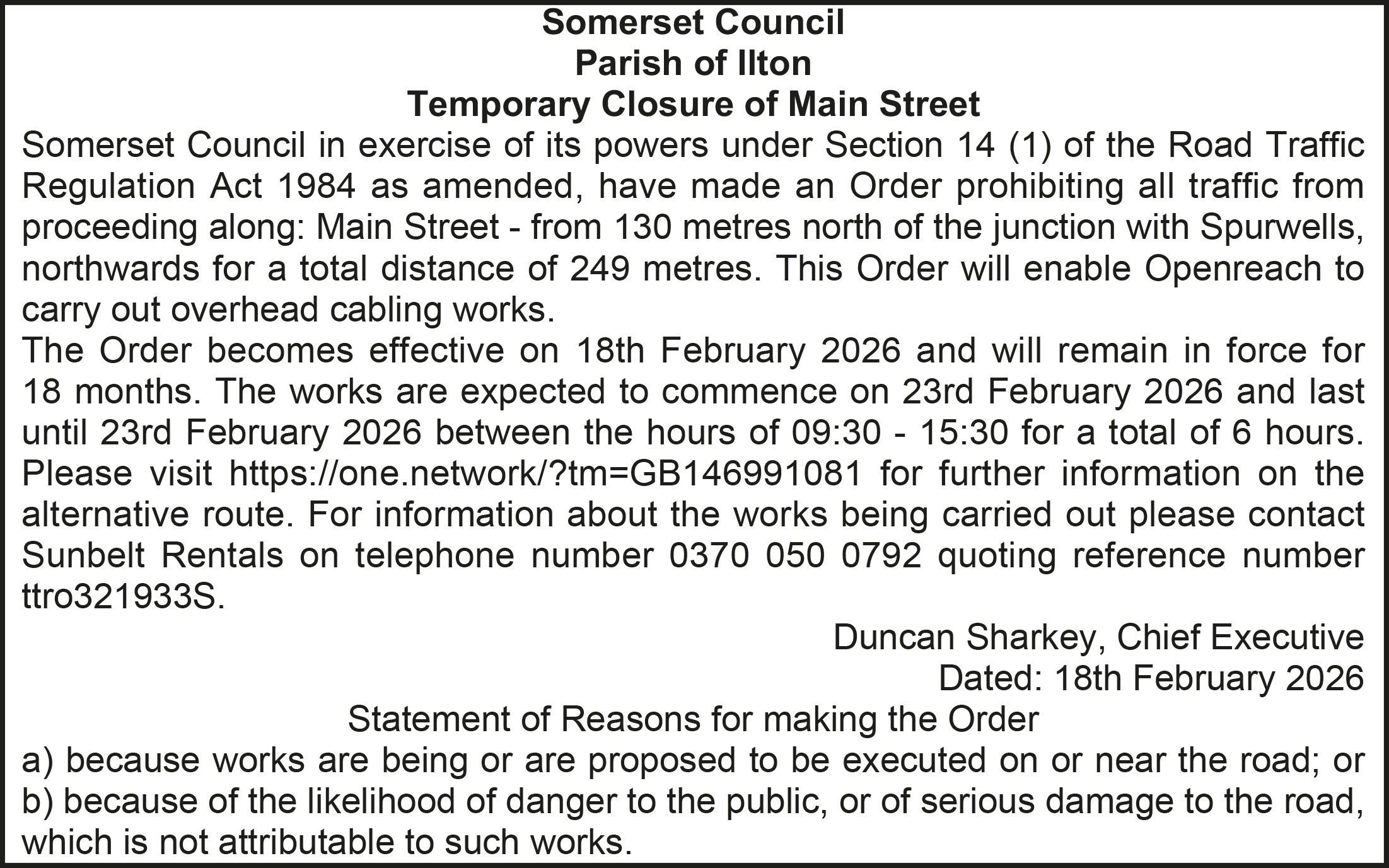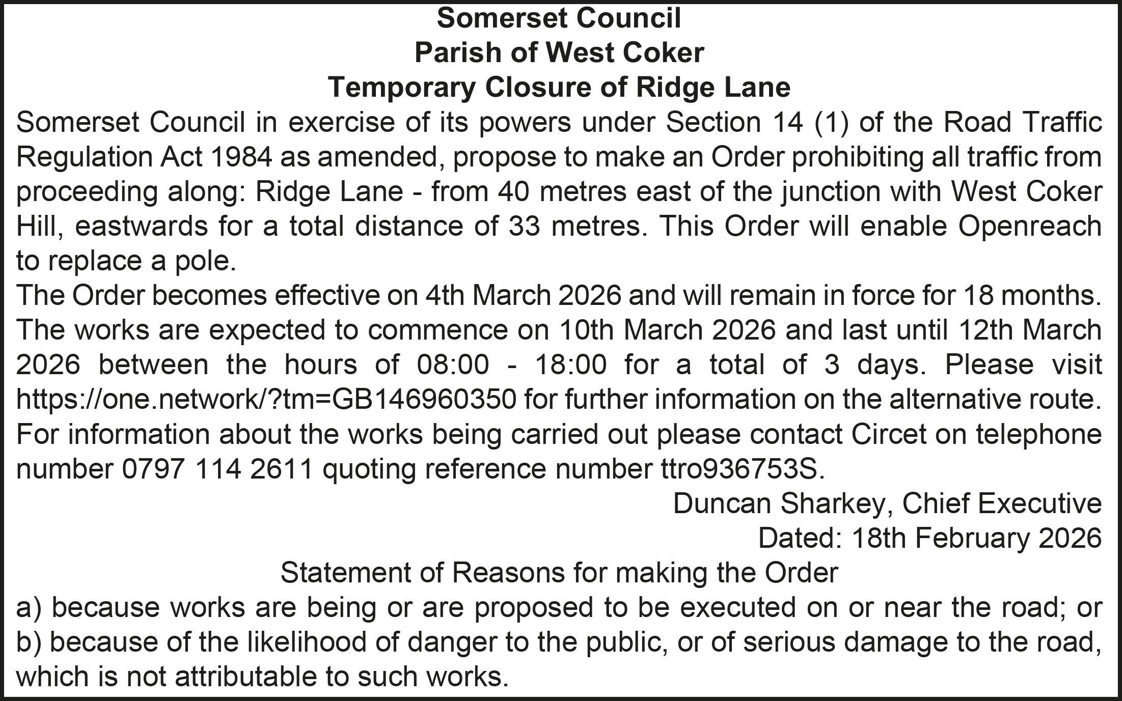The Order becomes effective on 4th March 2026 and will remain in force for 18 months. The works are expected to commence on 9th March 2026 and last until 13th March 2026 between the hours of 08:00 – 17:00 for a total of 5 days. Please visit https://one.network/?tm=GB147390404 for further information on the alternative route. For information about the works being carried out please contact Somerset Highways on telephone number 0300 123 2224 quoting reference number ttro403146W(WS).