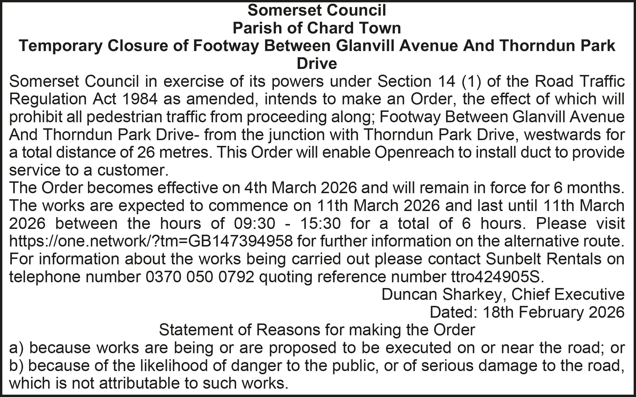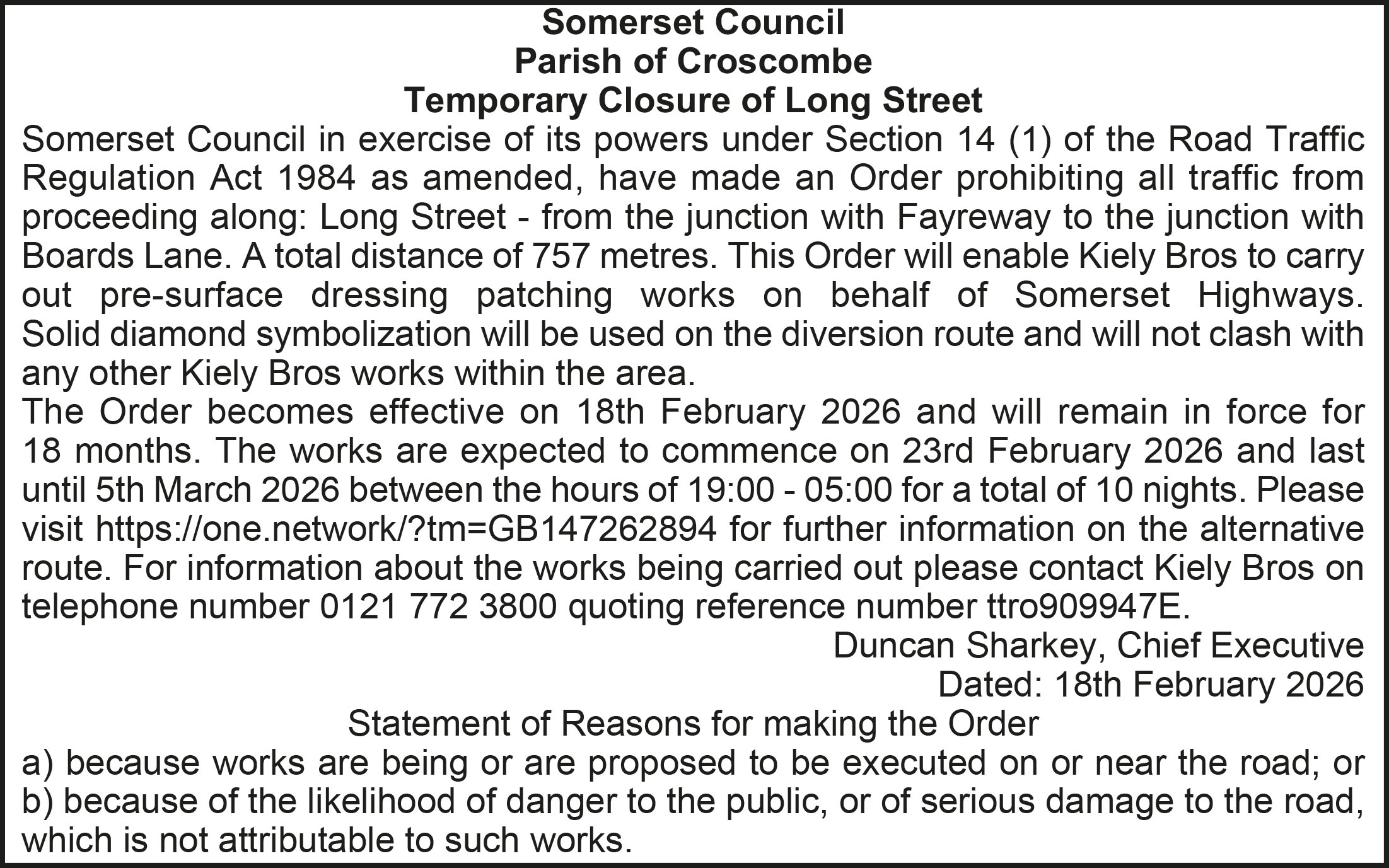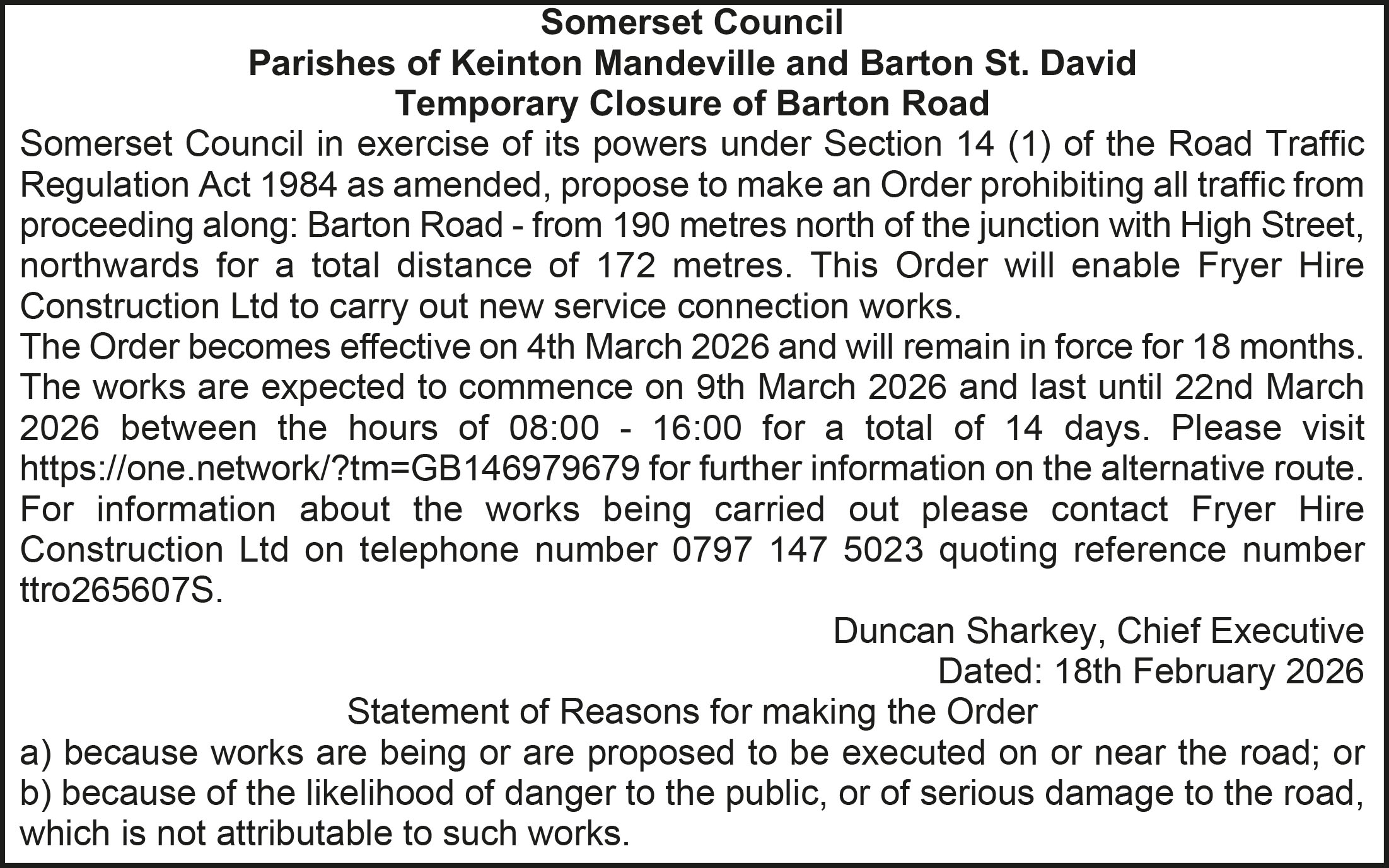 The Order becomes effective on 4th March 2026 and will remain in force for 18 months. The works are expected to commence on 9th March 2026 and last until 13th March 2026 between the hours of 08:00 – 17:00 for a total of 5 days. Please visit https://one.network/?tm=GB147390404 for further information on the alternative route. For information about the works being carried out please contact Somerset Highways on telephone number 0300 123 2224 quoting reference number ttro403146W(WS).