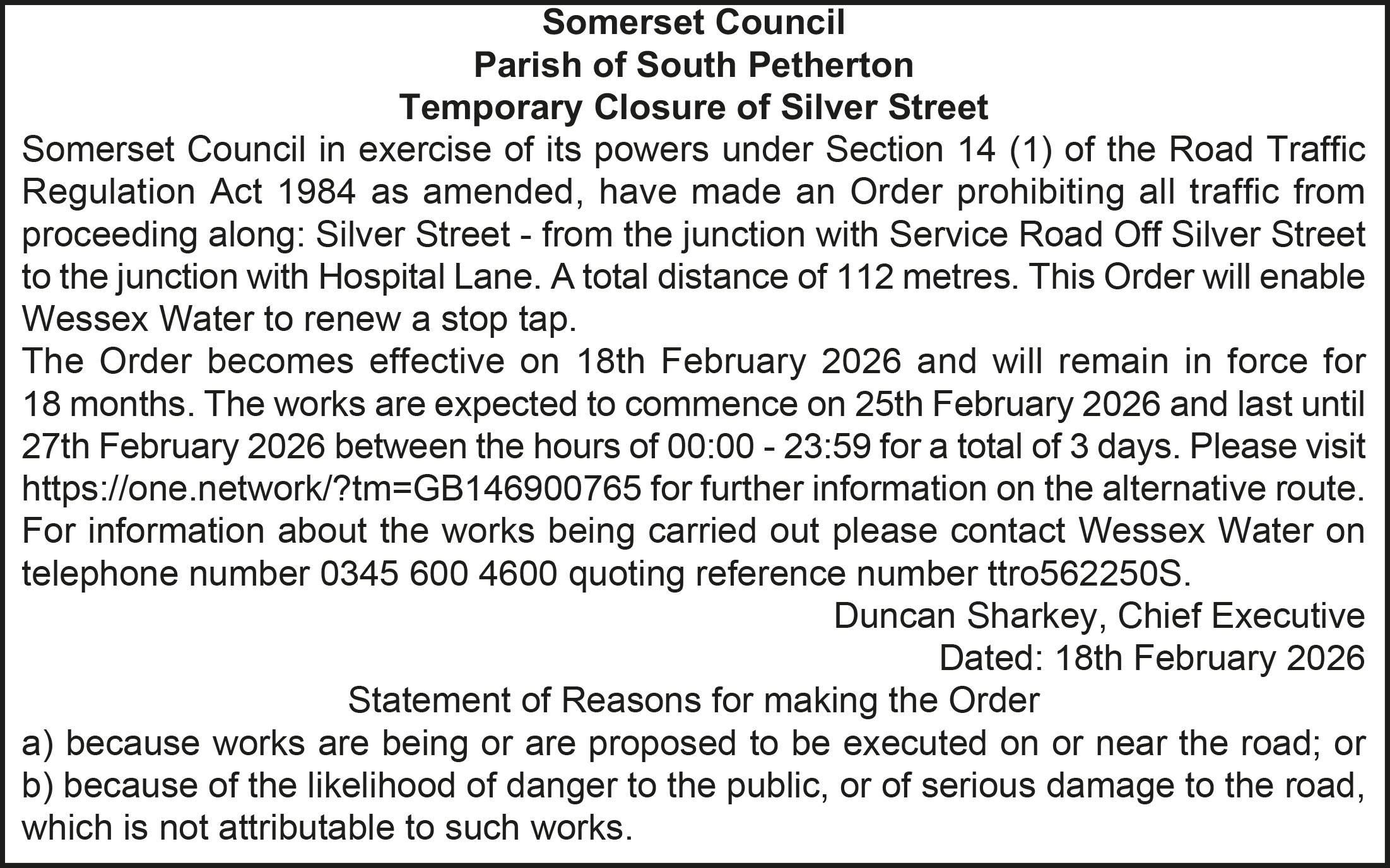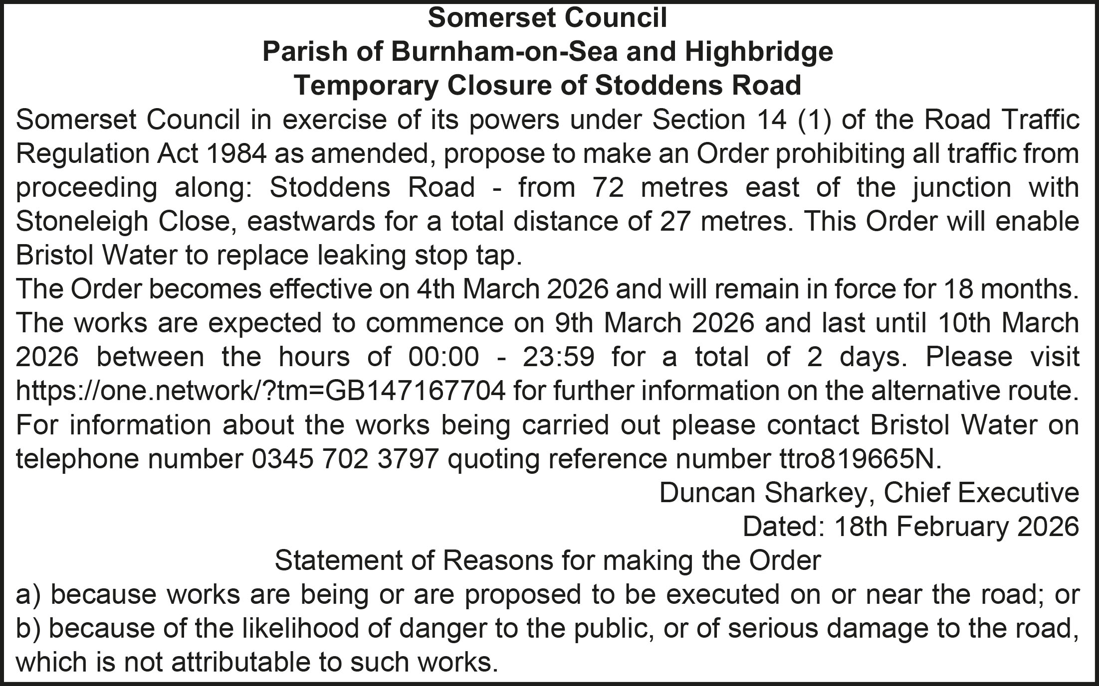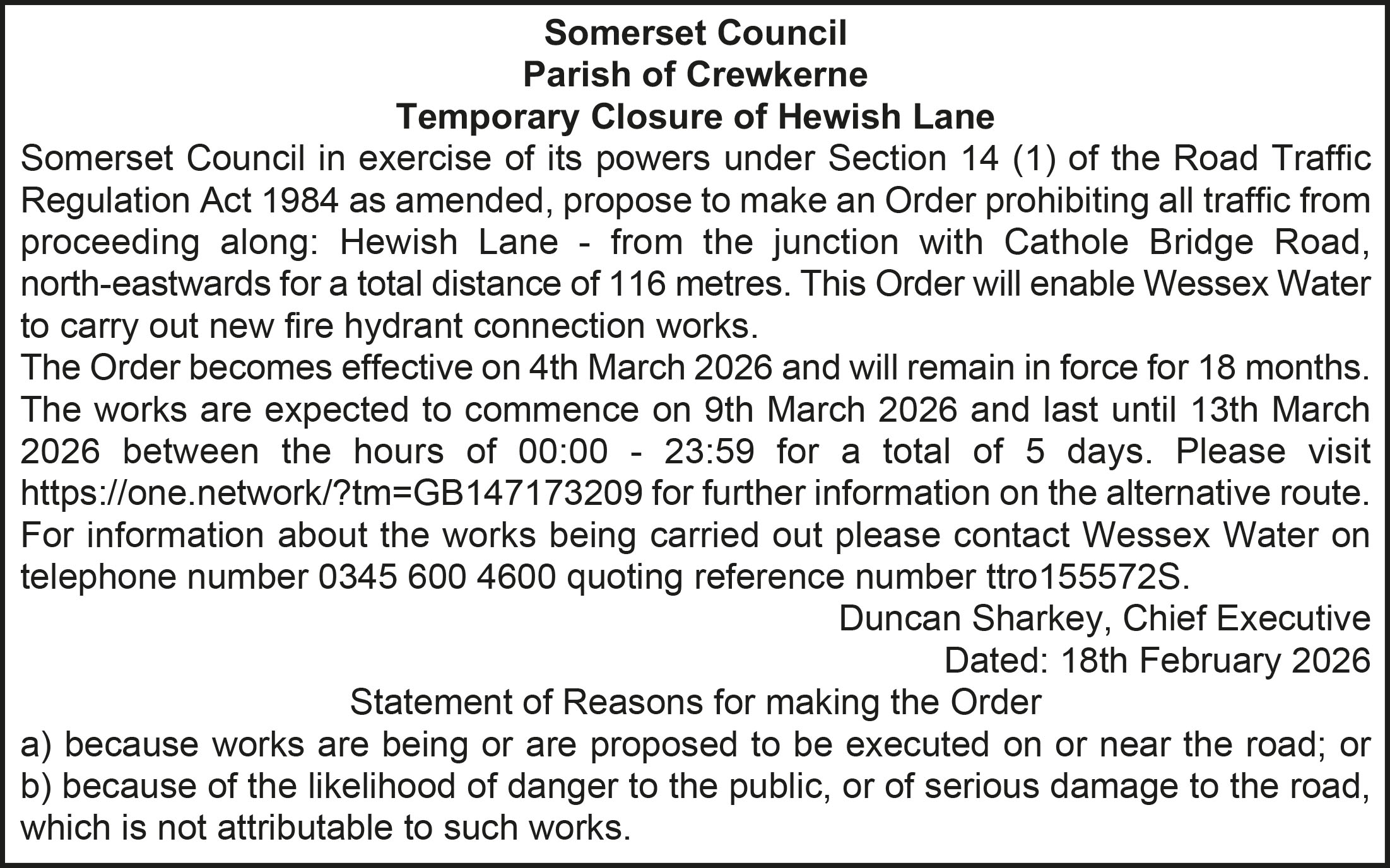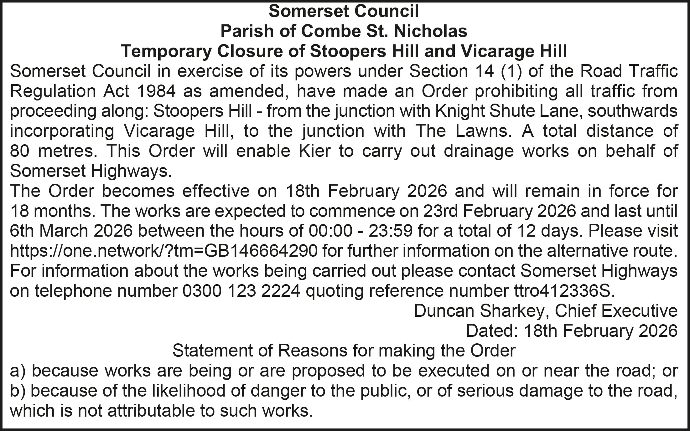 The Order becomes effective on 4th March 2026 and will remain in force for 18 months. The works are expected to commence on 9th March 2026 and last until 13th March 2026 between the hours of 08:00 – 17:00 for a total of 5 days. Please visit https://one.network/?tm=GB147390404 for further information on the alternative route. For information about the works being carried out please contact Somerset Highways on telephone number 0300 123 2224 quoting reference number ttro403146W(WS).