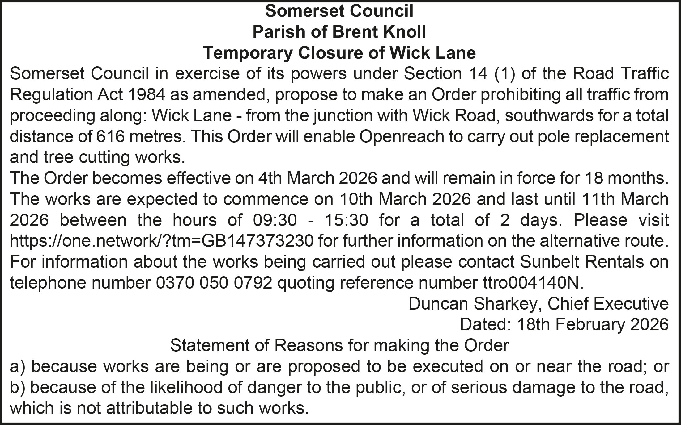 Somerset Council in exercise of its powers under Section 14 (1) of the Road Traffic Regulation Act 1984 as amended, propose to make an Order prohibiting all traffic from proceeding along: Wick Lane – from the junction with Wick Road, southwards for a total distance of 616 metres. This Order will enable Openreach to carry out pole replacement and tree cutting works.