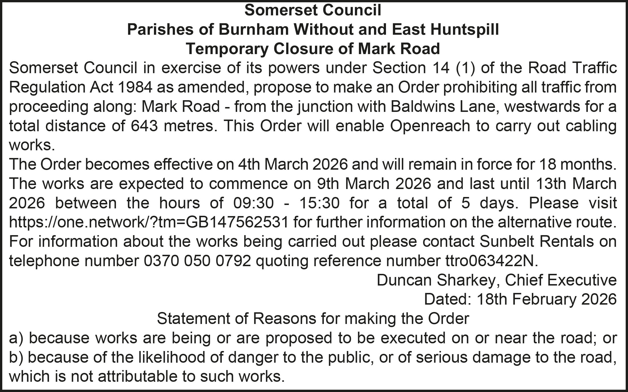 Somerset Council in exercise of its powers under Section 14 (1) of the Road Traffic Regulation Act 1984 as amended, propose to make an Order prohibiting all traffic from proceeding along: Mark Road – from the junction with Baldwins Lane, westwards for a total distance of 643 metres. This Order will enable Openreach to carry out cabling works.
