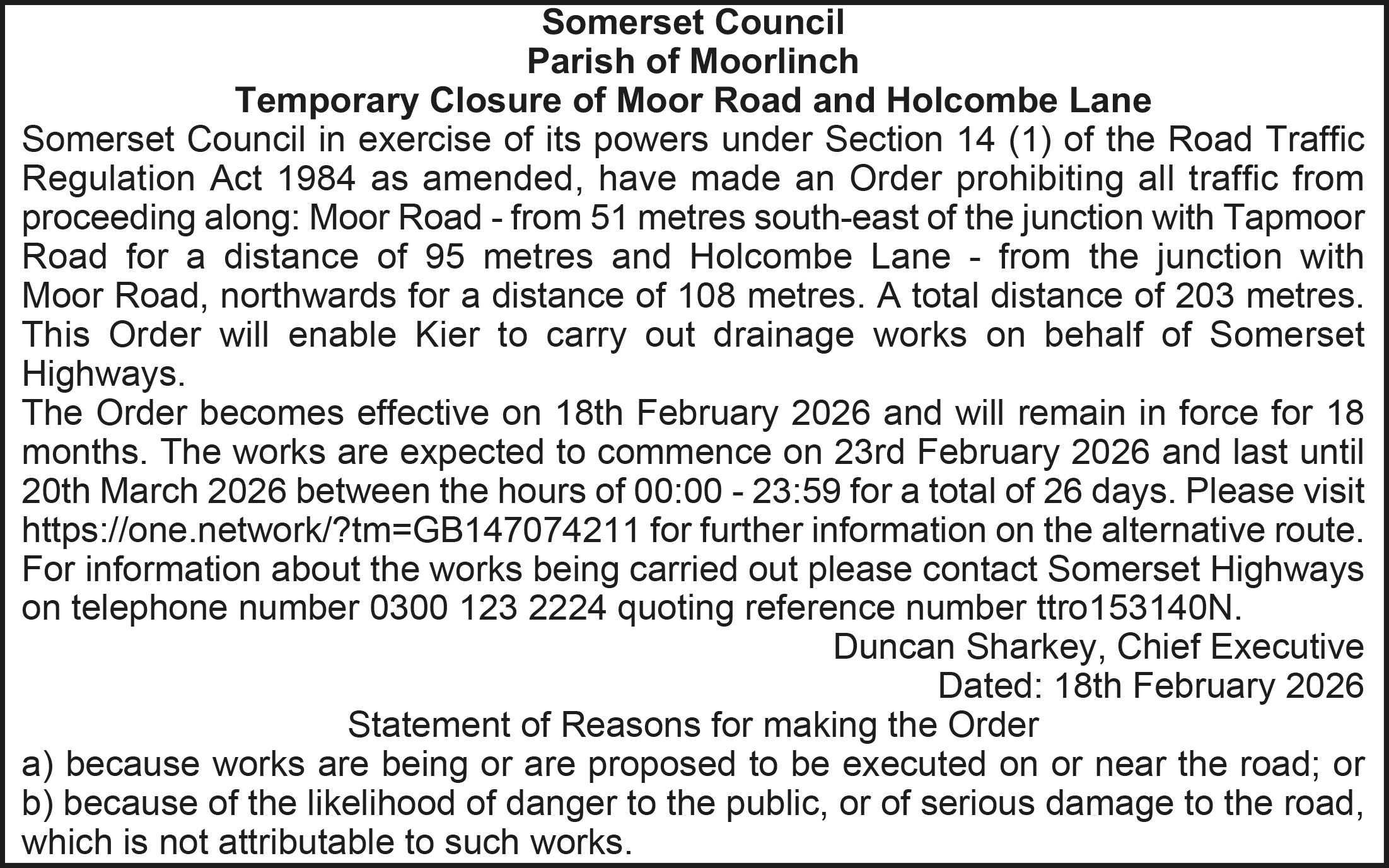 Somerset Council in exercise of its powers under Section 14 (1) of the Road Traffic Regulation Act 1984 as amended, have made an Order prohibiting all traffic from proceeding along: Moor Road – from 51 metres south-east of the junction with Tapmoor Road for a distance of 95 metres and Holcombe Lane – from the junction with Moor Road, northwards for a distance of 108 metres. A total distance of 203 metres. This Order will enable Kier to carry out drainage works on behalf of Somerset Highways.