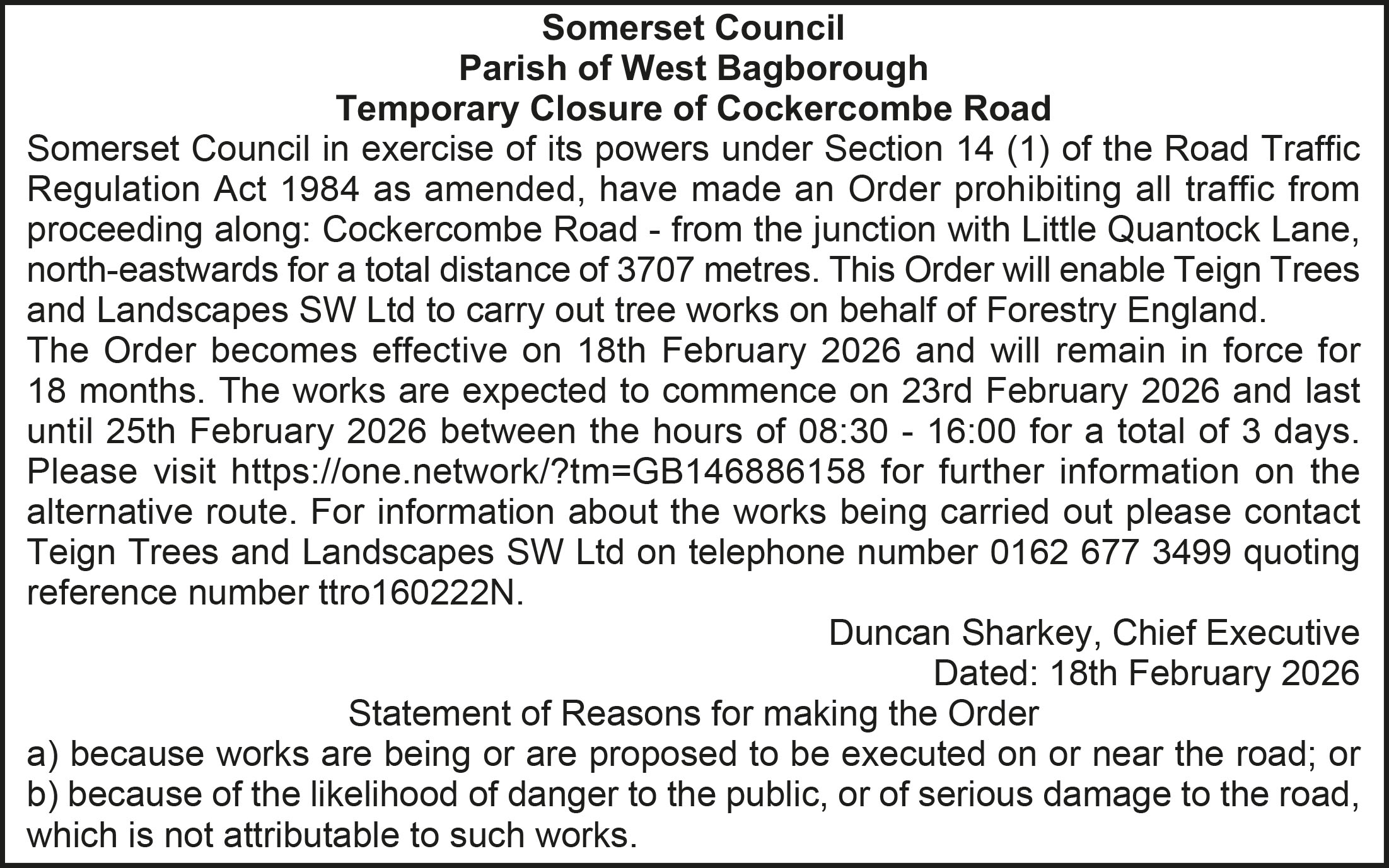 Somerset Council in exercise of its powers under Section 14 (1) of the Road Traffic Regulation Act 1984 as amended, have made an Order prohibiting all traffic from proceeding along: Cockercombe Road – from the junction with Little Quantock Lane, north-eastwards for a total distance of 3707 metres. This Order will enable Teign Trees and Landscapes SW Ltd to carry out tree works on behalf of Forestry England.