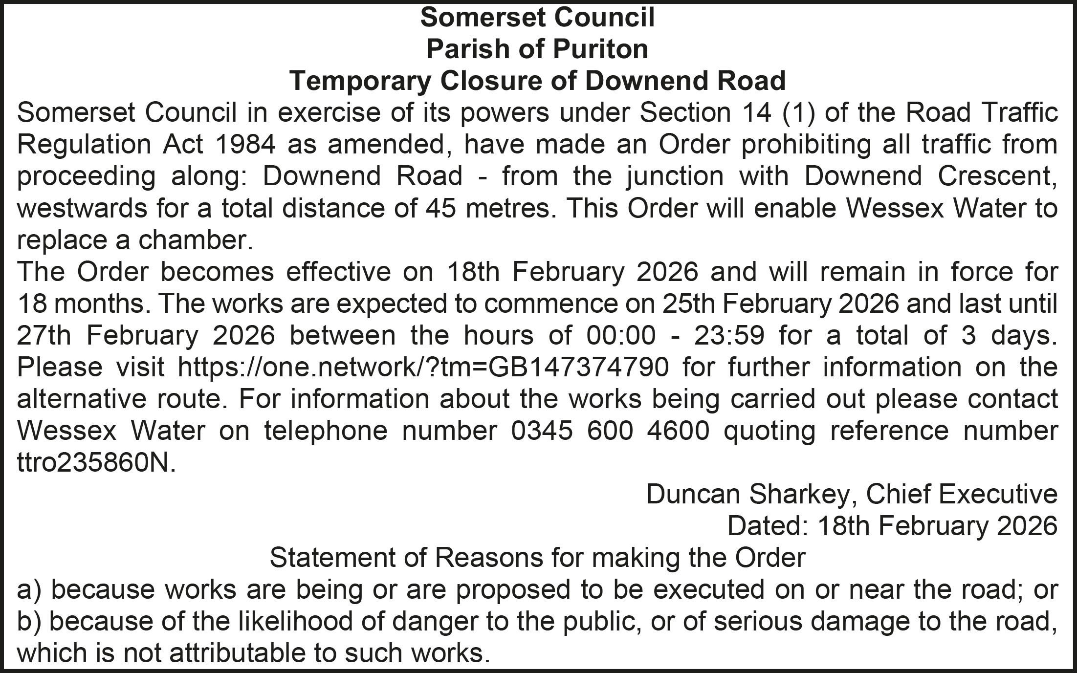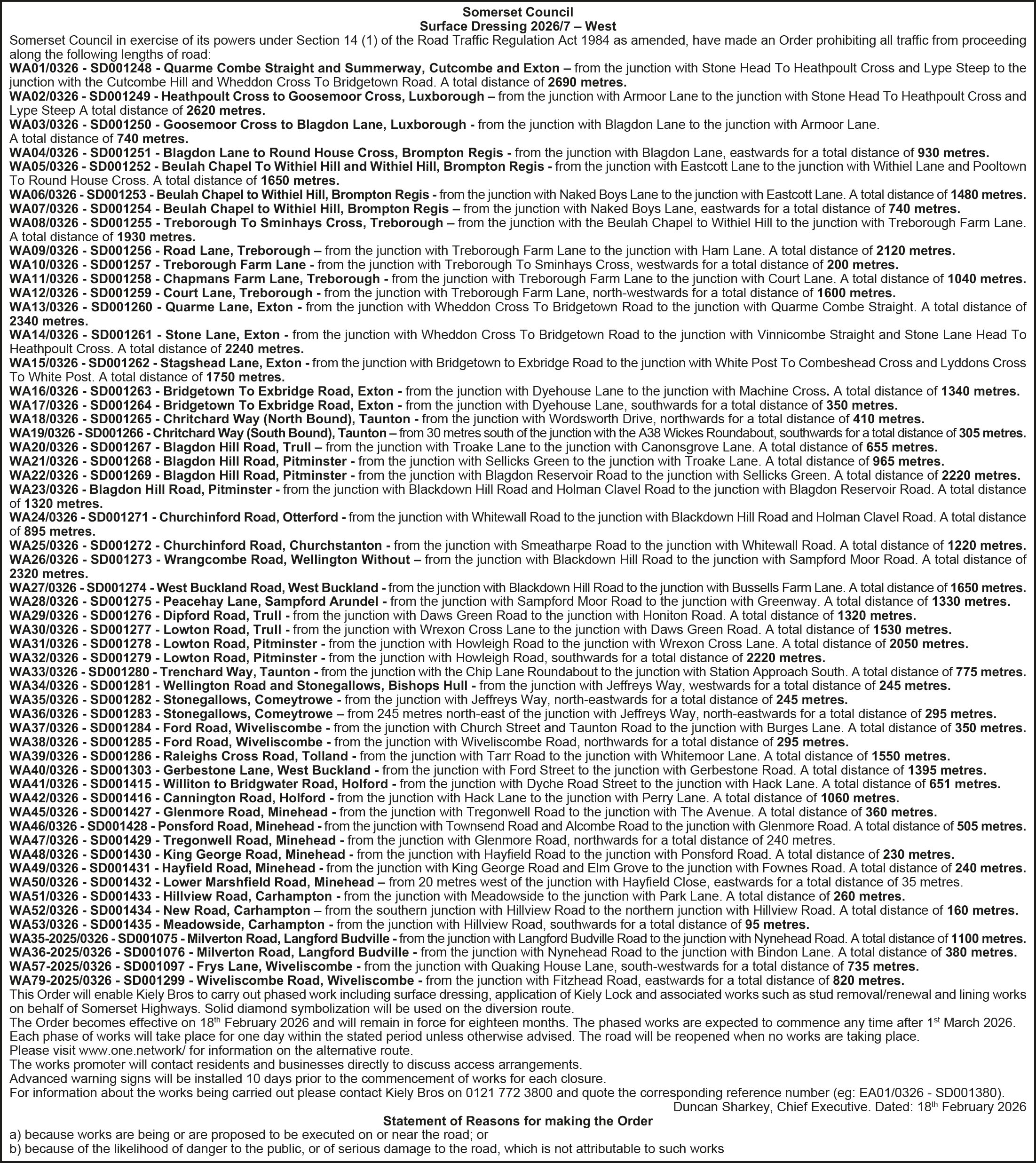 The Order becomes effective on 18th February 2026 and will remain in force for 18 months. The works are expected to commence on 23rd February 2026 and last until 20th March 2026 between the hours of 00:00 – 23:59 for a total of 26 days. Please visit https://one.network/?tm=GB147074211 for further information on the alternative route. For information about the works being carried out please contact Somerset Highways on telephone number 0300 123 2224 quoting reference number ttro153140N.
