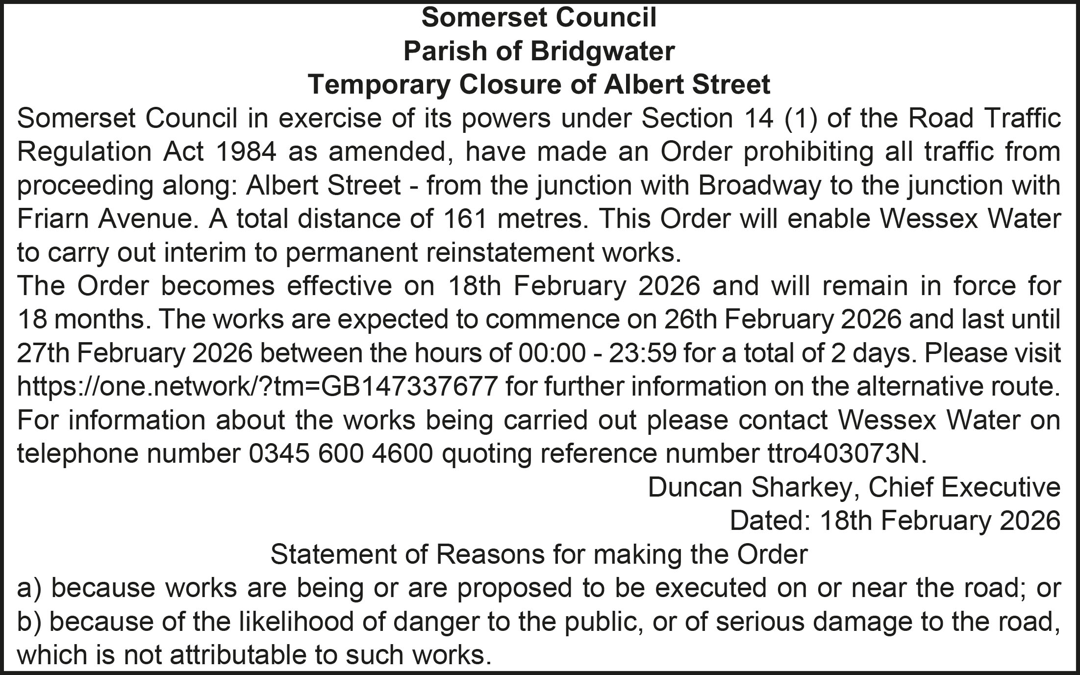 Somerset Council in exercise of its powers under Section 14 (1) of the Road Traffic Regulation Act 1984 as amended, have made an Order prohibiting all traffic from proceeding along: Albert Street – from the junction with Broadway to the junction with Friarn Avenue. A total distance of 161 metres. This Order will enable Wessex Water to carry out interim to permanent reinstatement works.