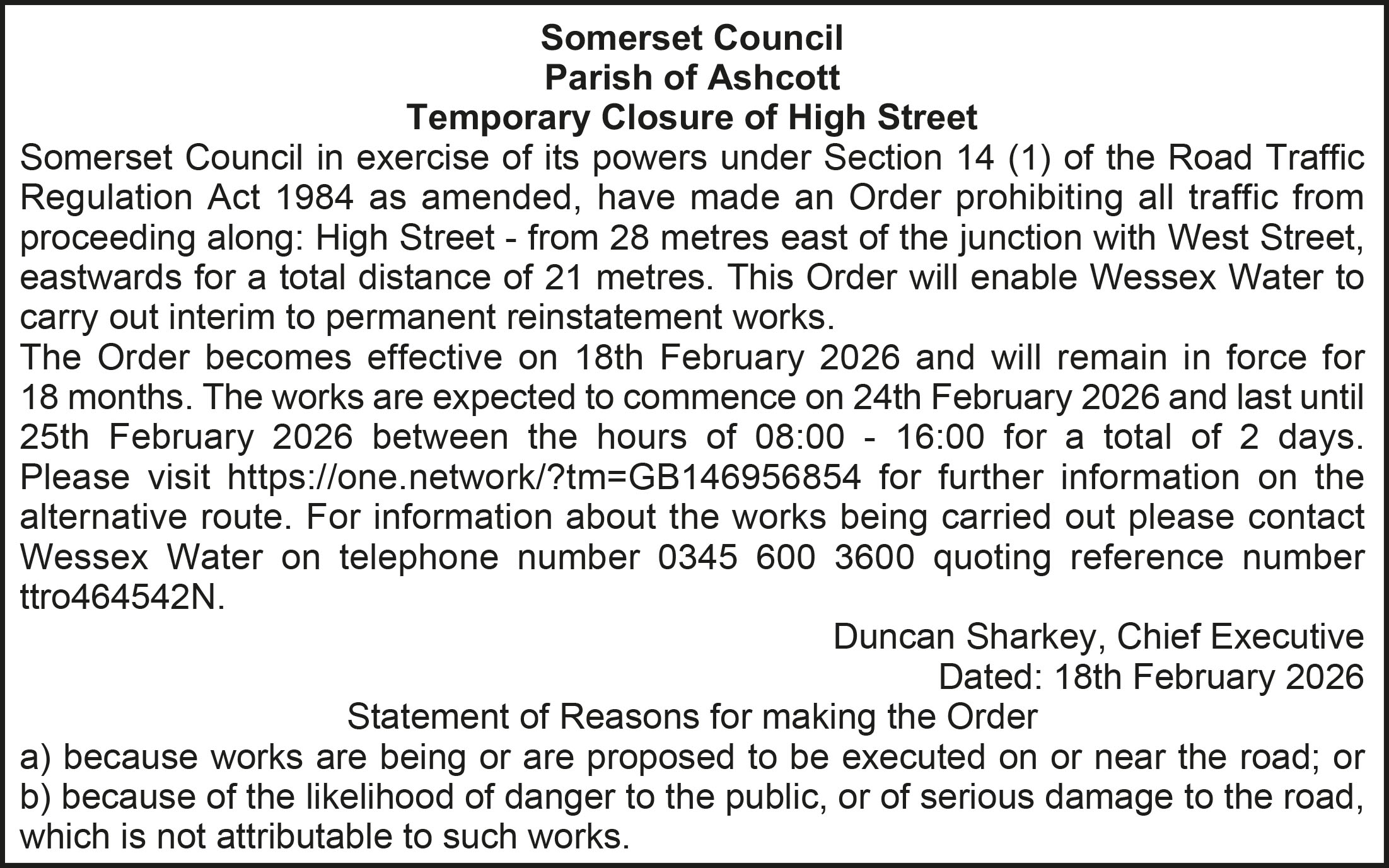 Somerset Council in exercise of its powers under Section 14 (1) of the Road Traffic Regulation Act 1984 as amended, have made an Order prohibiting all traffic from proceeding along: High Street – from 28 metres east of the junction with West Street, eastwards for a total distance of 21 metres. This Order will enable Wessex Water to carry out interim to permanent reinstatement works.
