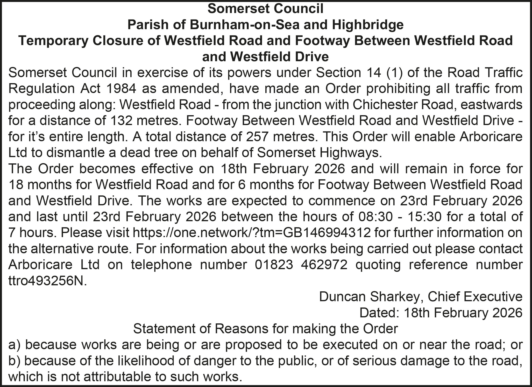 Somerset Council in exercise of its powers under Section 14 (1) of the Road Traffic Regulation Act 1984 as amended, have made an Order prohibiting all traffic from proceeding along: Westfield Road – from the junction with Chichester Road, eastwards for a distance of 132 metres. Footway Between Westfield Road and Westfield Drive – for it’s entire length. A total distance of 257 metres. This Order will enable Arboricare Ltd to dismantle a dead tree on behalf of Somerset Highways.