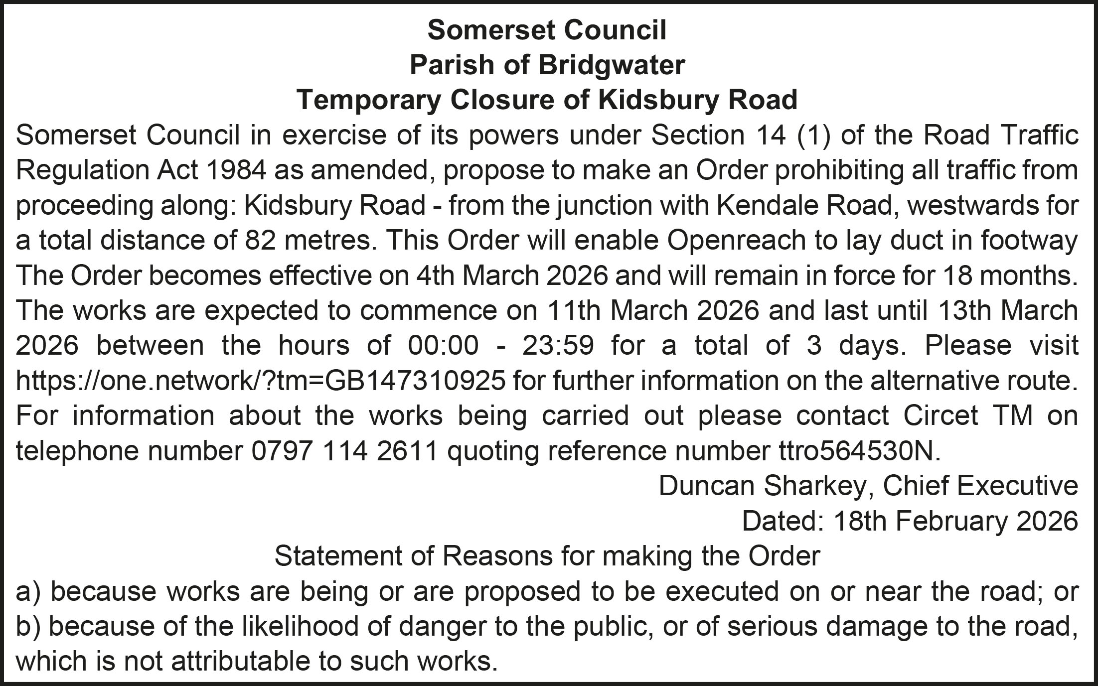 Somerset Council in exercise of its powers under Section 14 (1) of the Road Traffic Regulation Act 1984 as amended, propose to make an Order prohibiting all traffic from proceeding along: Kidsbury Road – from the junction with Kendale Road, westwards for a total distance of 82 metres. This Order will enable Openreach to lay duct in footway.