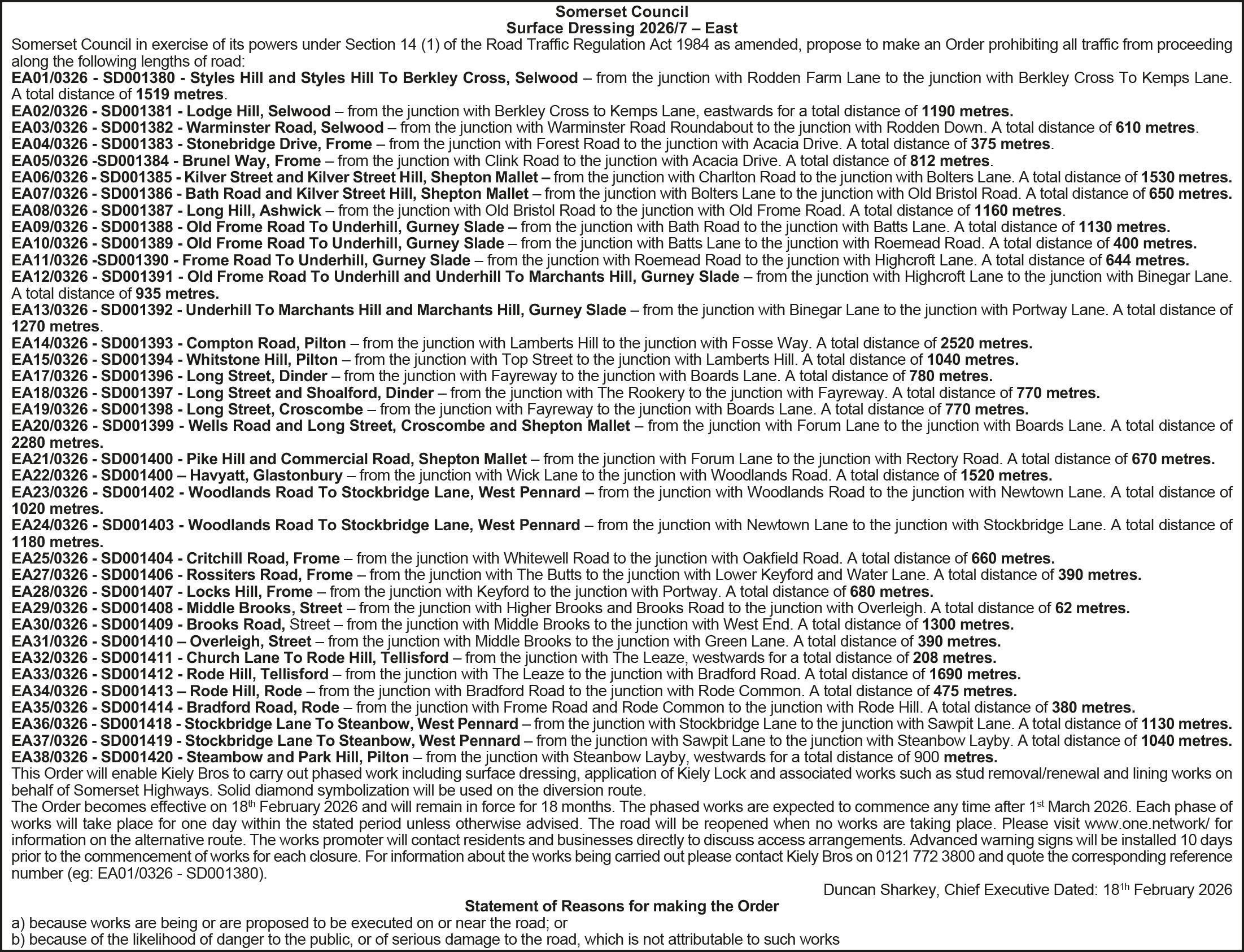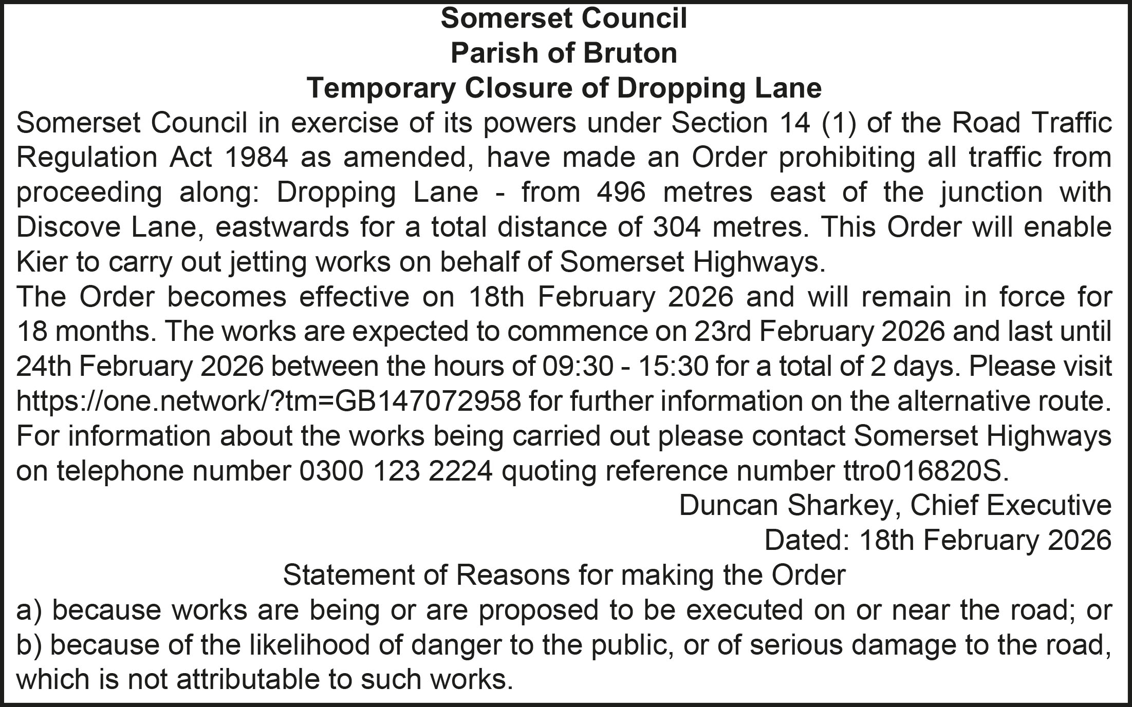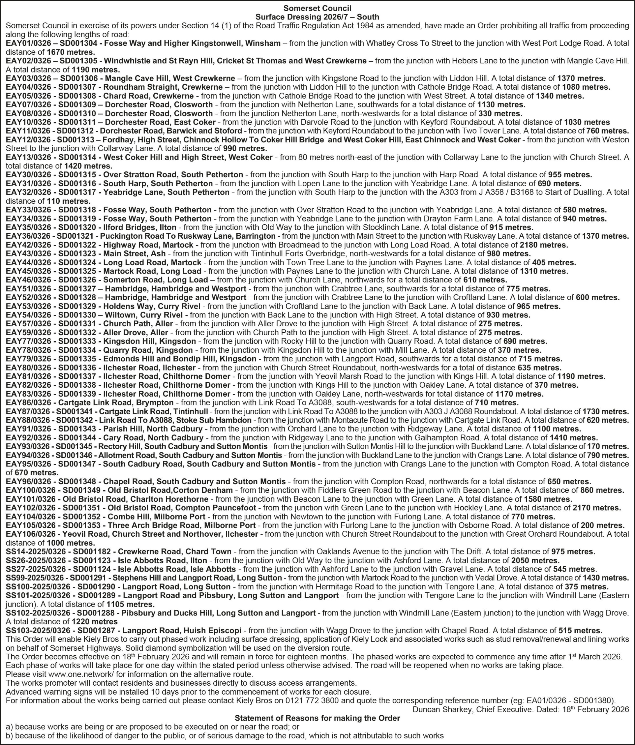 Somerset Council in exercise of its powers under Section 14 (1) of the Road Traffic Regulation Act 1984 as amended, have made an Order prohibiting all traffic from proceeding along: Brooks Road – from the junction with West End to the junction with Higher Brooks; Middle Brooks – from the junction with Higher Brooks to the junction with Overleigh and Overleigh – from the junction with Middle Brooks to the junction with Green Lane. A total distance of 2327 metres. This Order will enable Kiely Bros to carry out pre-surface dressing patching works on behalf of Somerset Highways.