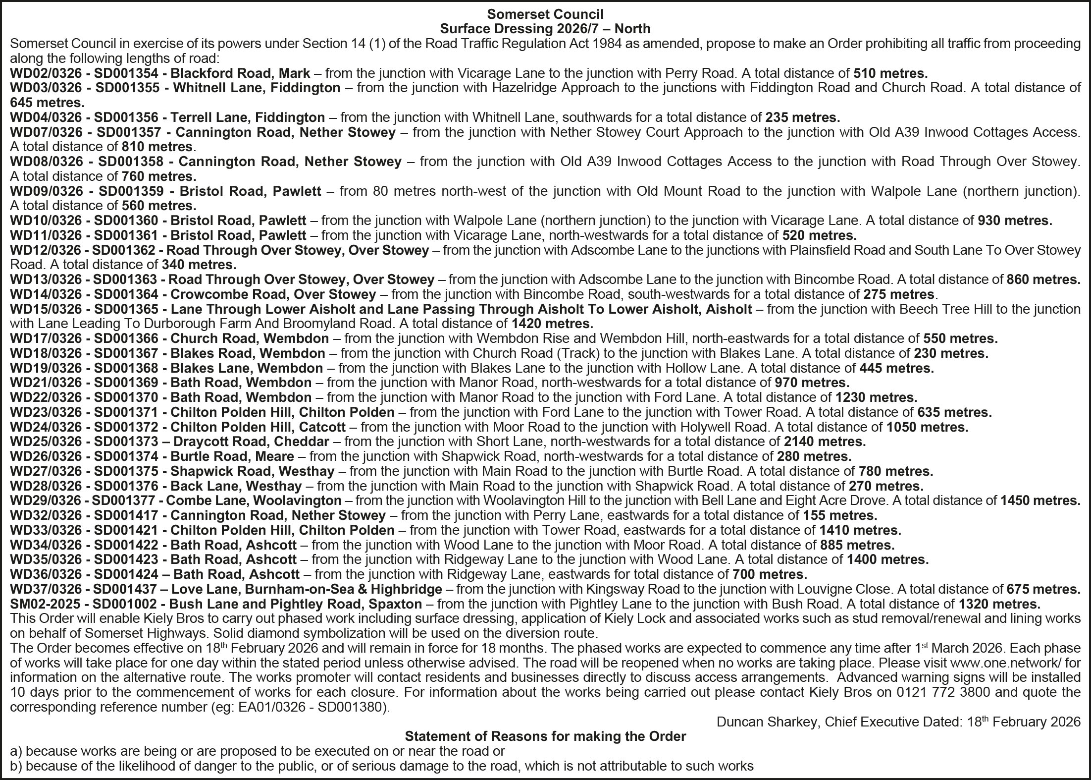 SOMERSET LEVELLER: Public notices published in edition 203, February 18, 2026:
