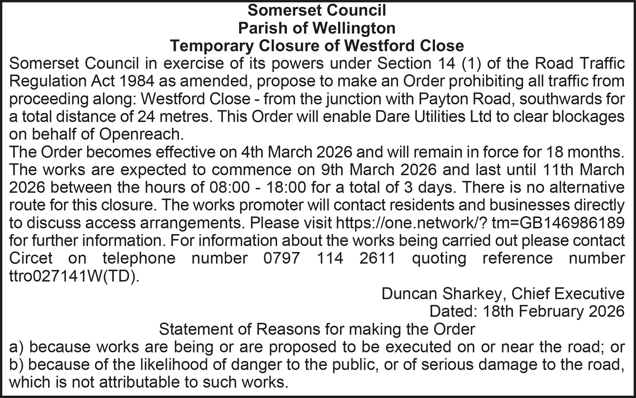 Somerset Council in exercise of its powers under Section 14 (1) of the Road Traffic Regulation Act 1984 as amended, propose to make an Order prohibiting all traffic from proceeding along: Westford Close – from the junction with Payton Road, southwards for a total distance of 24 metres. This Order will enable Dare Utilities Ltd to clear blockages on behalf of Openreach.