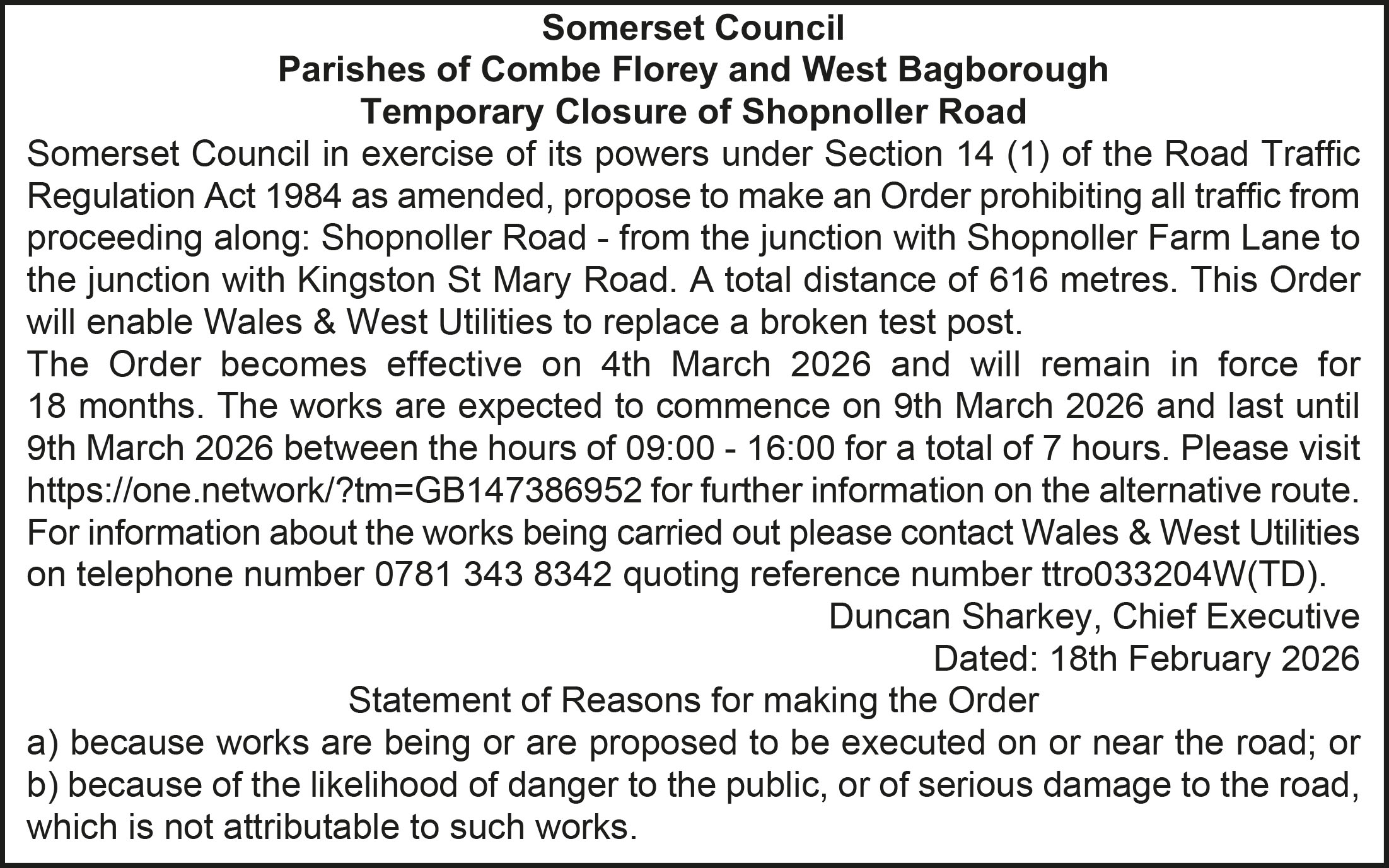 Somerset Council in exercise of its powers under Section 14 (1) of the Road Traffic Regulation Act 1984 as amended, propose to make an Order prohibiting all traffic from proceeding along: Shopnoller Road – from the junction with Shopnoller Farm Lane to the junction with Kingston St Mary Road. A total distance of 616 metres. This Order will enable Wales & West Utilities to replace a broken test post.