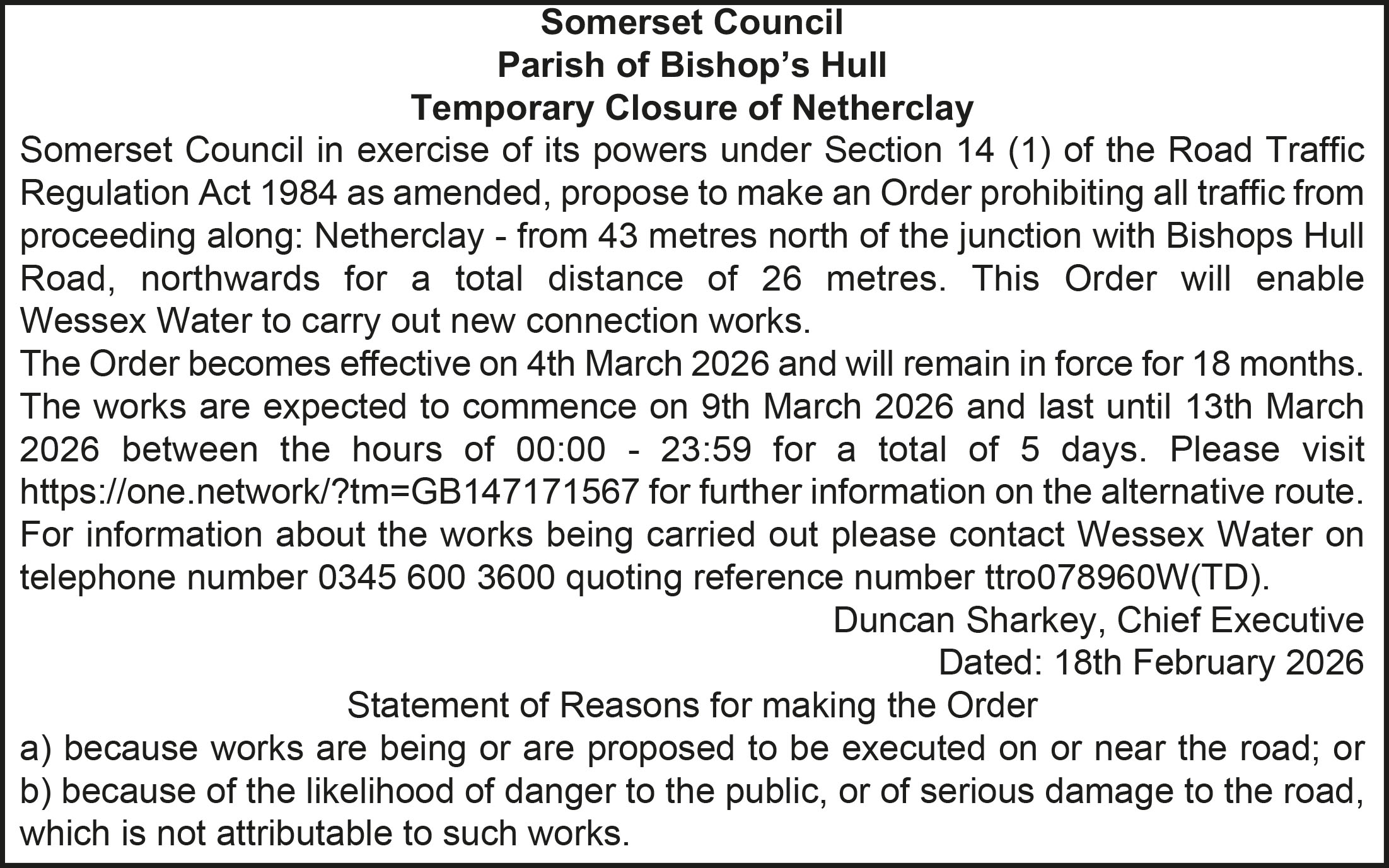 Somerset Council in exercise of its powers under Section 14 (1) of the Road Traffic Regulation Act 1984 as amended, propose to make an Order prohibiting all traffic from proceeding along: Netherclay – from 43 metres north of the junction with Bishops Hull Road, northwards for a total distance of 26 metres. This Order will enable Wessex Water to carry out new connection works.