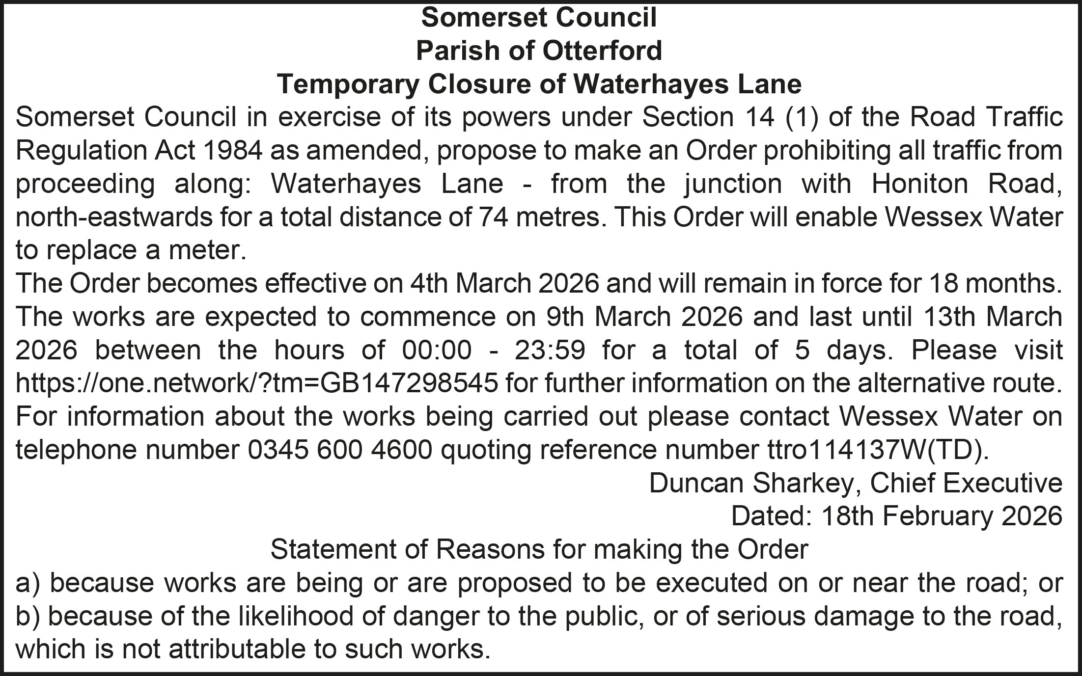 Somerset Council in exercise of its powers under Section 14 (1) of the Road Traffic Regulation Act 1984 as amended, propose to make an Order prohibiting all traffic from proceeding along: Waterhayes Lane – from the junction with Honiton Road, north-eastwards for a total distance of 74 metres. This Order will enable Wessex Water to replace a meter.
