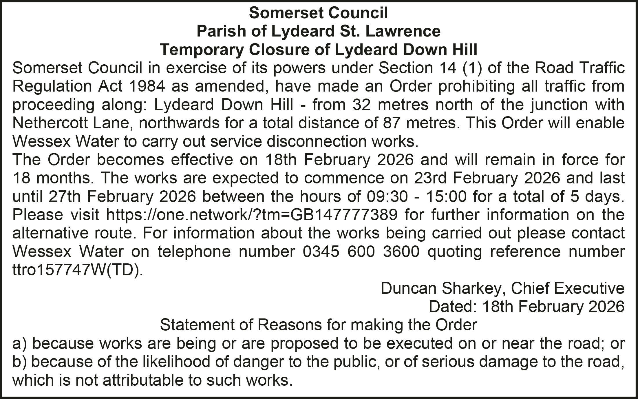 Somerset Council in exercise of its powers under Section 14 (1) of the Road Traffic Regulation Act 1984 as amended, have made an Order prohibiting all traffic from proceeding along: Lydeard Down Hill – from 32 metres north of the junction with Nethercott Lane, northwards for a total distance of 87 metres. This Order will enable Wessex Water to carry out service disconnection works.