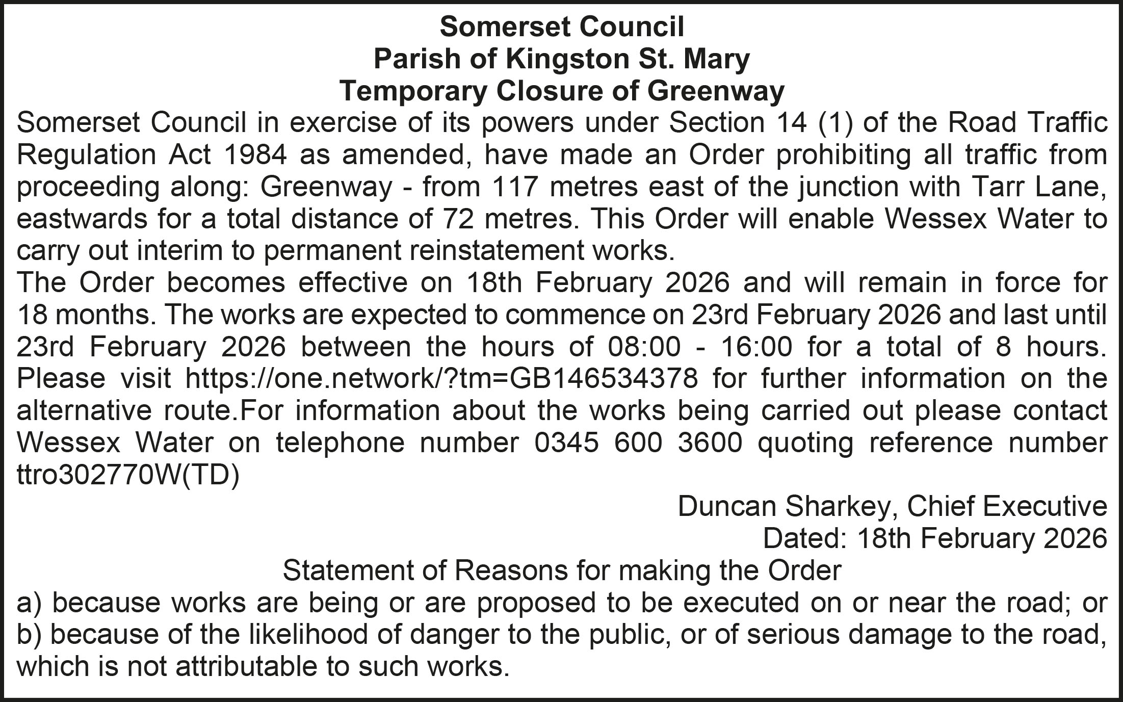 Somerset Council in exercise of its powers under Section 14 (1) of the Road Traffic Regulation Act 1984 as amended, have made an Order prohibiting all traffic from proceeding along: Greenway – from 117 metres east of the junction with Tarr Lane, eastwards for a total distance of 72 metres. This Order will enable Wessex Water to carry out interim to permanent reinstatement works.
