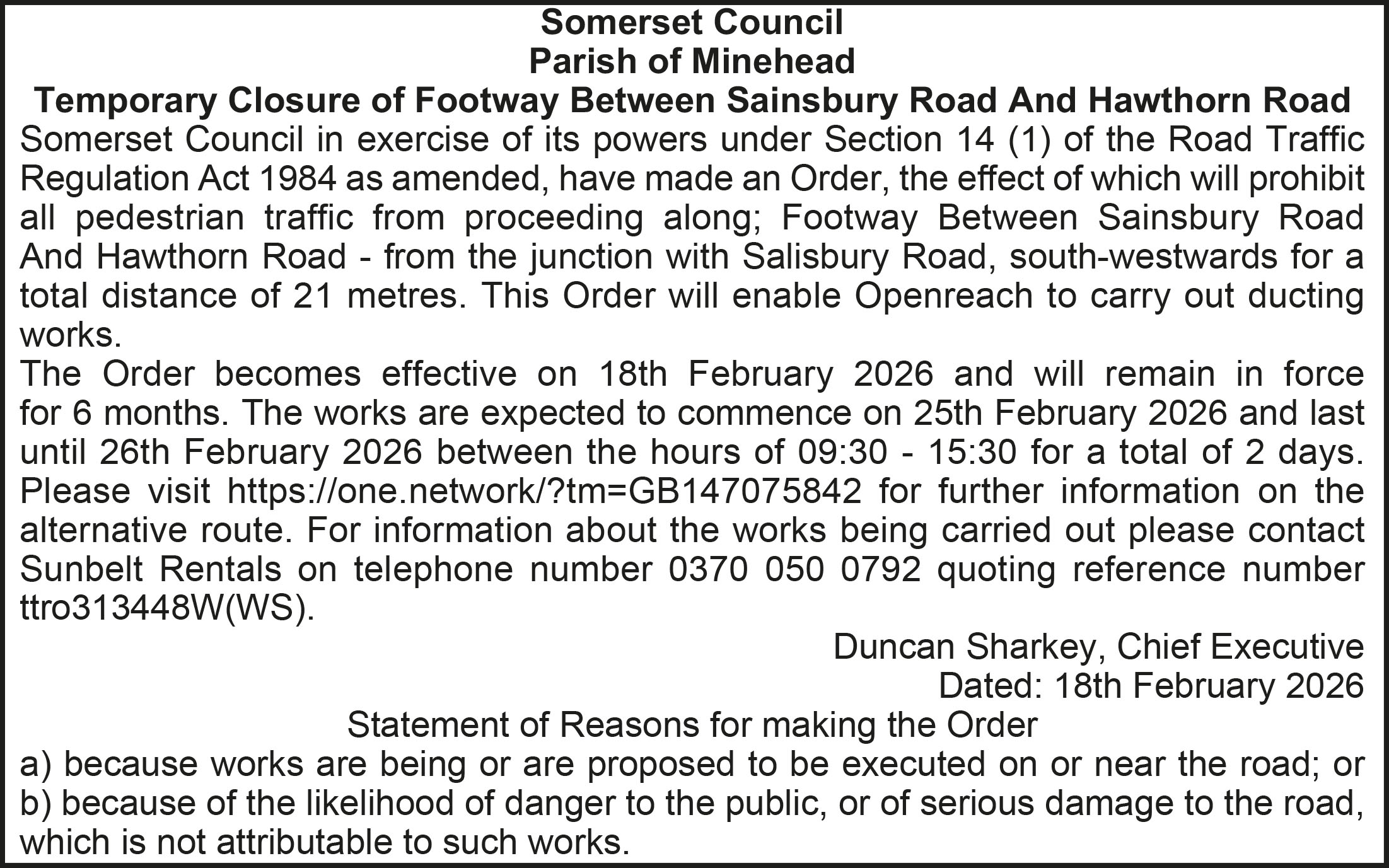 The Order becomes effective on 4th March 2026 and will remain in force for 18 months. The works are expected to commence on 9th March 2026 and last until 15th March 2026 between the hours of 08:00 – 17:00 for a total of 7 days. Please visit https://one.network/?tm=GB147232732 for further information on the alternative route. For information about the works being carried out please contact C J Lynch and Sons (Minehead) Ltd on telephone number 01643 704 124 quoting reference number ttro441062W(WS).