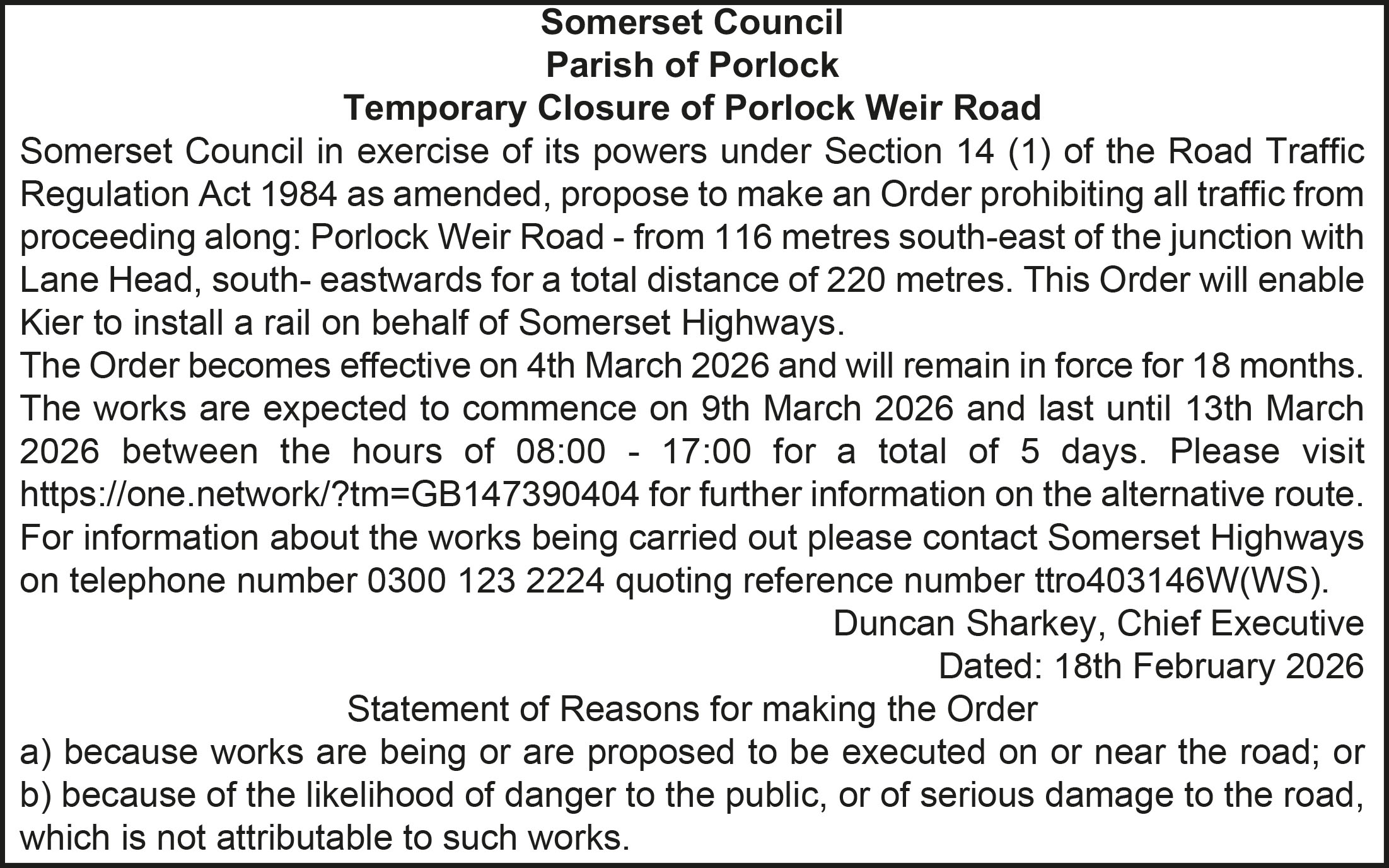Somerset Council in exercise of its powers under Section 14 (1) of the Road Traffic Regulation Act 1984 as amended, propose to make an Order prohibiting all traffic from proceeding along: Porlock Weir Road – from 116 metres south-east of the junction with Lane Head, south- eastwards for a total distance of 220 metres. This Order will enable Kier to install a rail on behalf of Somerset Highways.