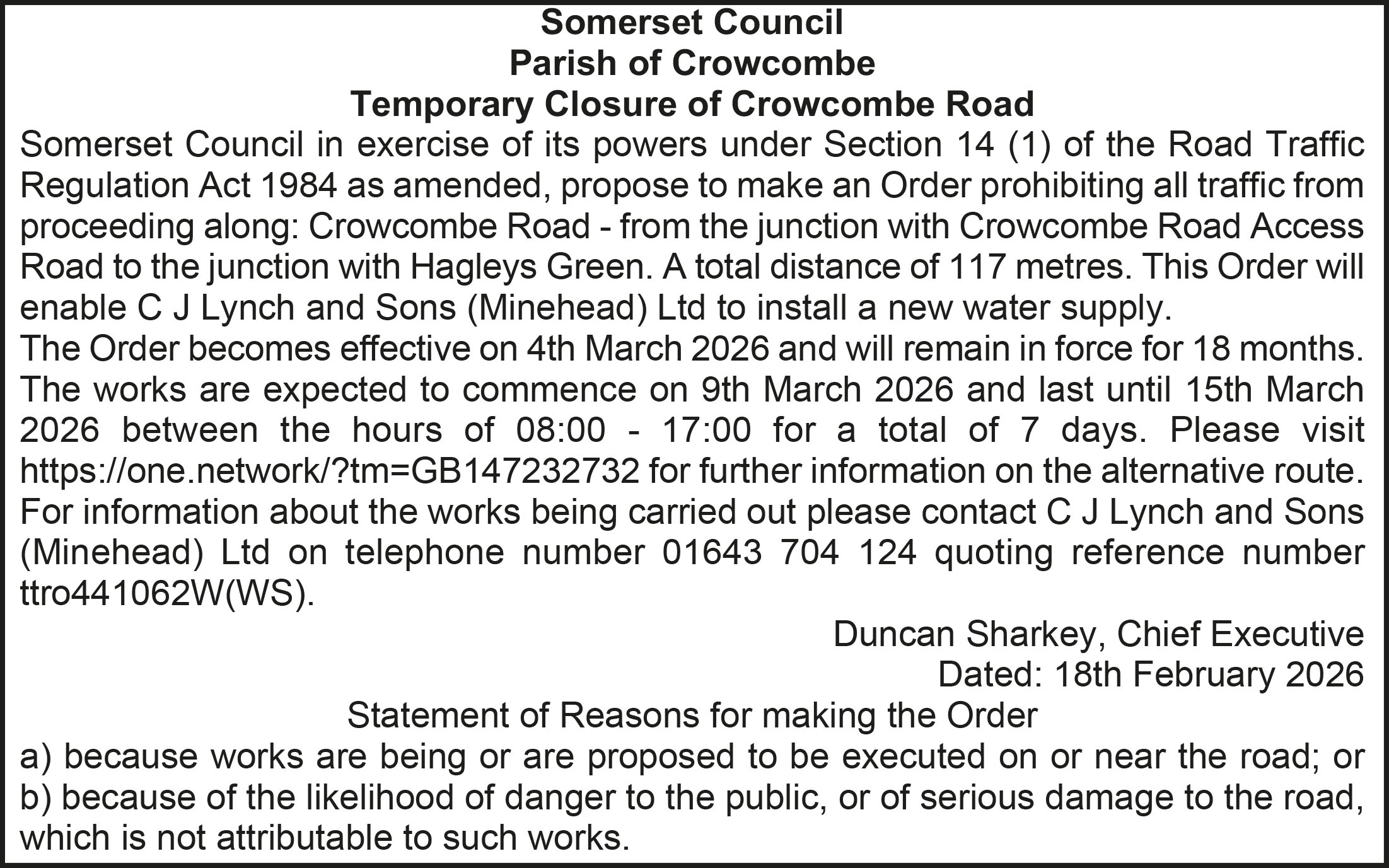 Somerset Council in exercise of its powers under Section 14 (1) of the Road Traffic Regulation Act 1984 as amended, propose to make an Order prohibiting all traffic from proceeding along: Crowcombe Road – from the junction with Crowcombe Road Access Road to the junction with Hagleys Green. A total distance of 117 metres. This Order will enable C J Lynch and Sons (Minehead) Ltd to install a new water supply.