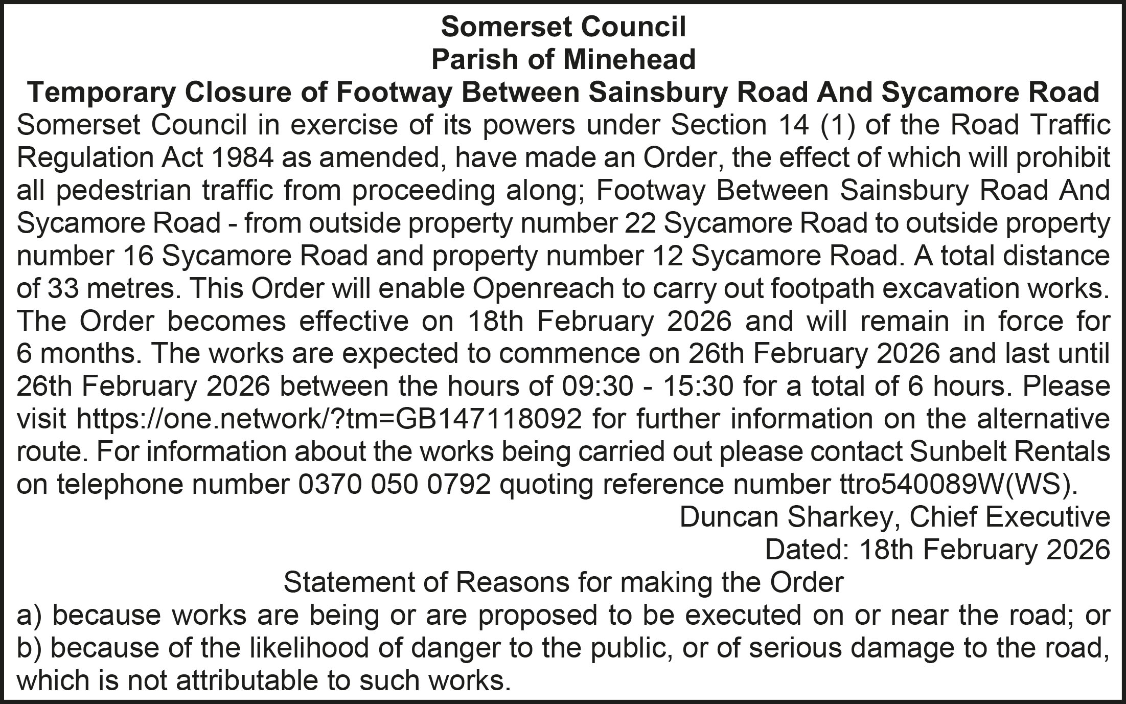 Somerset Council in exercise of its powers under Section 14 (1) of the Road Traffic Regulation Act 1984 as amended, have made an Order, the effect of which will prohibit all pedestrian traffic from proceeding along; Footway Between Sainsbury Road And Sycamore Road – from outside property number 22 Sycamore Road to outside property number 16 Sycamore Road and property number 12 Sycamore Road. A total distance of 33 metres. This Order will enable Openreach to carry out footpath excavation works.
