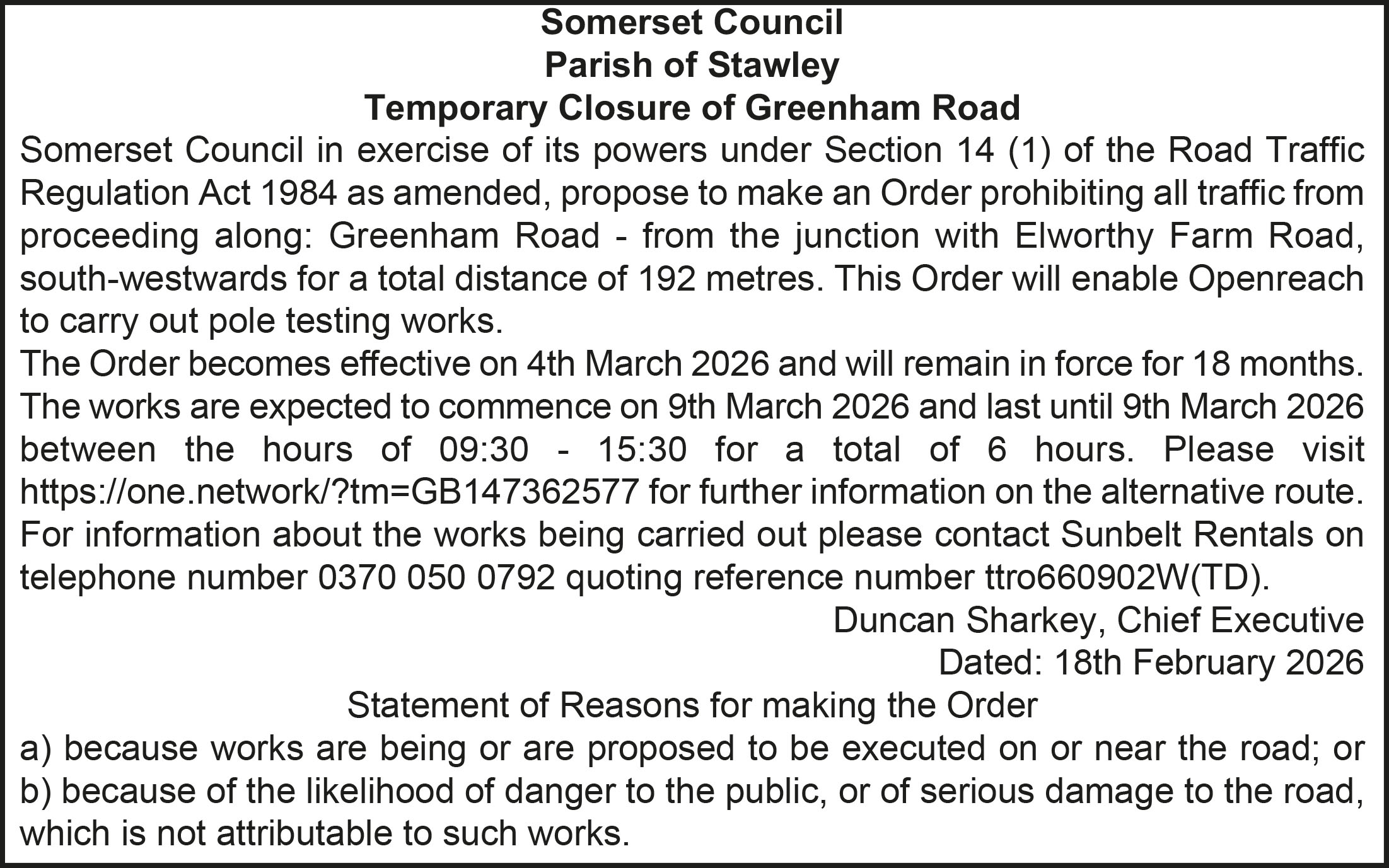 Somerset Council in exercise of its powers under Section 14 (1) of the Road Traffic Regulation Act 1984 as amended, propose to make an Order prohibiting all traffic from proceeding along: Greenham Road – from the junction with Elworthy Farm Road, south-westwards for a total distance of 192 metres. This Order will enable Openreach to carry out pole testing works.