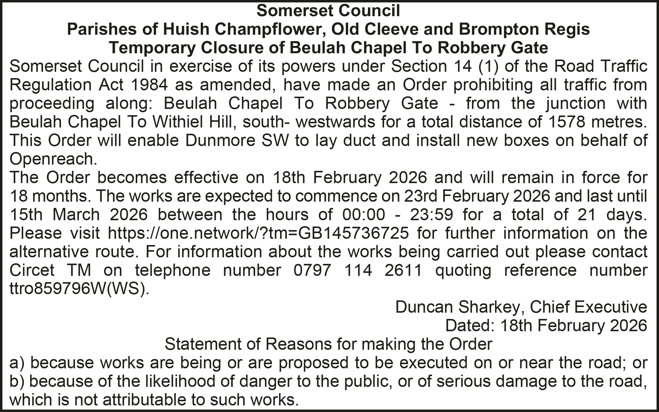 Somerset Council in exercise of its powers under Section 14 (1) of the Road Traffic Regulation Act 1984 as amended, have made an Order prohibiting all traffic from proceeding along: Beulah Chapel To Robbery Gate – from the junction with Beulah Chapel To Withiel Hill, south- westwards for a total distance of 1578 metres. This Order will enable Dunmore SW to lay duct and install new boxes on behalf of Openreach.