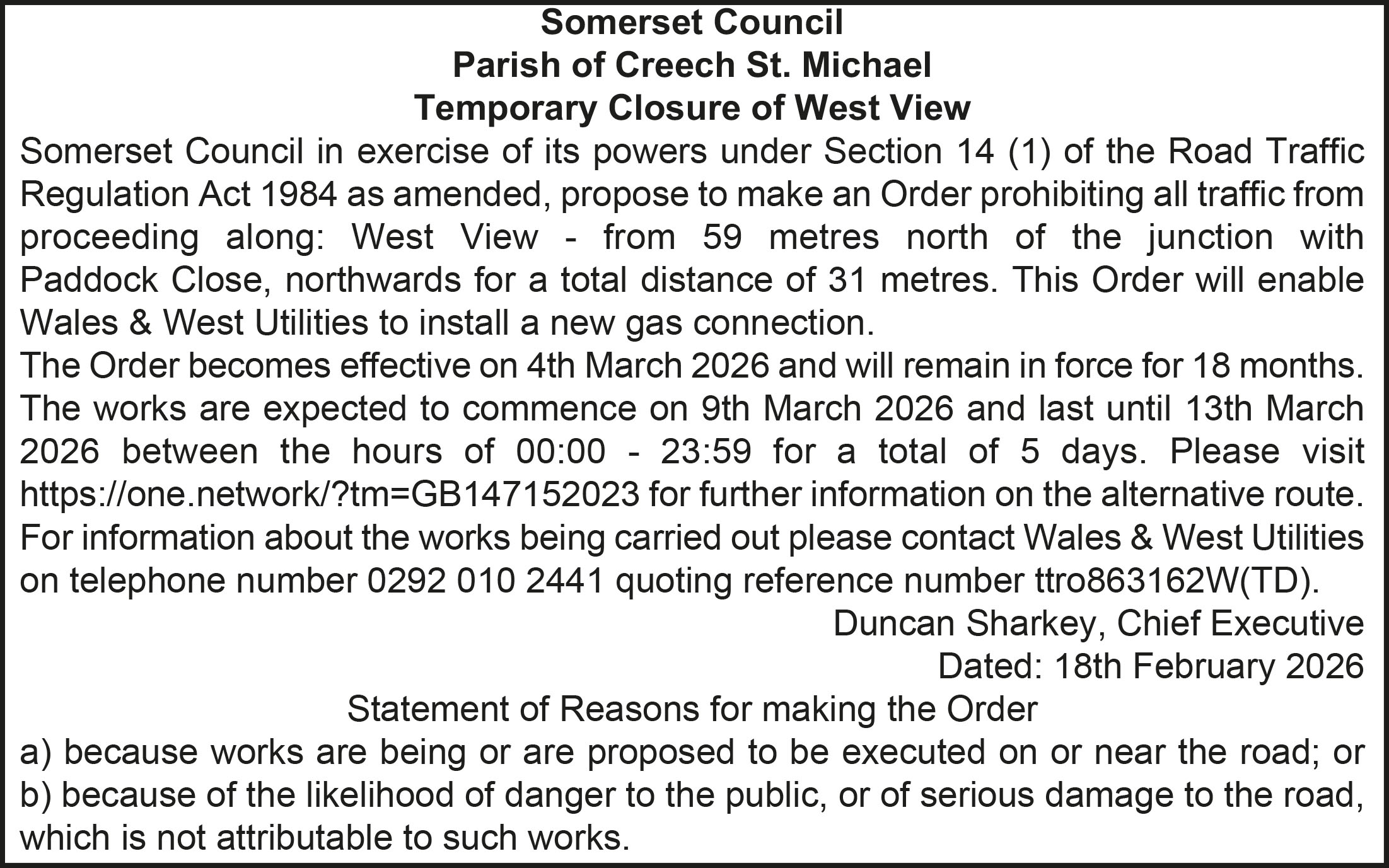 Somerset Council in exercise of its powers under Section 14 (1) of the Road Traffic Regulation Act 1984 as amended, propose to make an Order prohibiting all traffic from proceeding along: West View – from 59 metres north of the junction with Paddock Close, northwards for a total distance of 31 metres. This Order will enable Wales & West Utilities to install a new gas connection.
