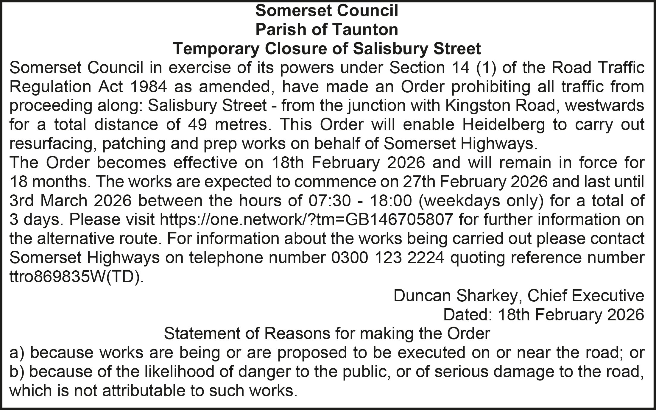 Somerset Council in exercise of its powers under Section 14 (1) of the Road Traffic Regulation Act 1984 as amended, have made an Order prohibiting all traffic from proceeding along: Salisbury Street – from the junction with Kingston Road, westwards for a total distance of 49 metres. This Order will enable Heidelberg to carry out resurfacing, patching and prep works on behalf of Somerset Highways.