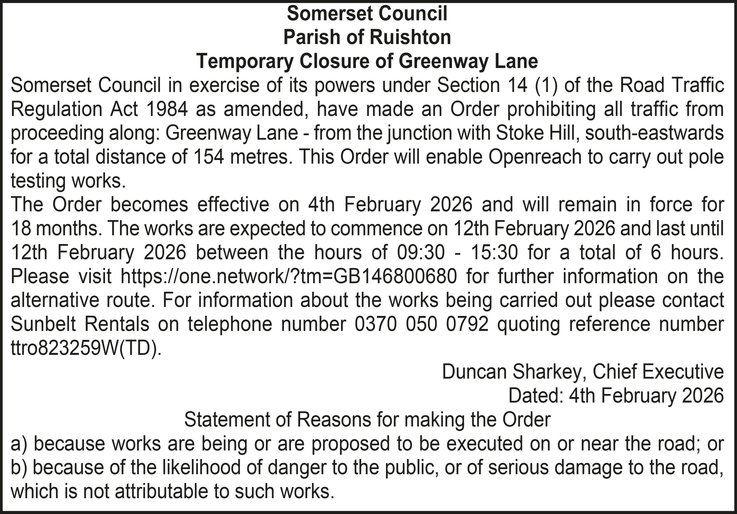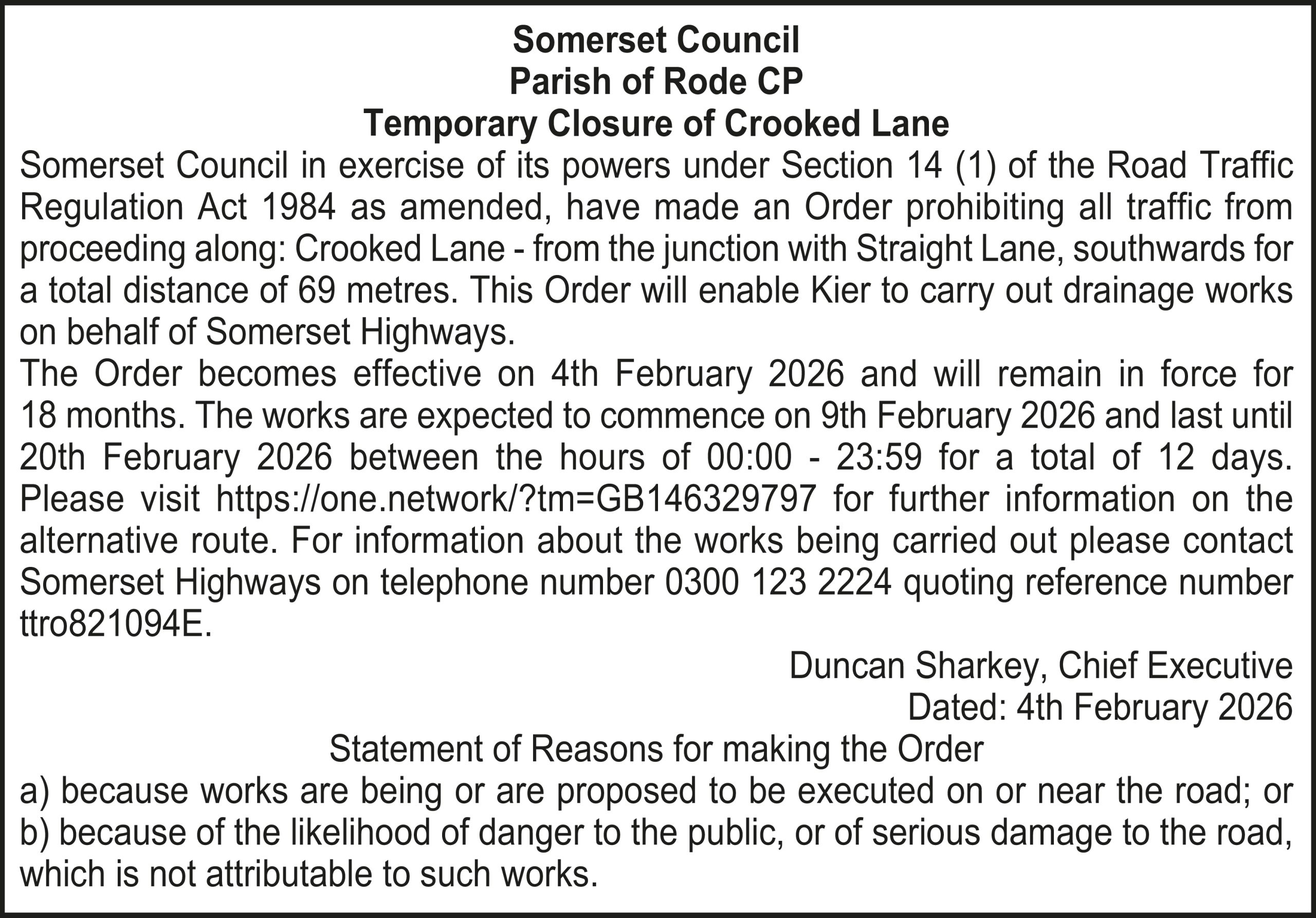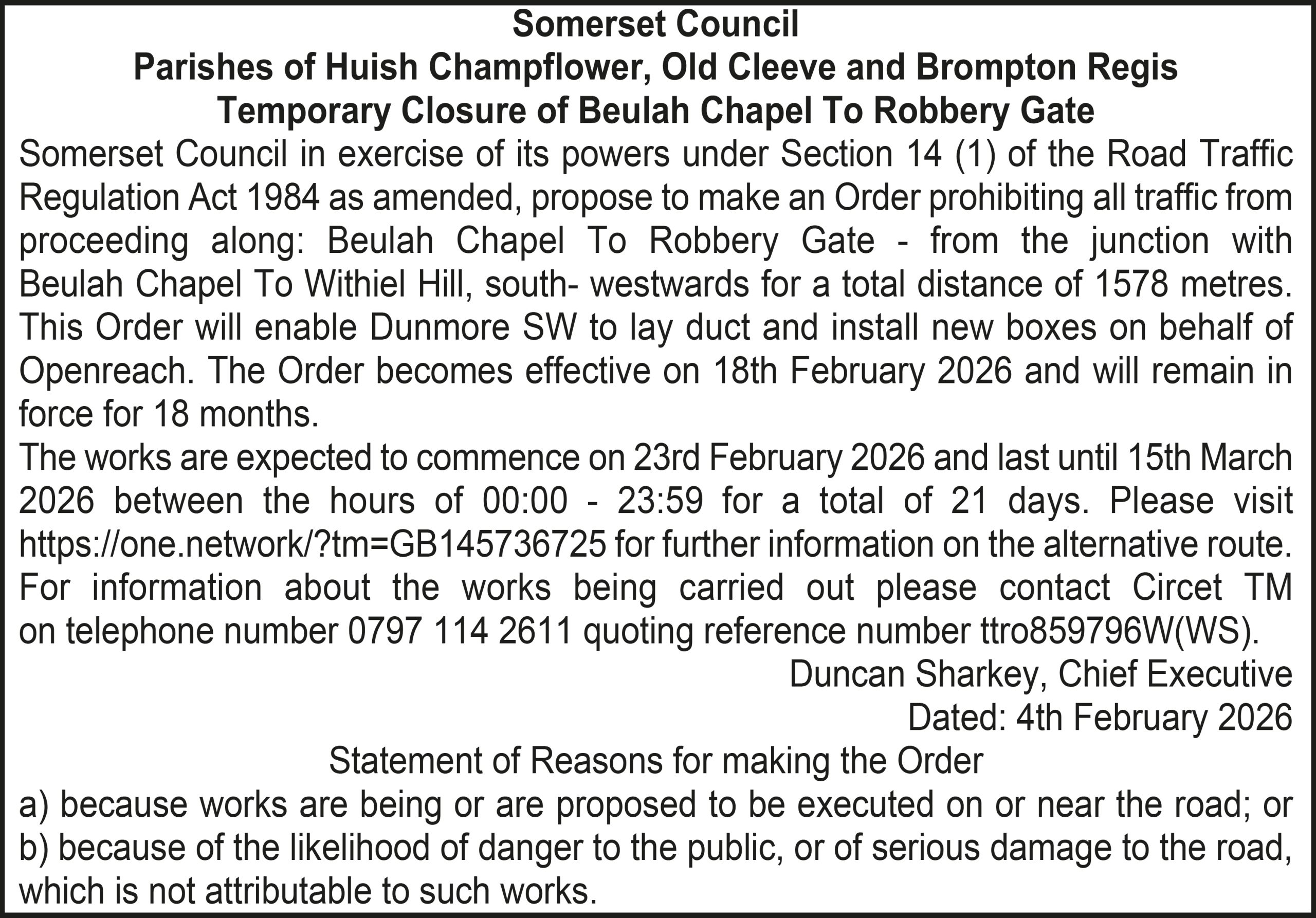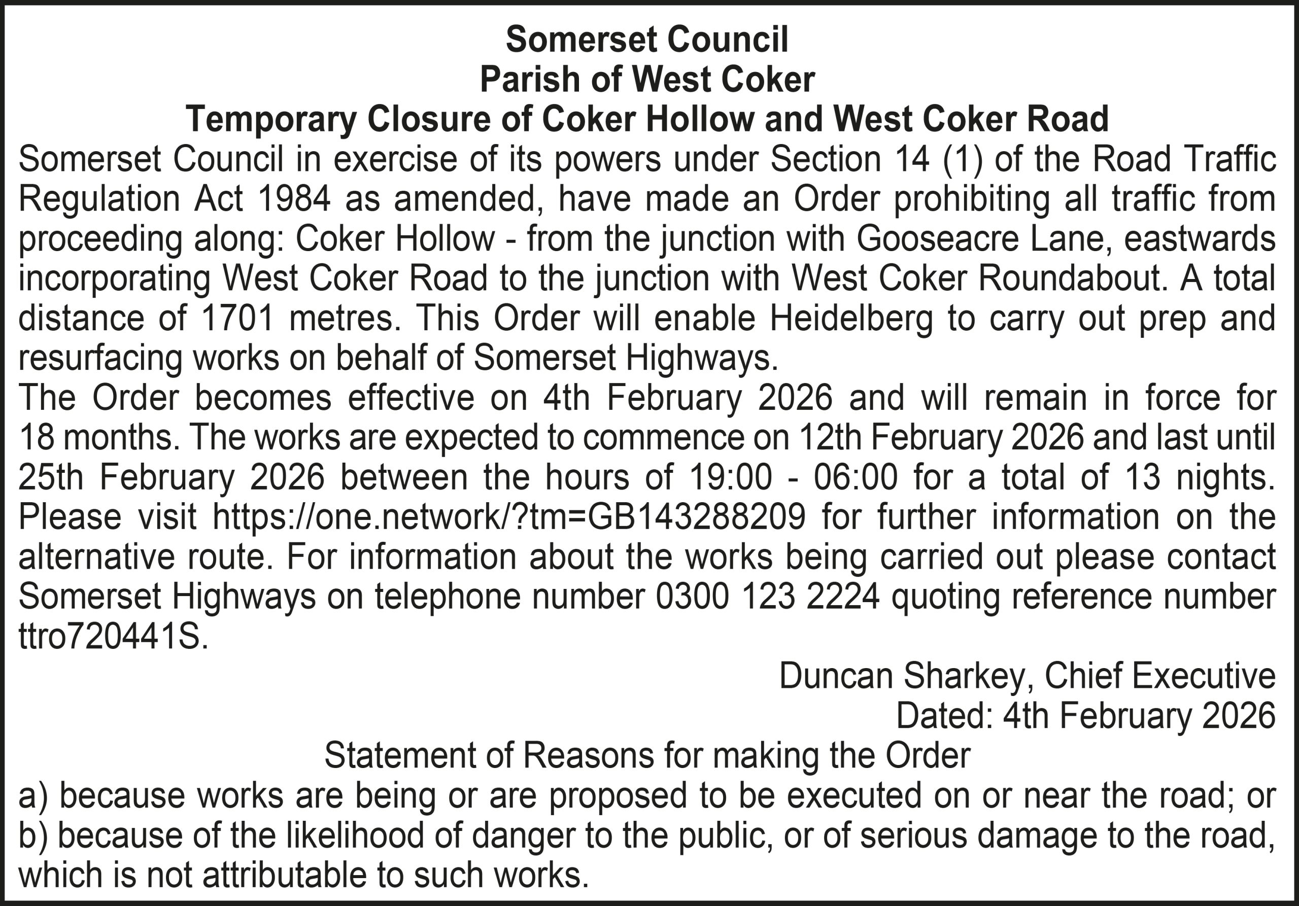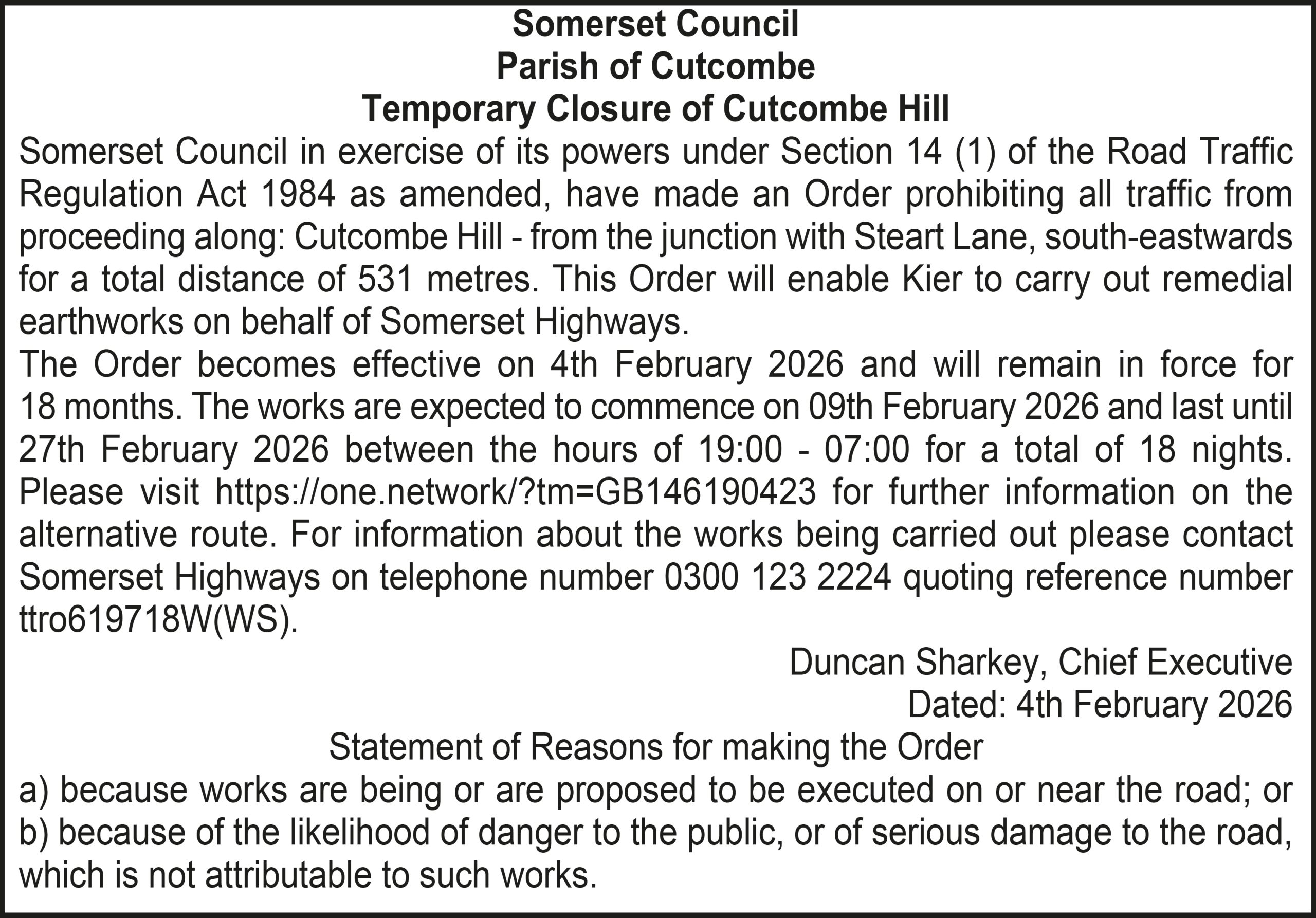 The Order becomes effective on 18th February 2026 and will remain in force for 18 months. The works are expected to commence on 23rd February 2026 and last until 20th March 2026 between the hours of 00:00 – 23:59 for a total of 26 days. Please visit https://one.network/?tm=GB147074211 for further information on the alternative route. For information about the works being carried out please contact Somerset Highways on telephone number 0300 123 2224 quoting reference number ttro153140N.