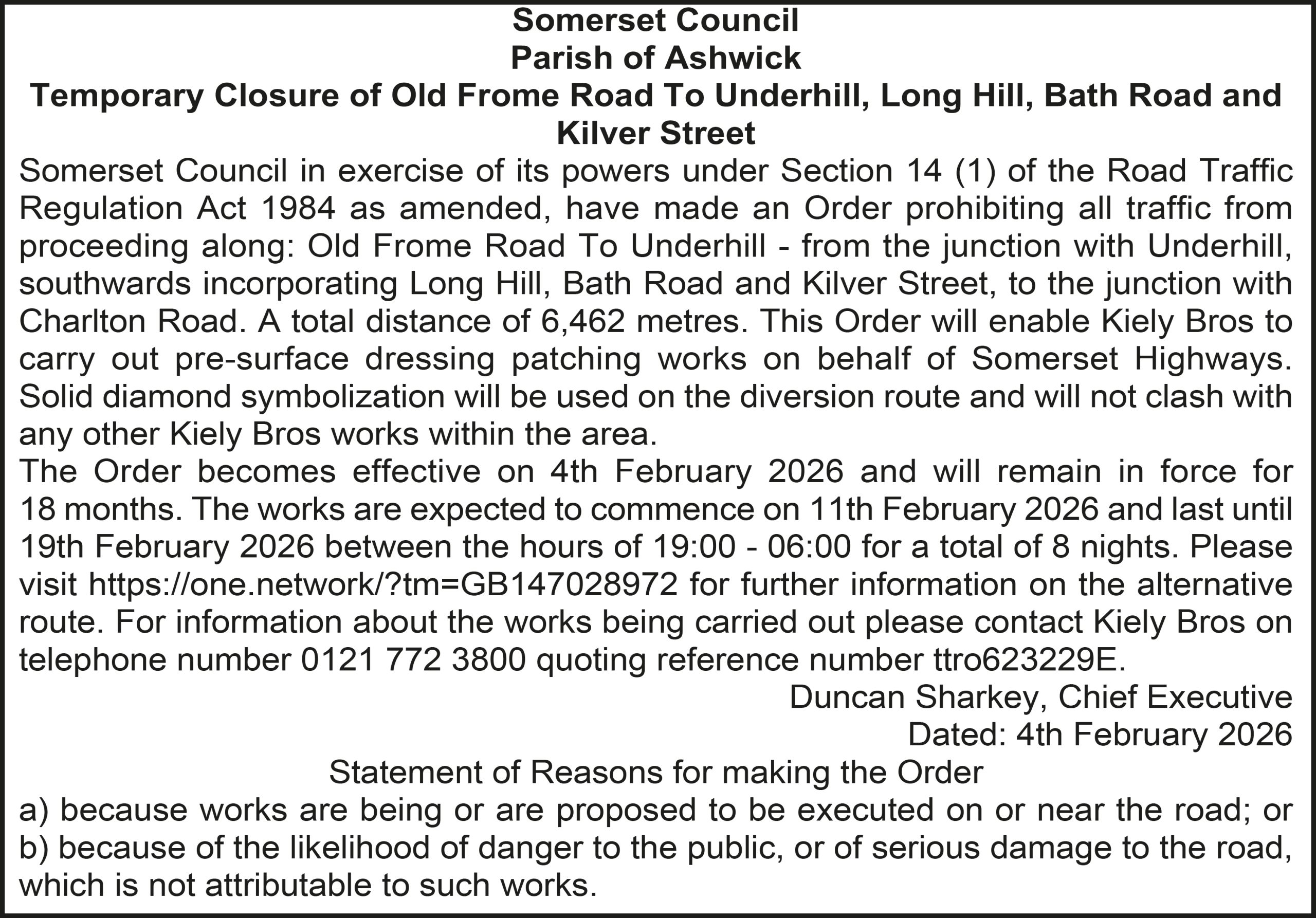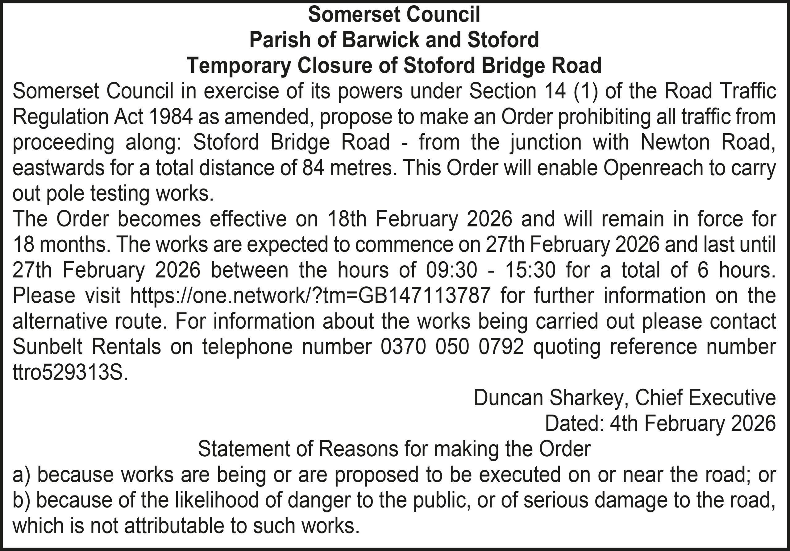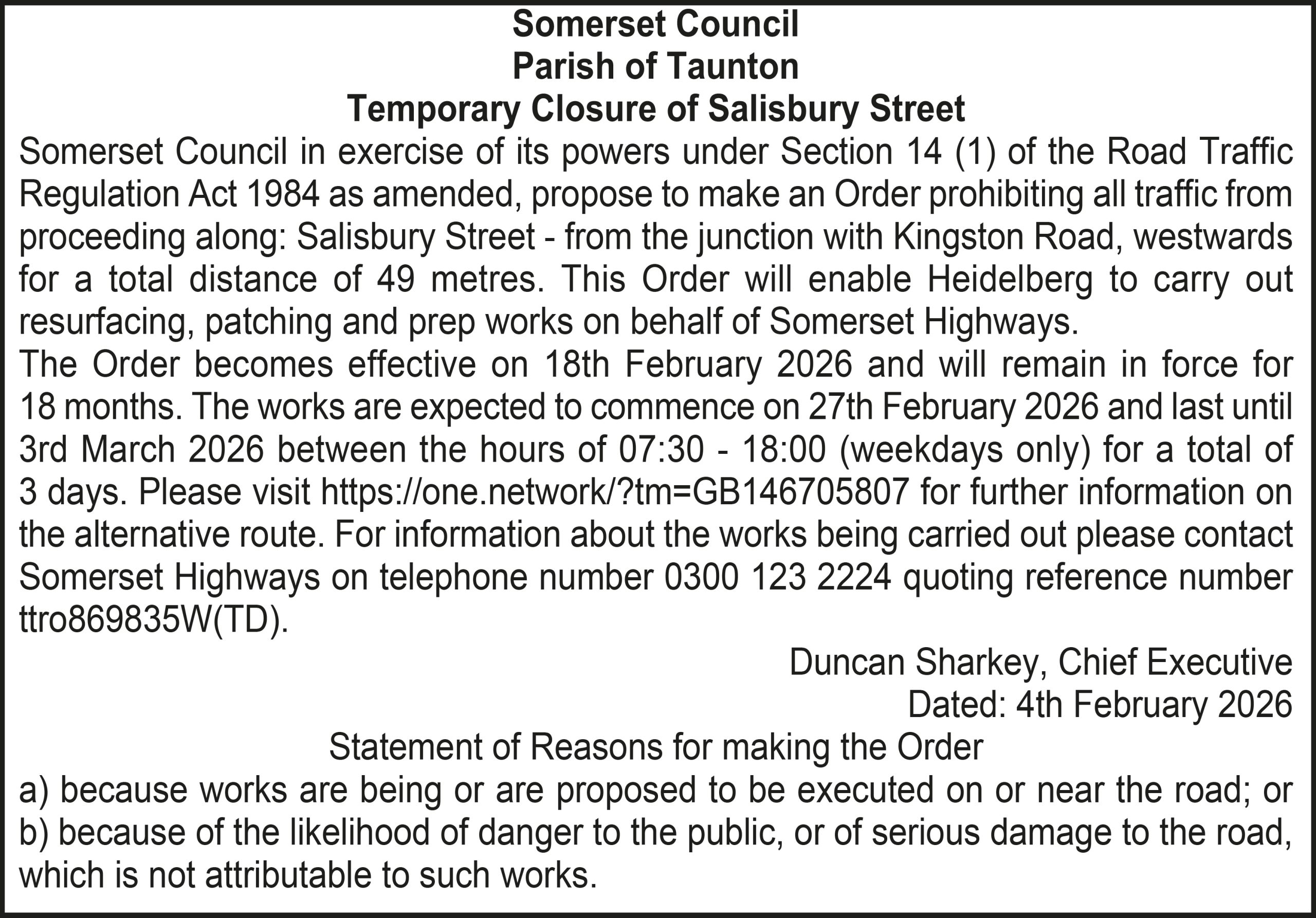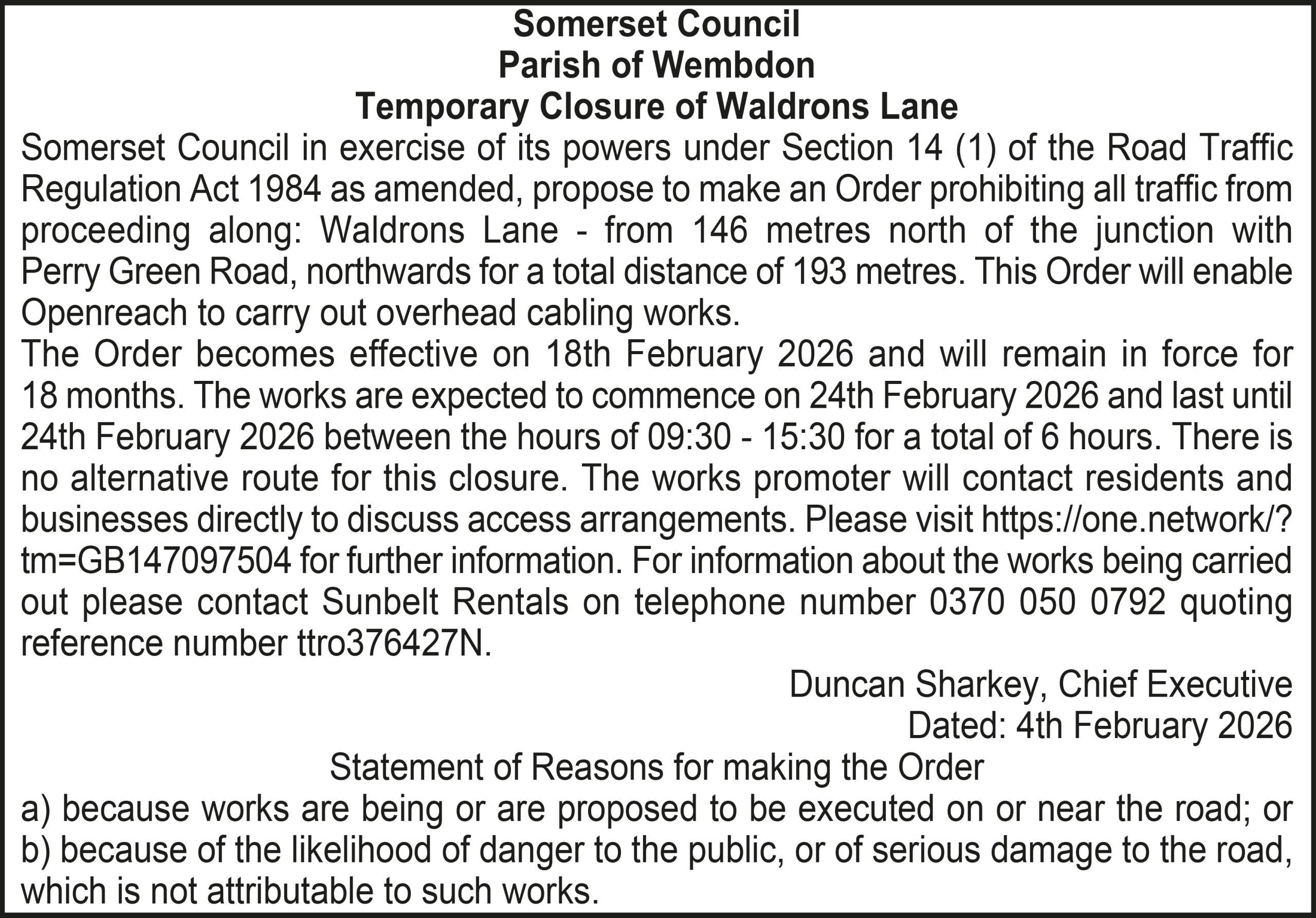 The Order becomes effective on 18th February 2026 and will remain in force for 18 months. The works are expected to commence on 23rd February 2026 and last until 20th March 2026 between the hours of 00:00 – 23:59 for a total of 26 days. Please visit https://one.network/?tm=GB147074211 for further information on the alternative route. For information about the works being carried out please contact Somerset Highways on telephone number 0300 123 2224 quoting reference number ttro153140N.