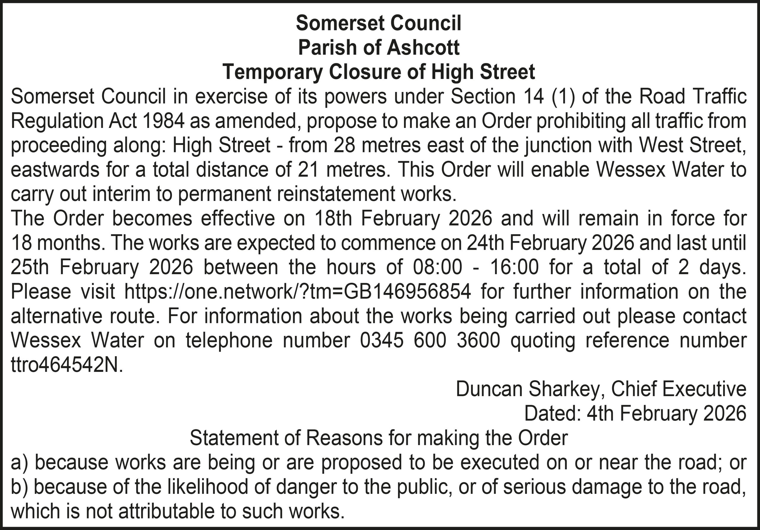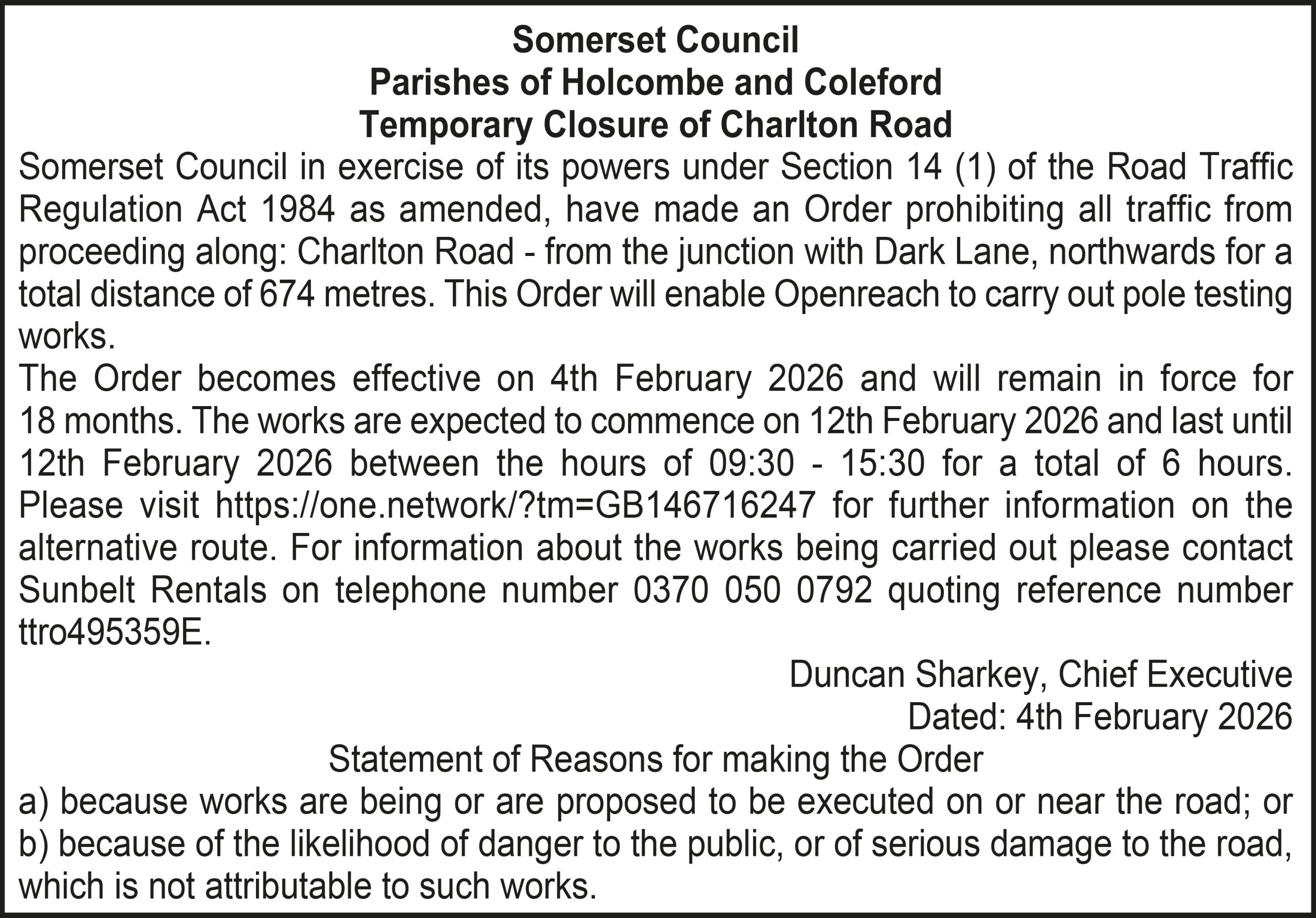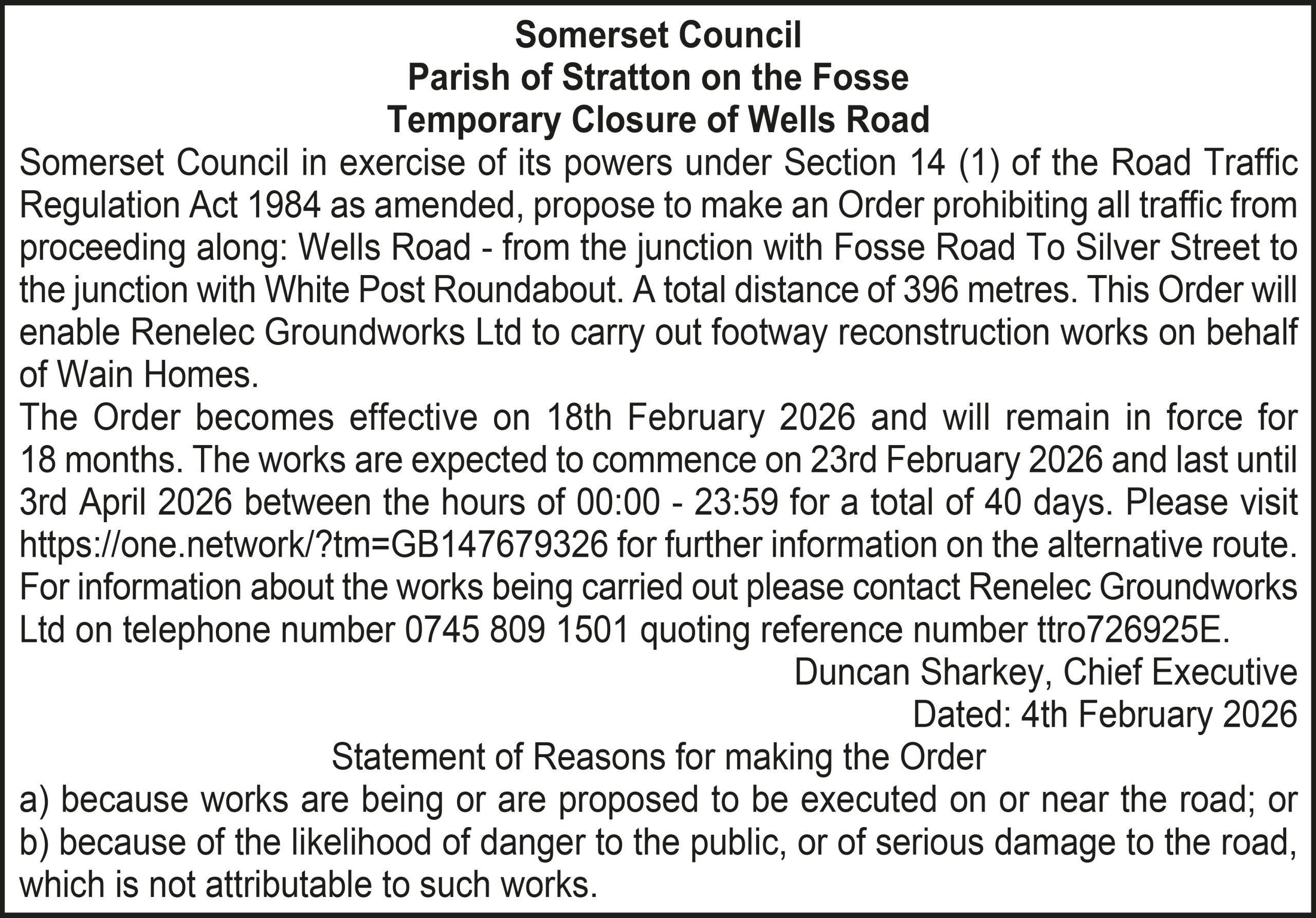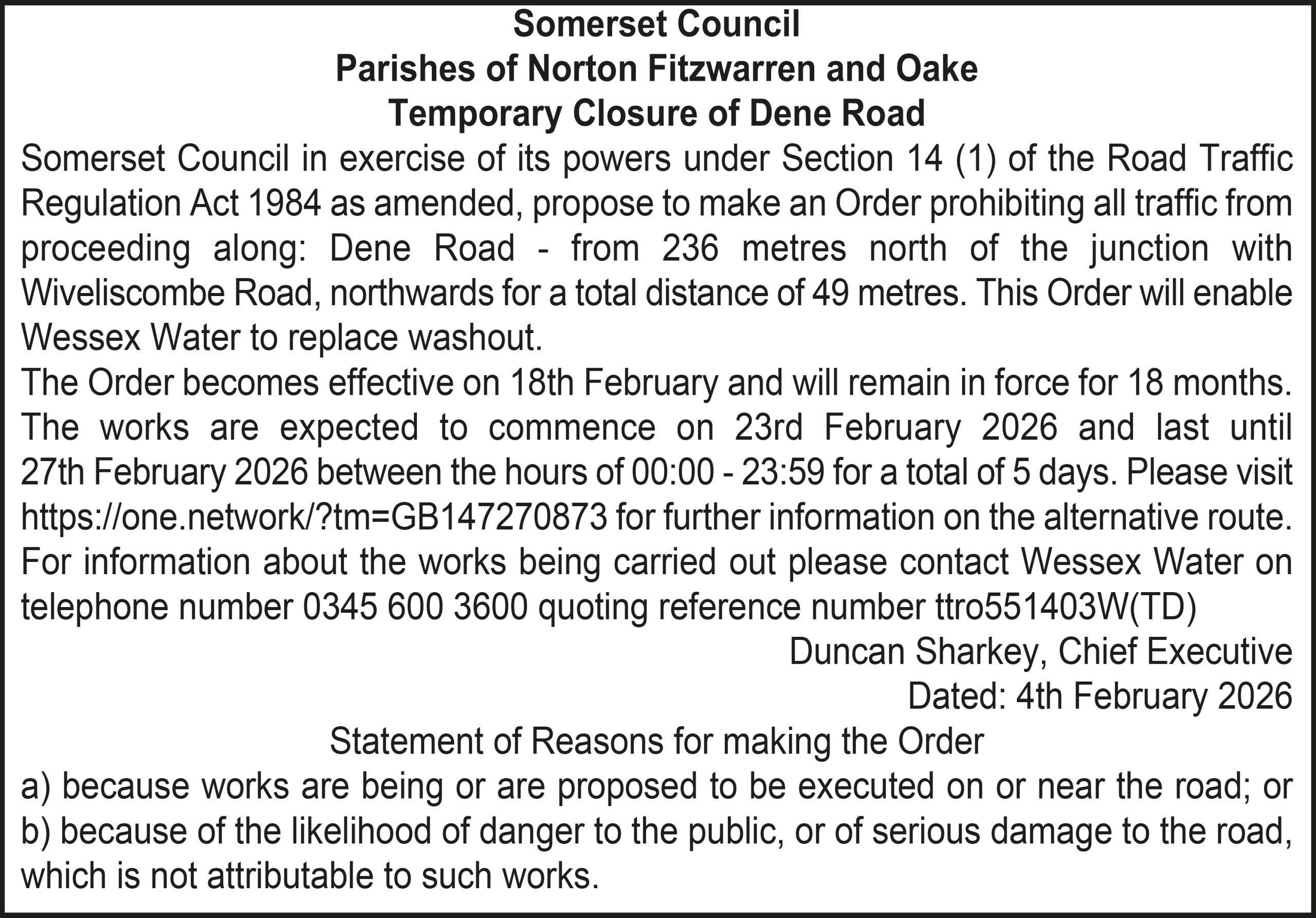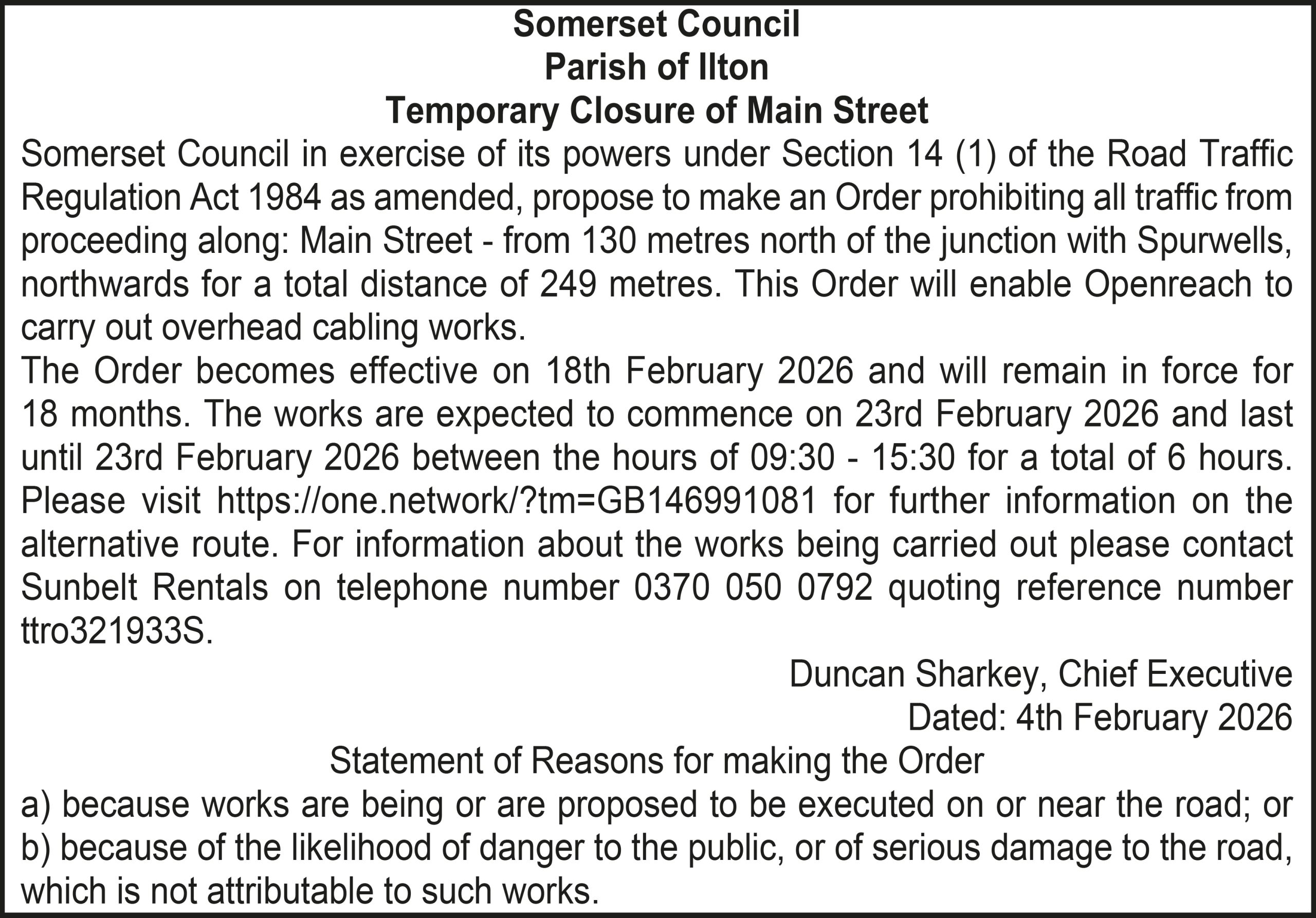 The Order becomes effective on 18th February 2026 and will remain in force for 18 months. The works are expected to commence on 23rd February 2026 and last until 20th March 2026 between the hours of 00:00 – 23:59 for a total of 26 days. Please visit https://one.network/?tm=GB147074211 for further information on the alternative route. For information about the works being carried out please contact Somerset Highways on telephone number 0300 123 2224 quoting reference number ttro153140N.