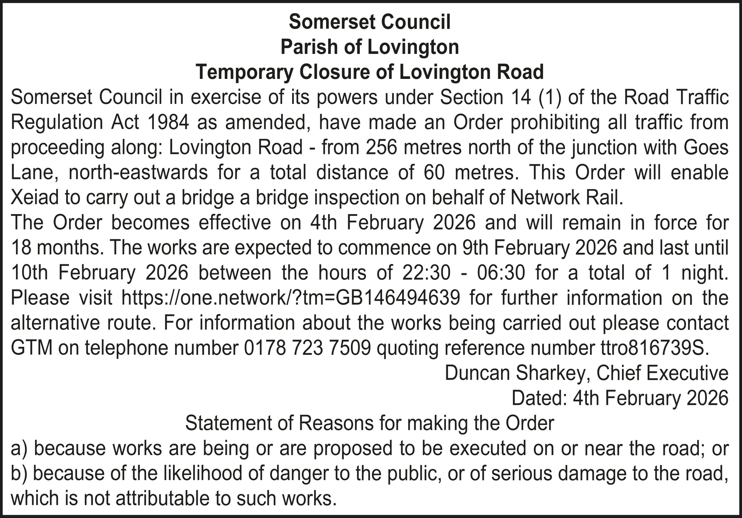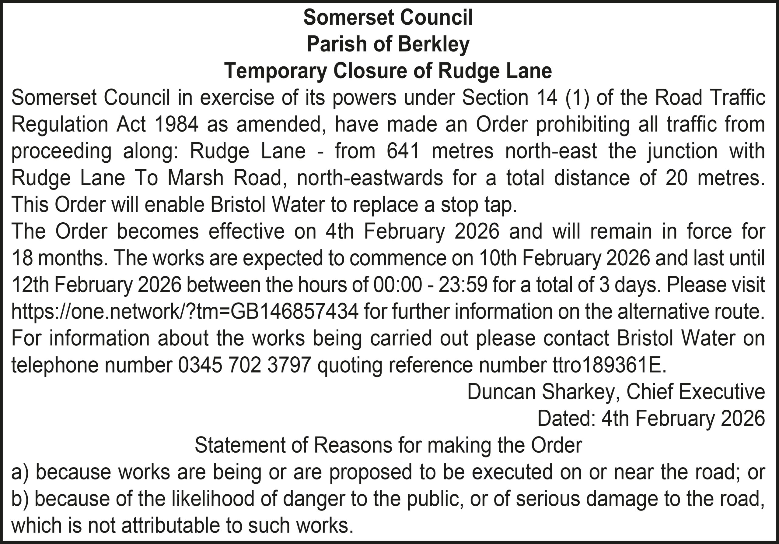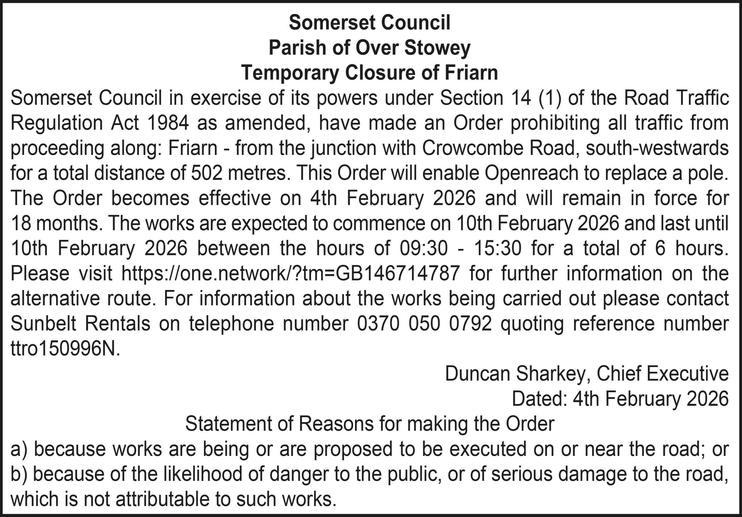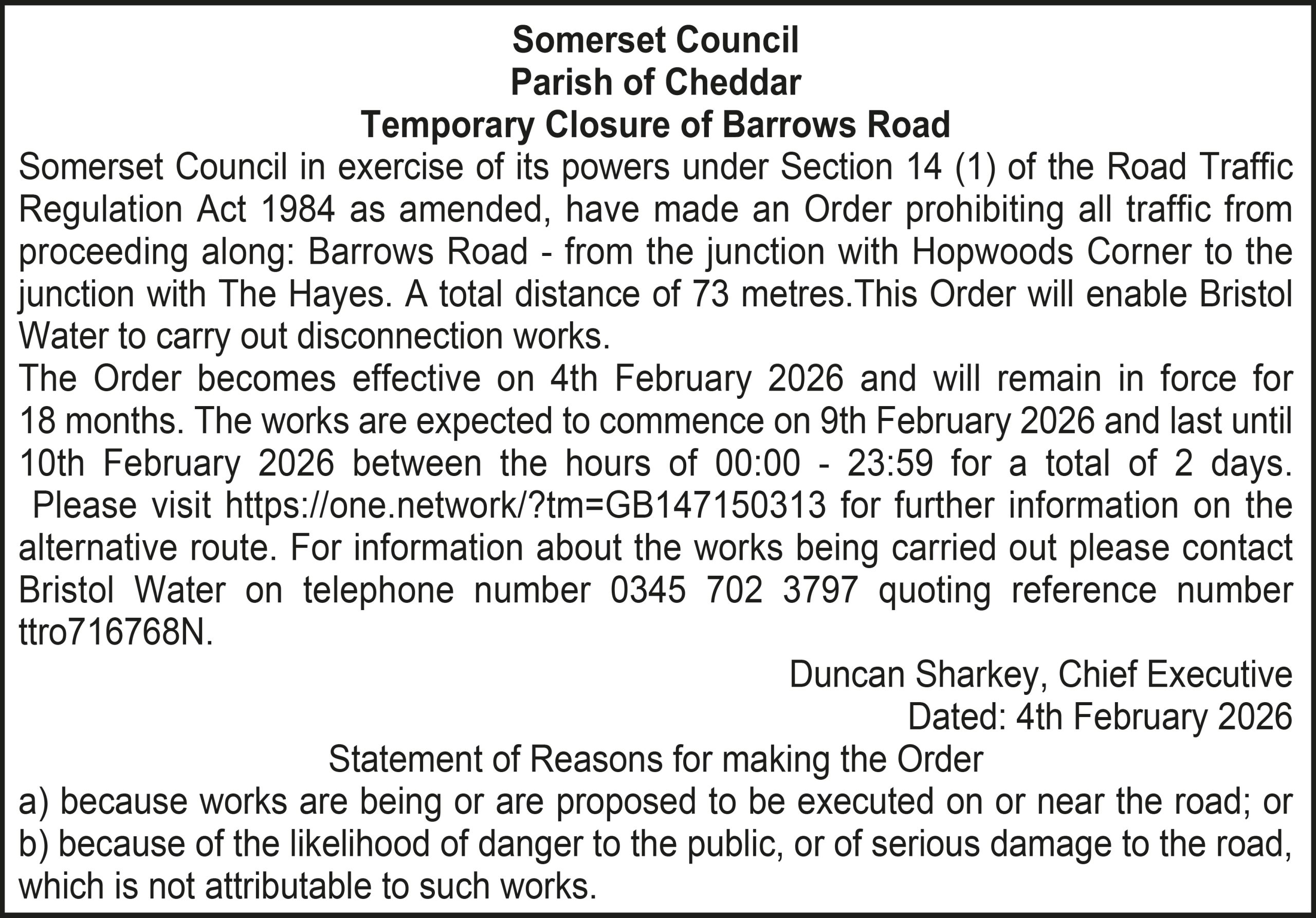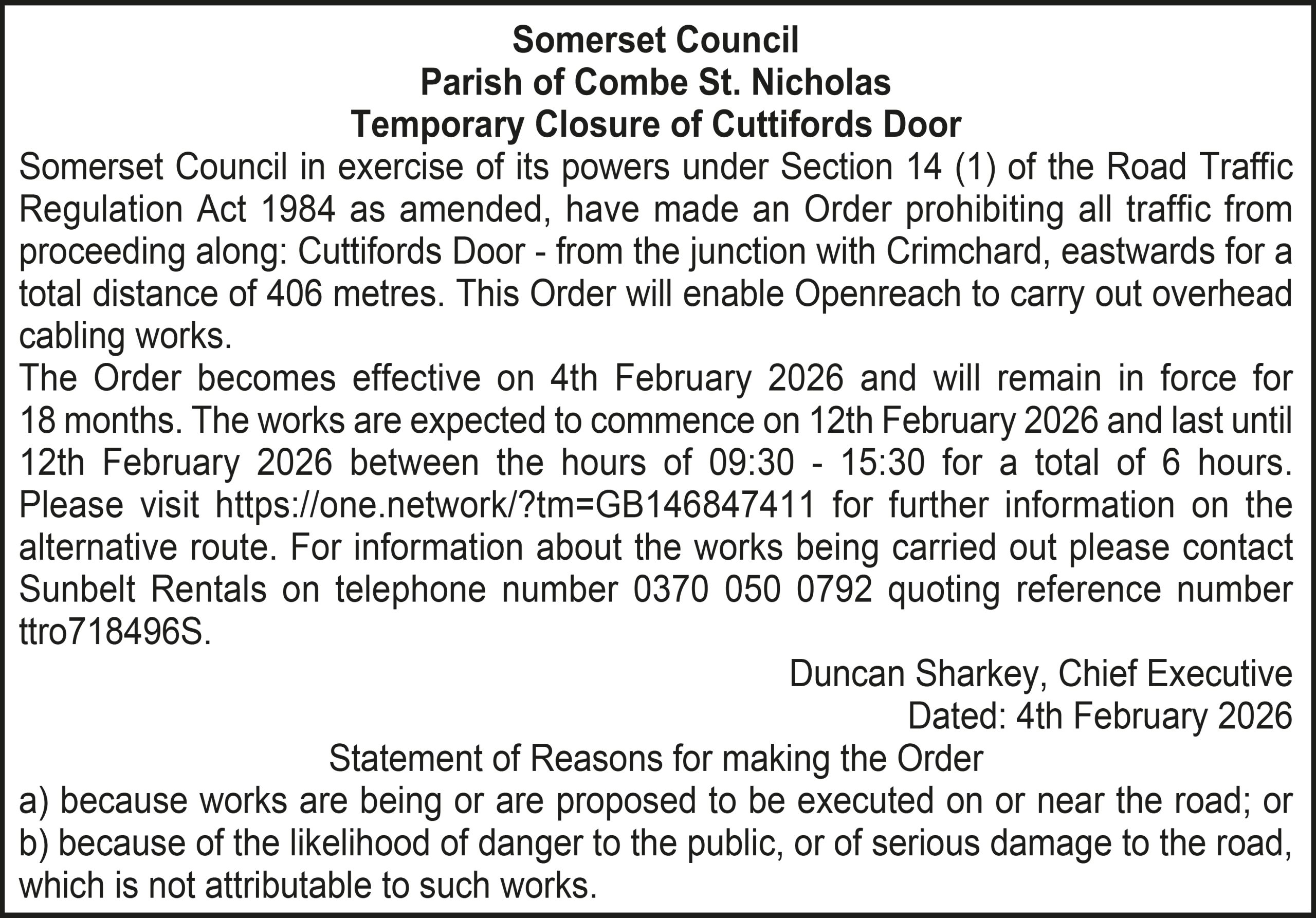 The Order becomes effective on 18th February 2026 and will remain in force for 18 months. The works are expected to commence on 23rd February 2026 and last until 20th March 2026 between the hours of 00:00 – 23:59 for a total of 26 days. Please visit https://one.network/?tm=GB147074211 for further information on the alternative route. For information about the works being carried out please contact Somerset Highways on telephone number 0300 123 2224 quoting reference number ttro153140N.
