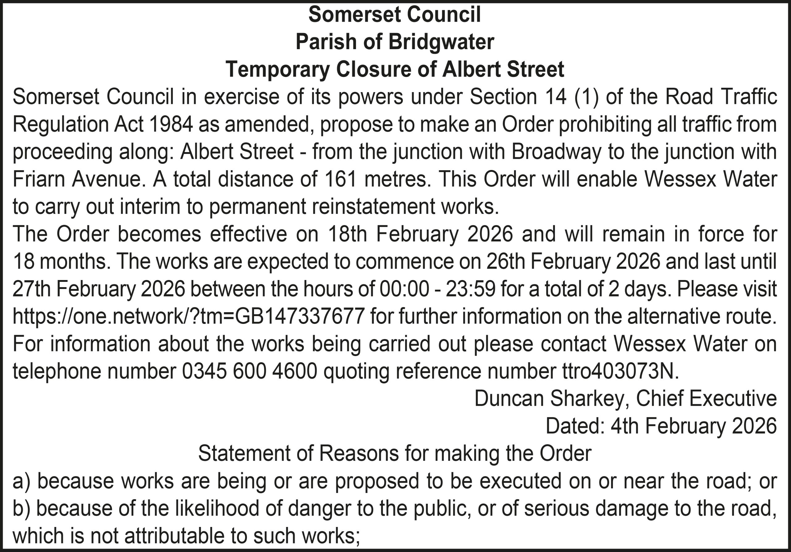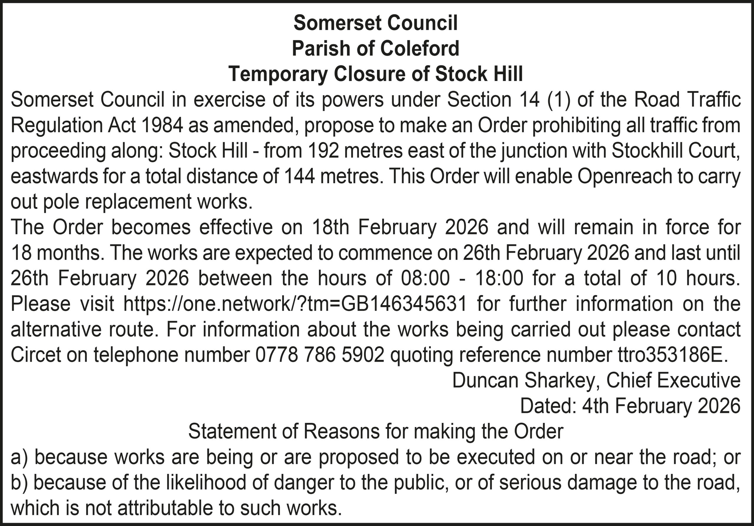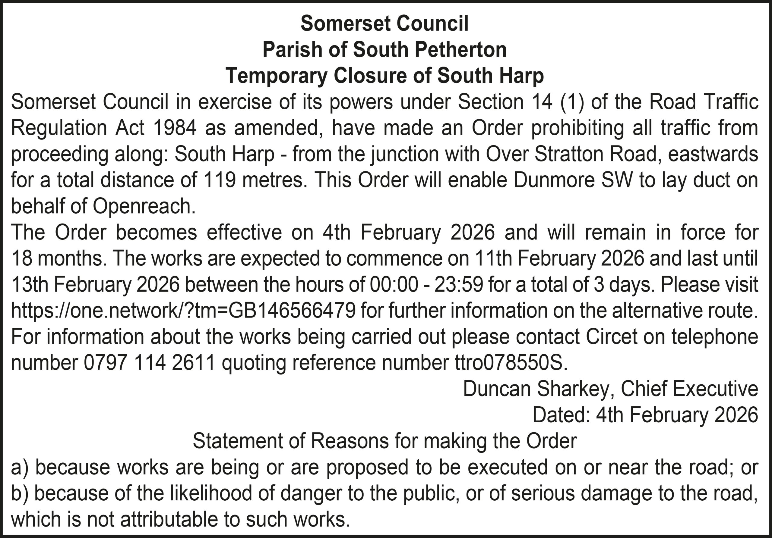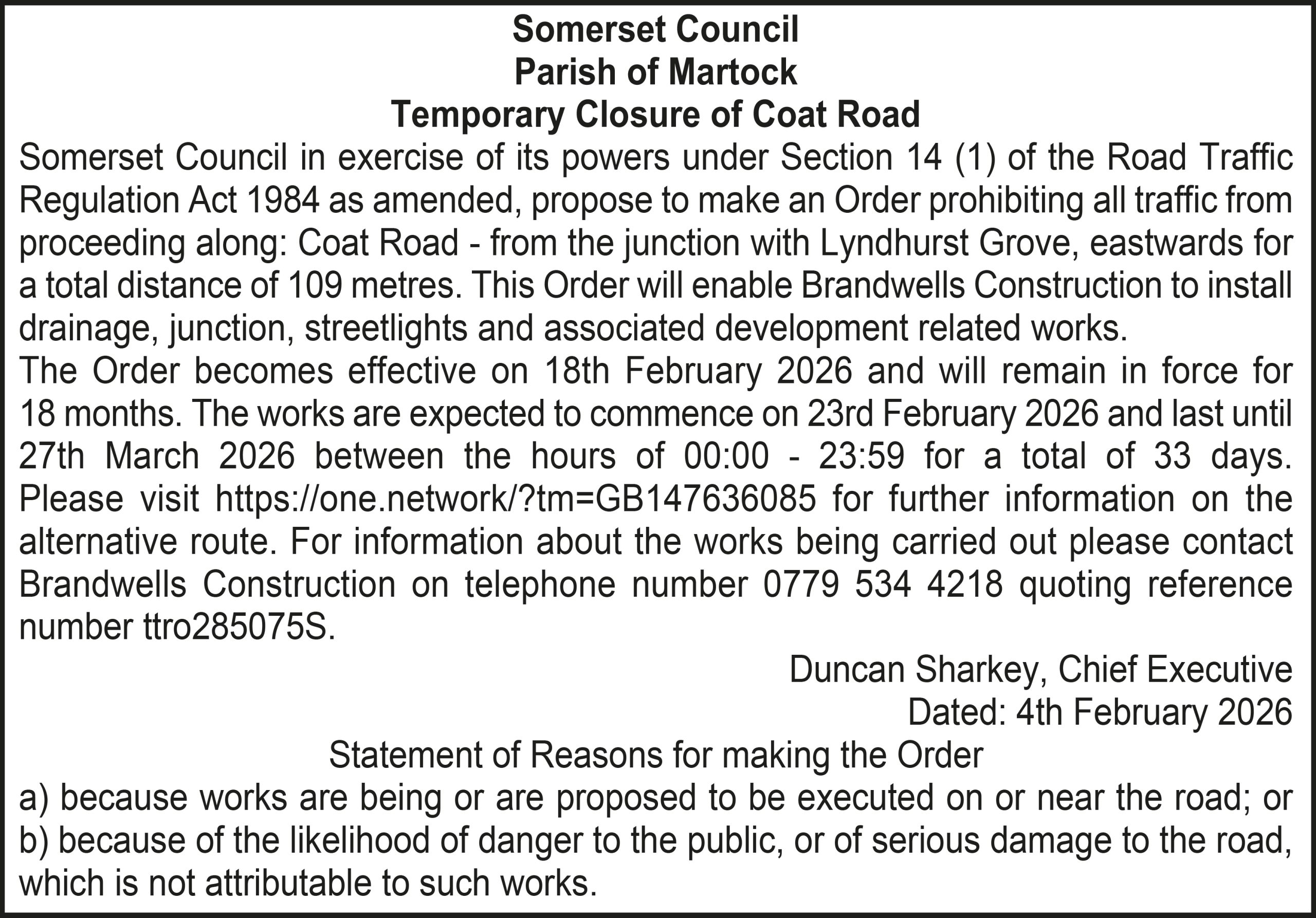 The Order becomes effective on 18th February 2026 and will remain in force for 18 months. The works are expected to commence on 23rd February 2026 and last until 20th March 2026 between the hours of 00:00 – 23:59 for a total of 26 days. Please visit https://one.network/?tm=GB147074211 for further information on the alternative route. For information about the works being carried out please contact Somerset Highways on telephone number 0300 123 2224 quoting reference number ttro153140N.