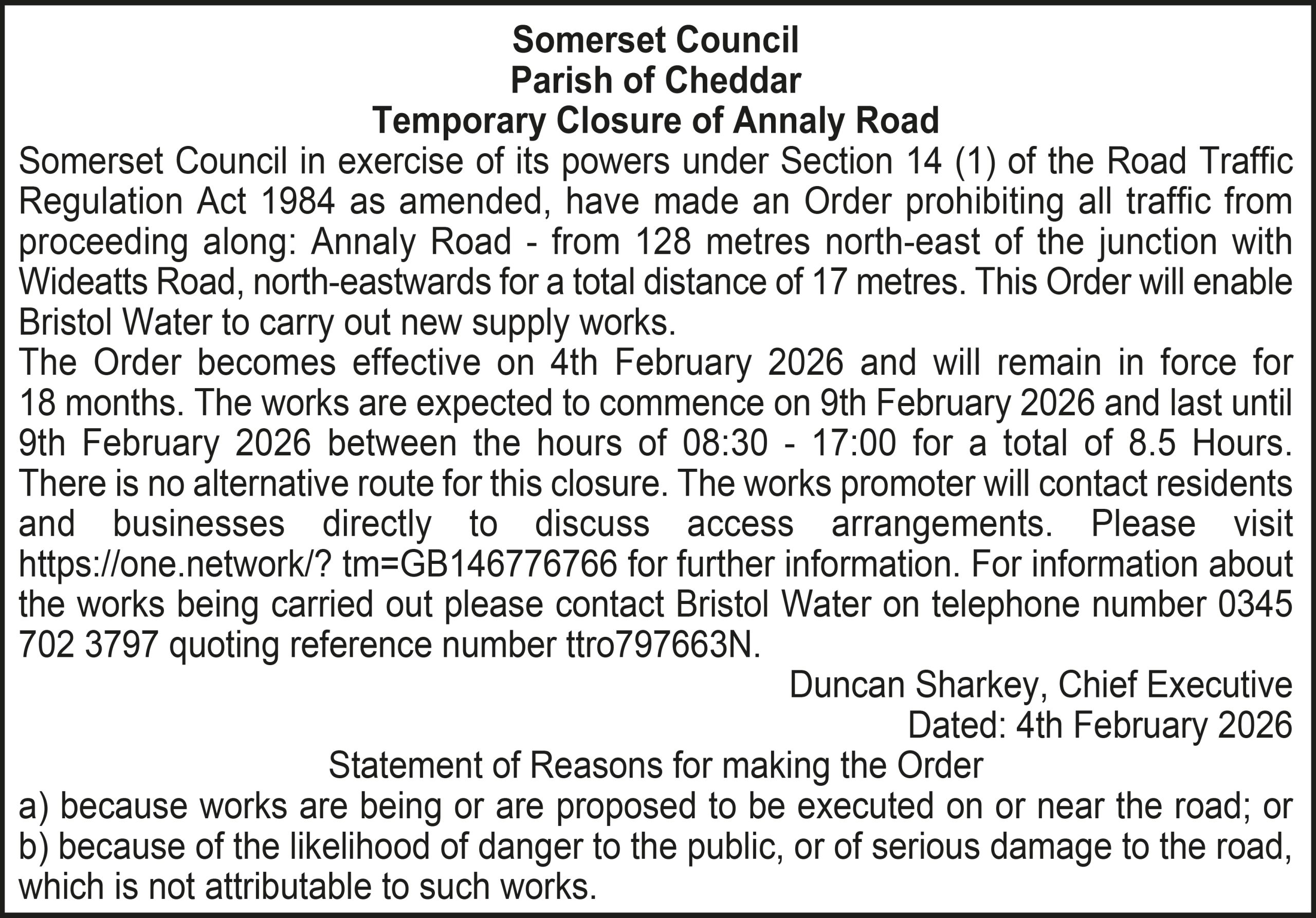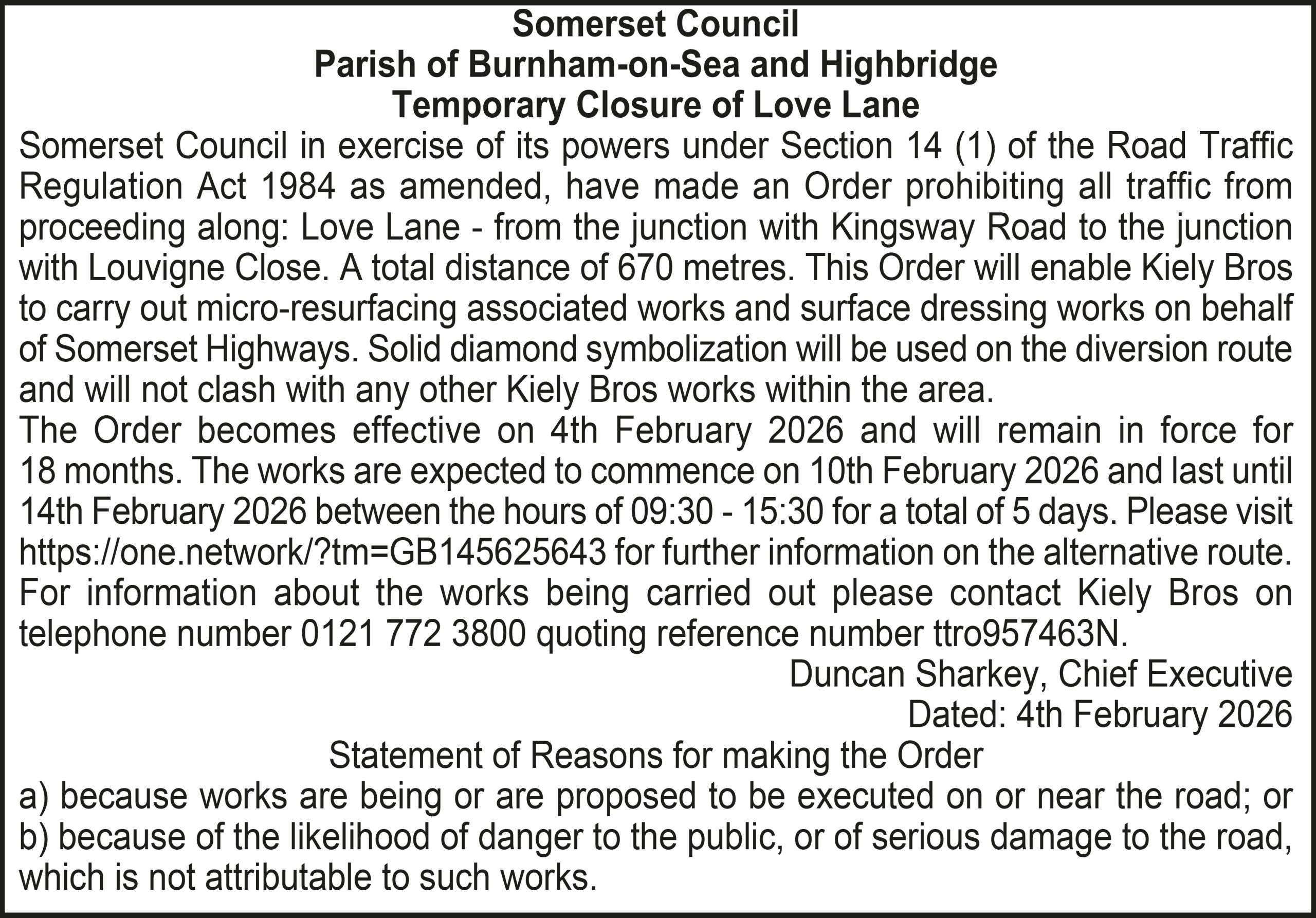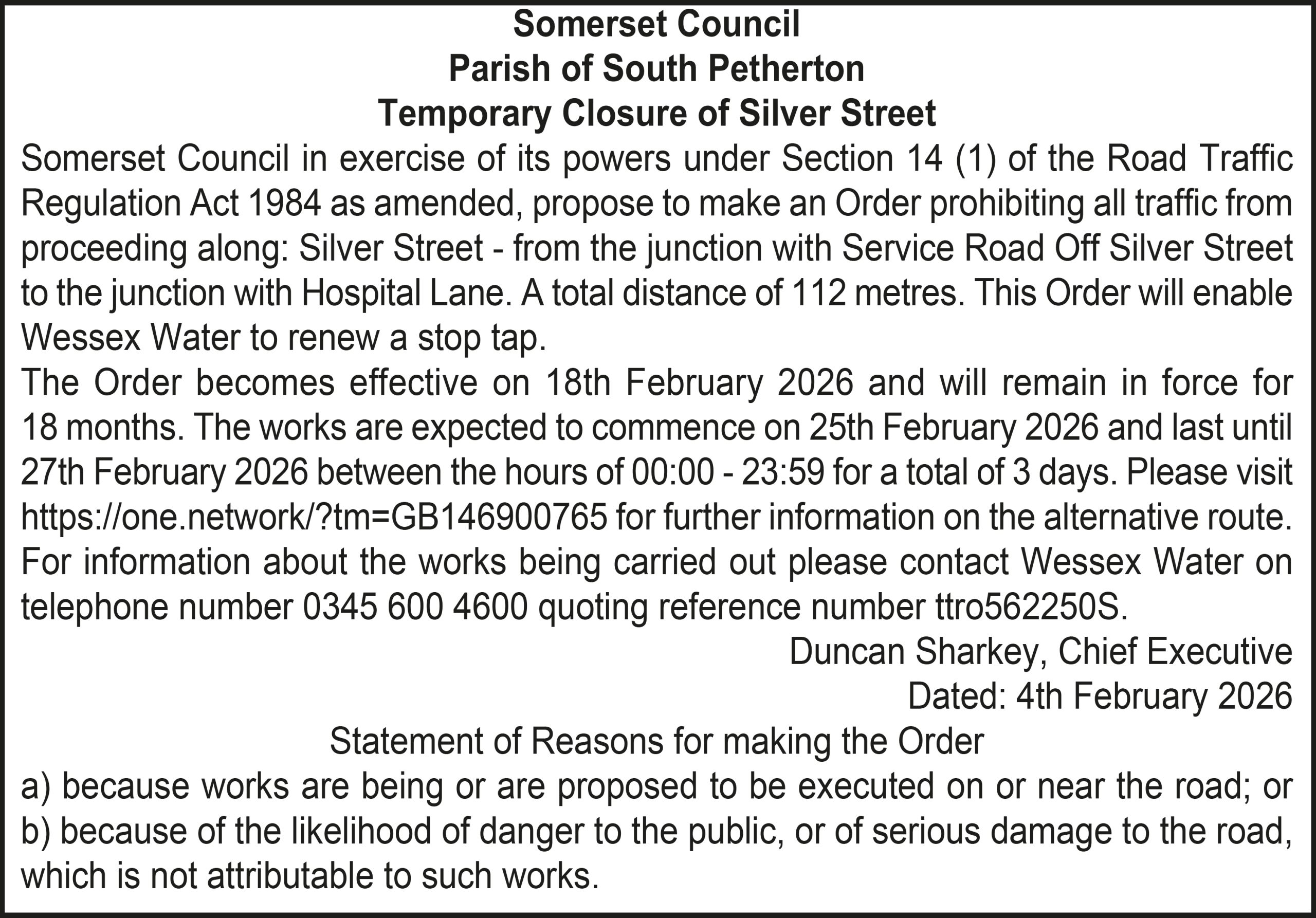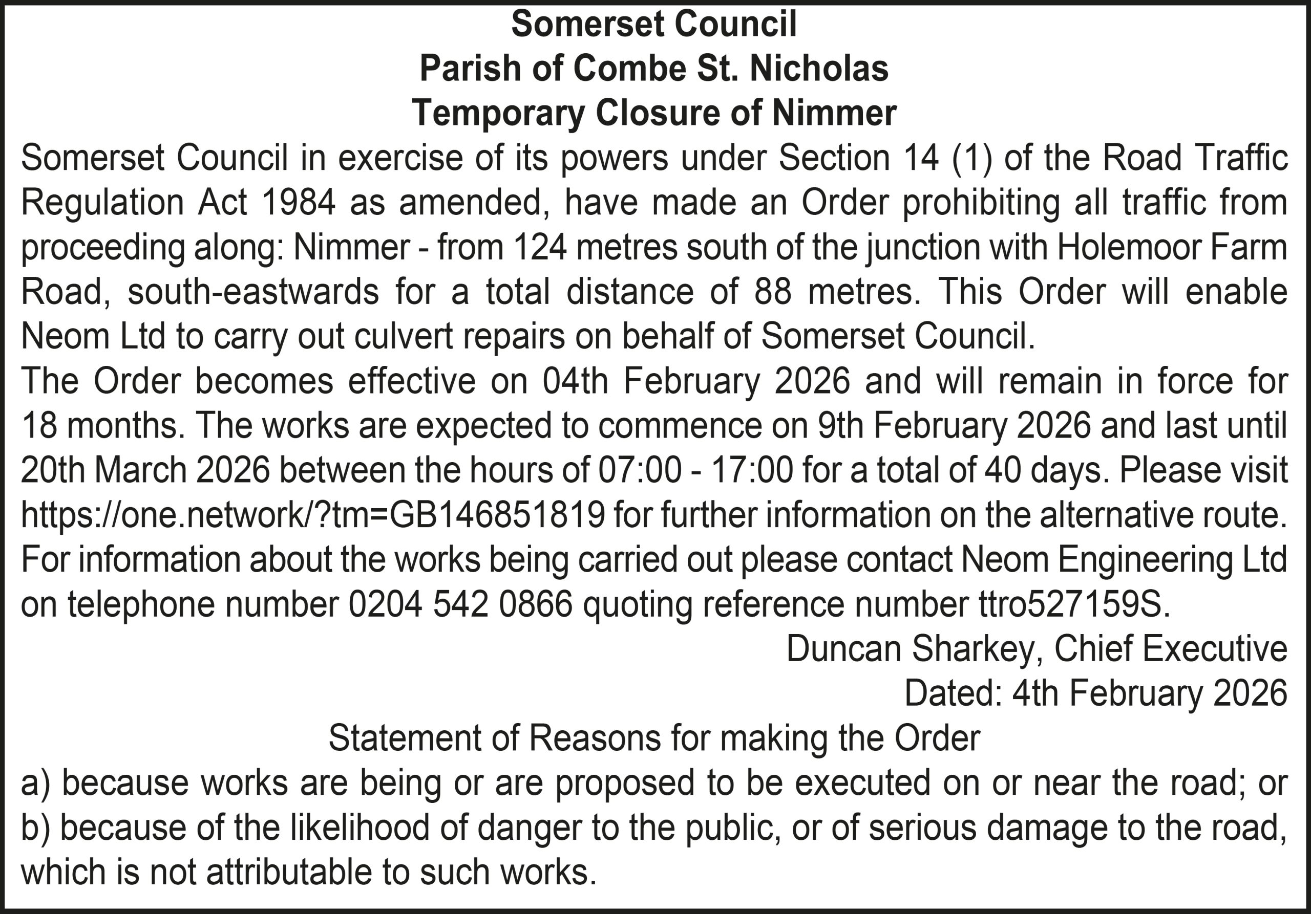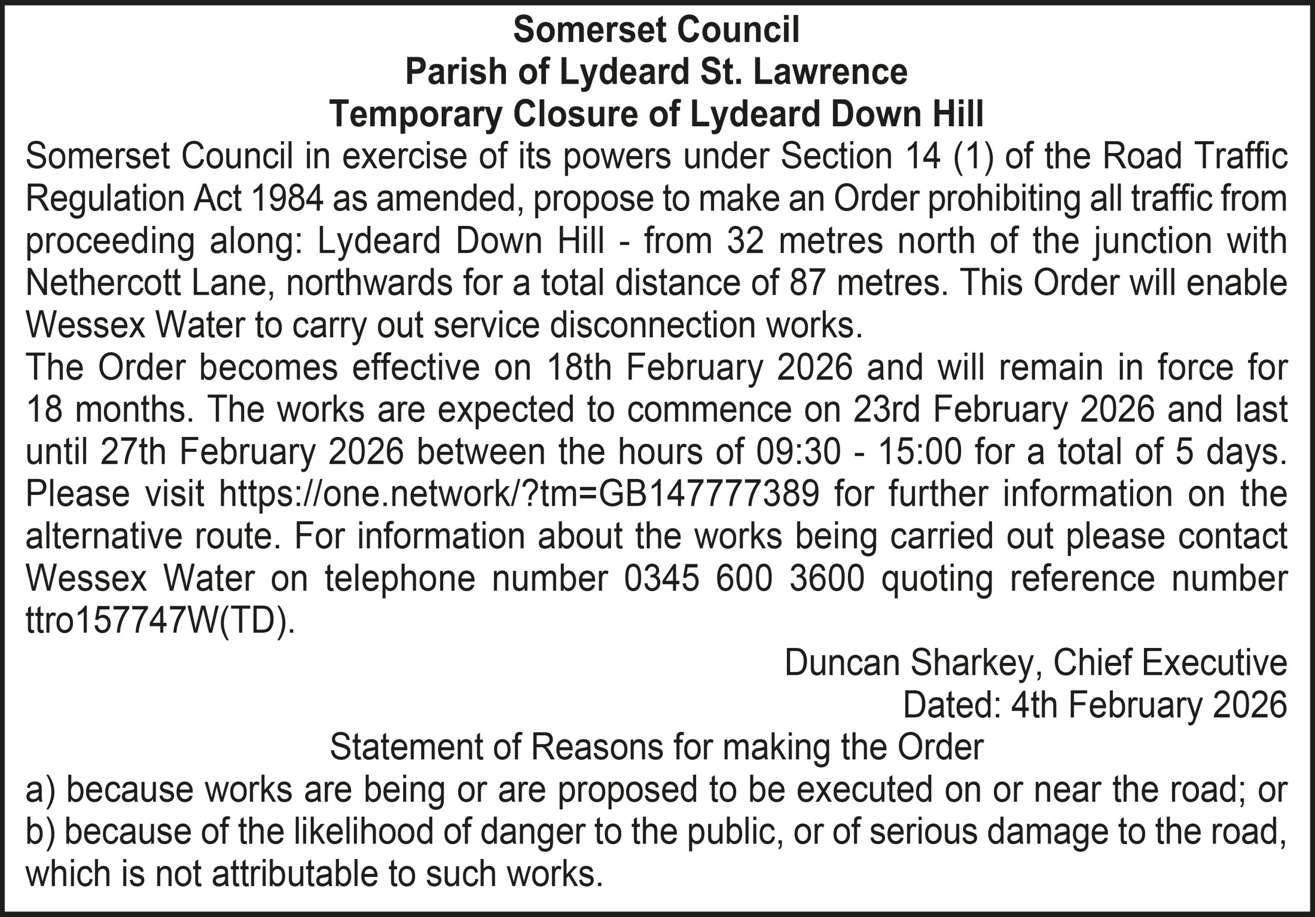 The Order becomes effective on 18th February 2026 and will remain in force for 18 months. The works are expected to commence on 23rd February 2026 and last until 20th March 2026 between the hours of 00:00 – 23:59 for a total of 26 days. Please visit https://one.network/?tm=GB147074211 for further information on the alternative route. For information about the works being carried out please contact Somerset Highways on telephone number 0300 123 2224 quoting reference number ttro153140N.
